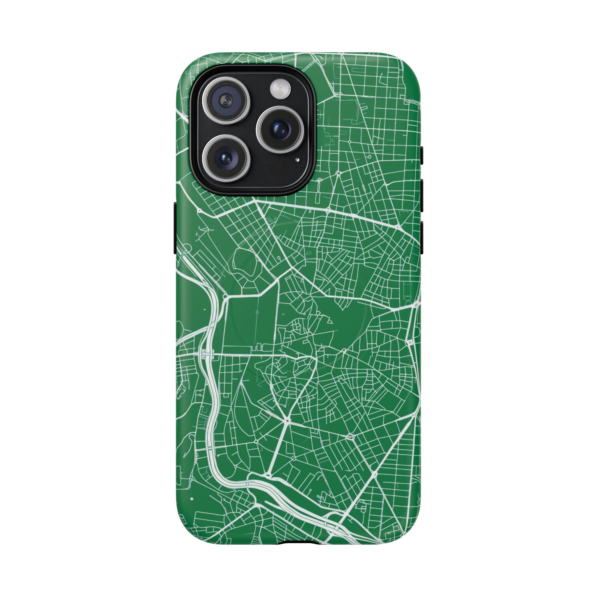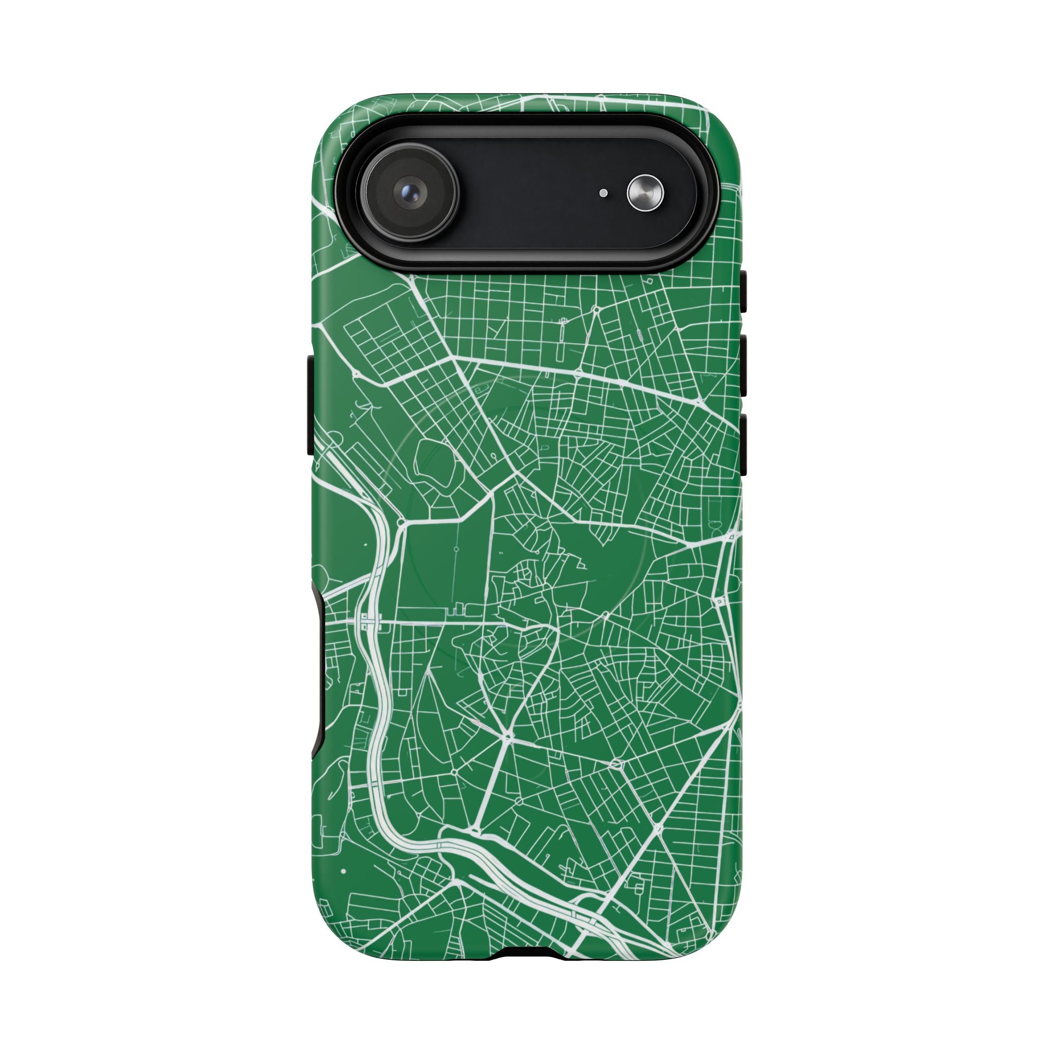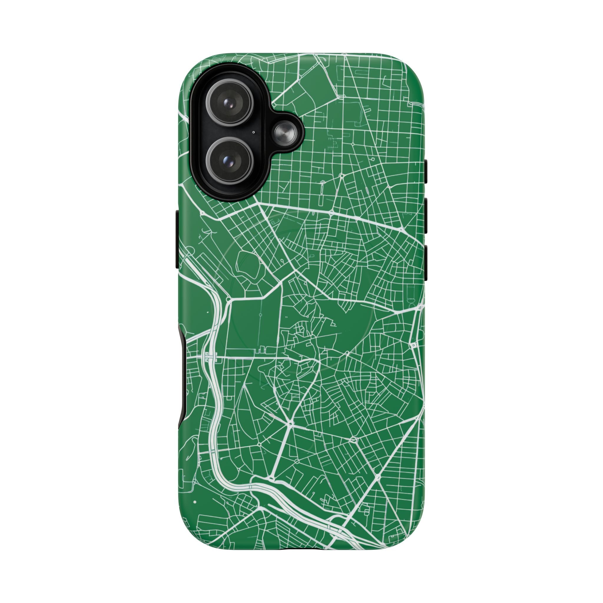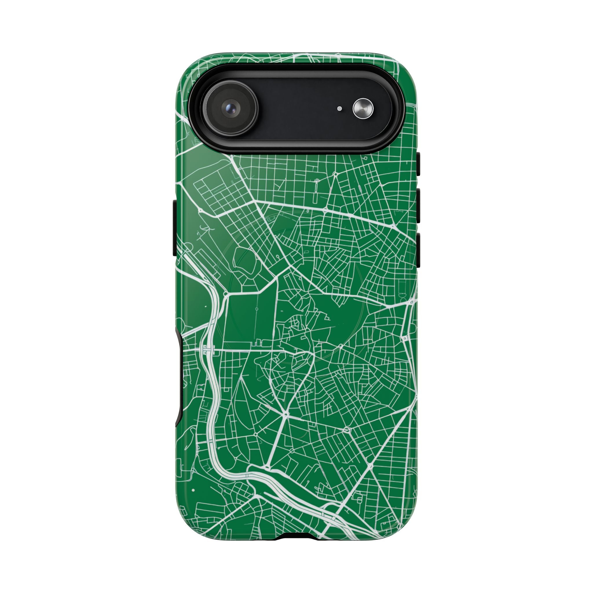 An embedded magnetic ring supports MagSafe® compatibility, allowing effortless attachment of chargers and magnetic accessories. Available in matte or glossy premium finishes, the Madrid Street Map Phone Case – Green Edition combines dependable protection with a classic, city-driven aesthetic designed for everyday carry.