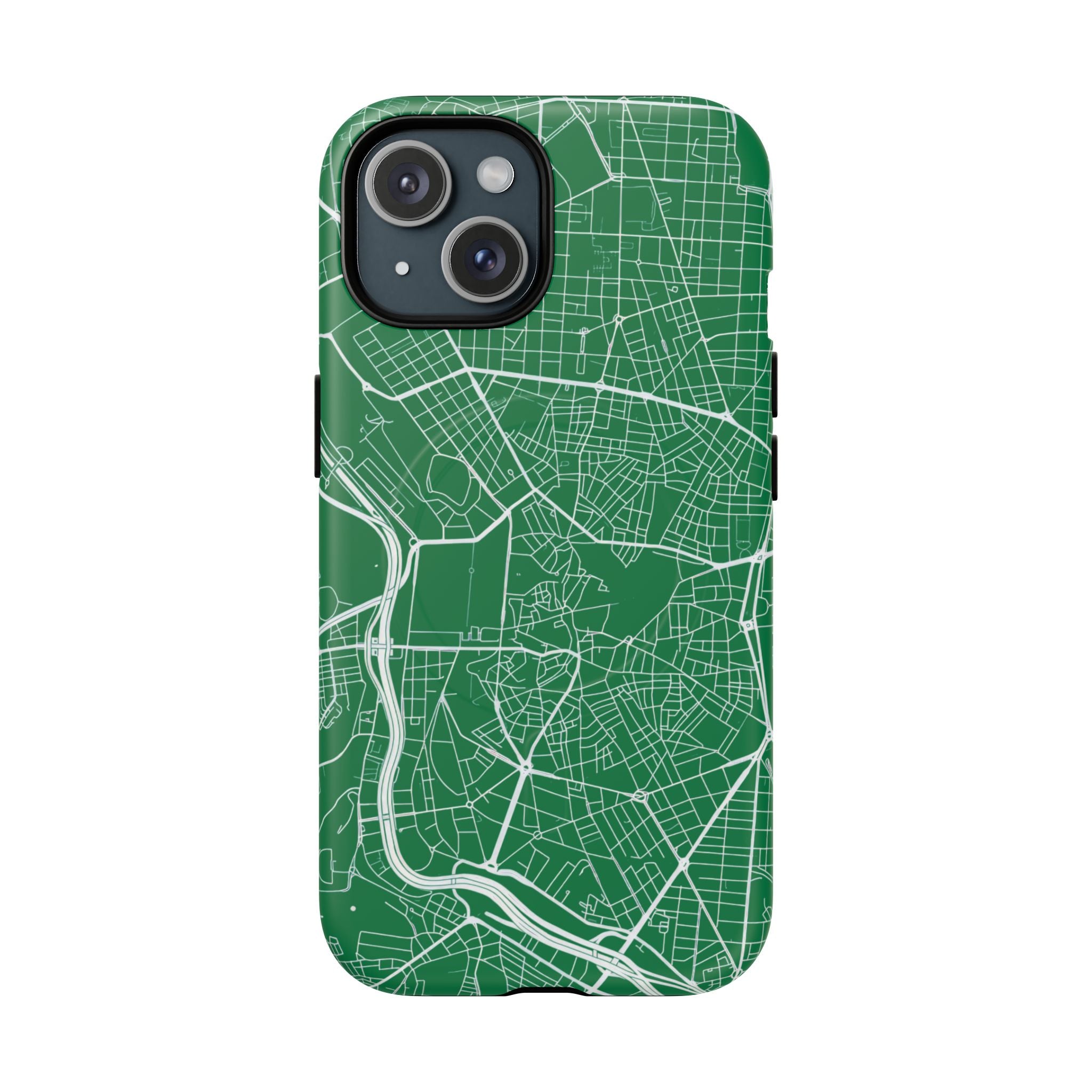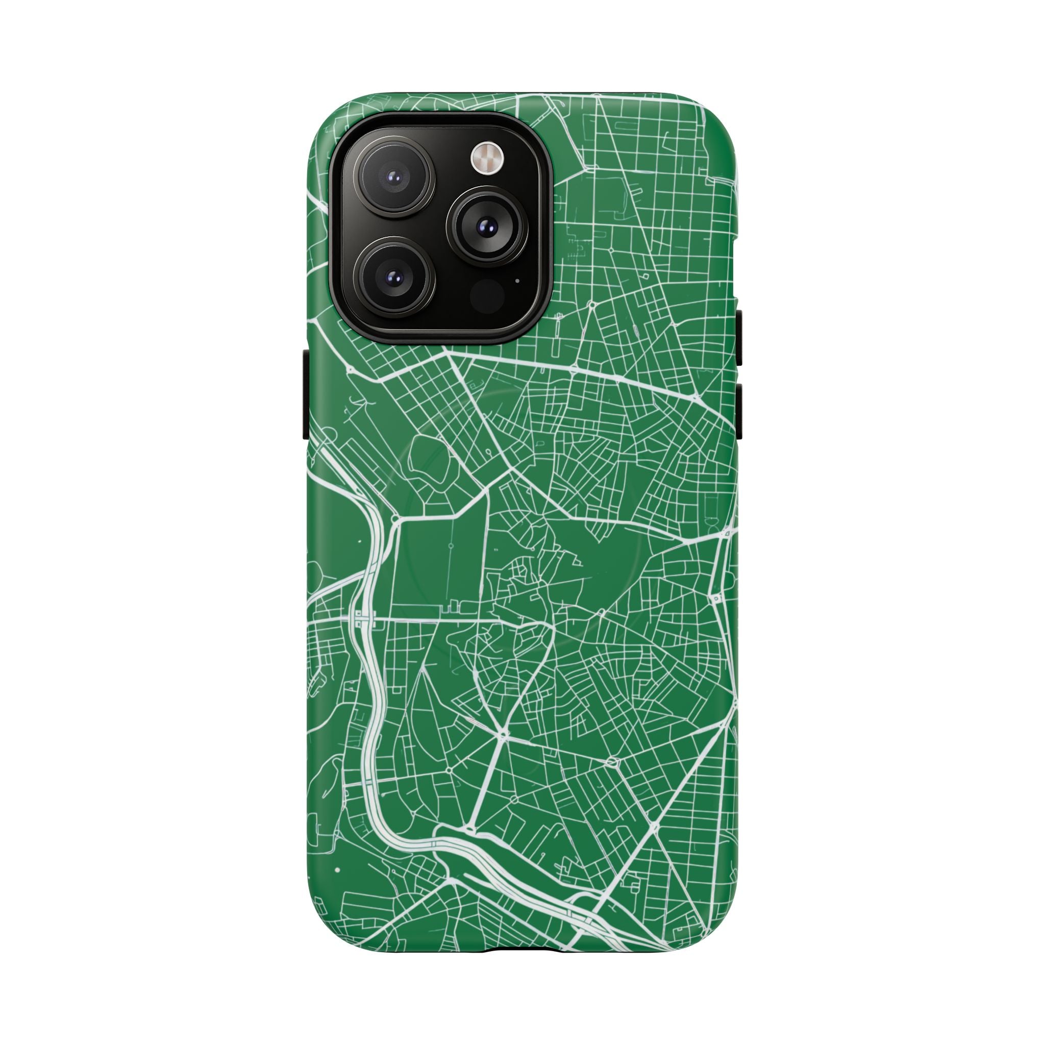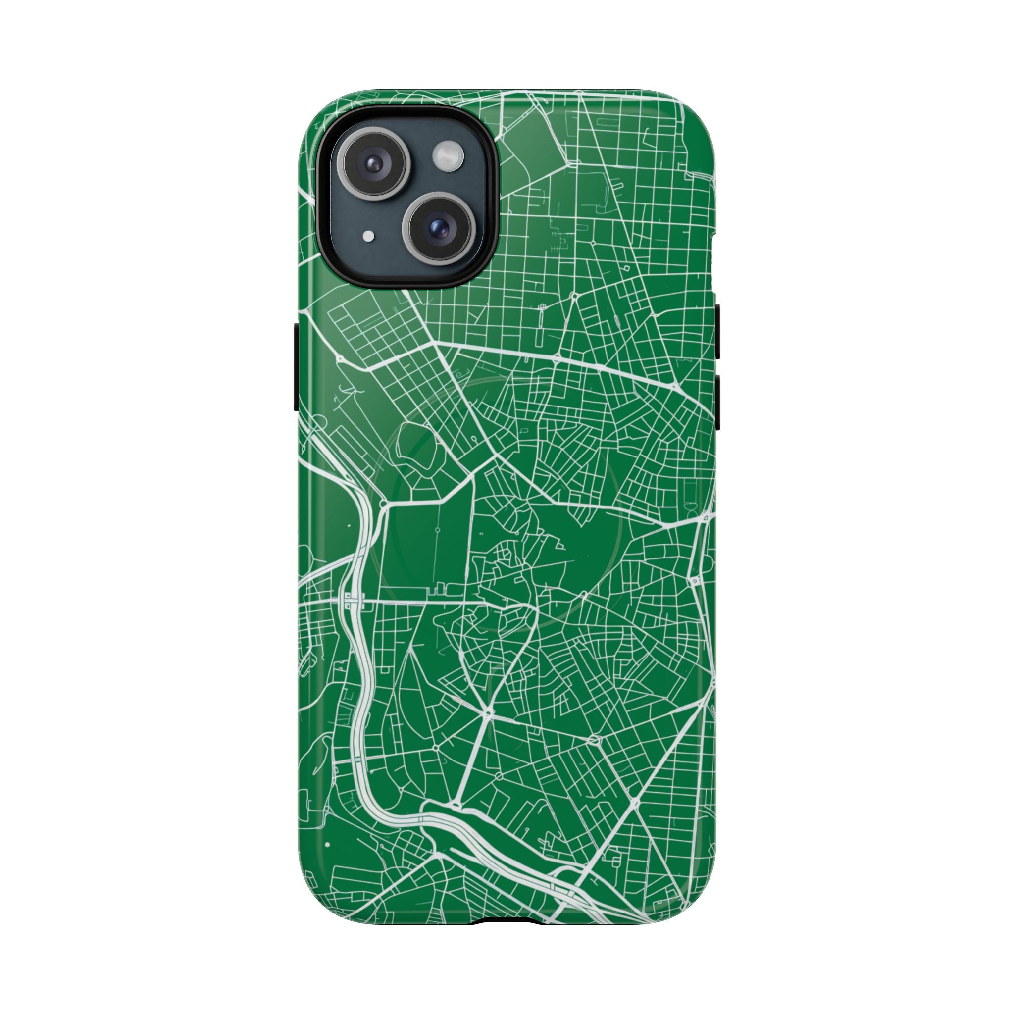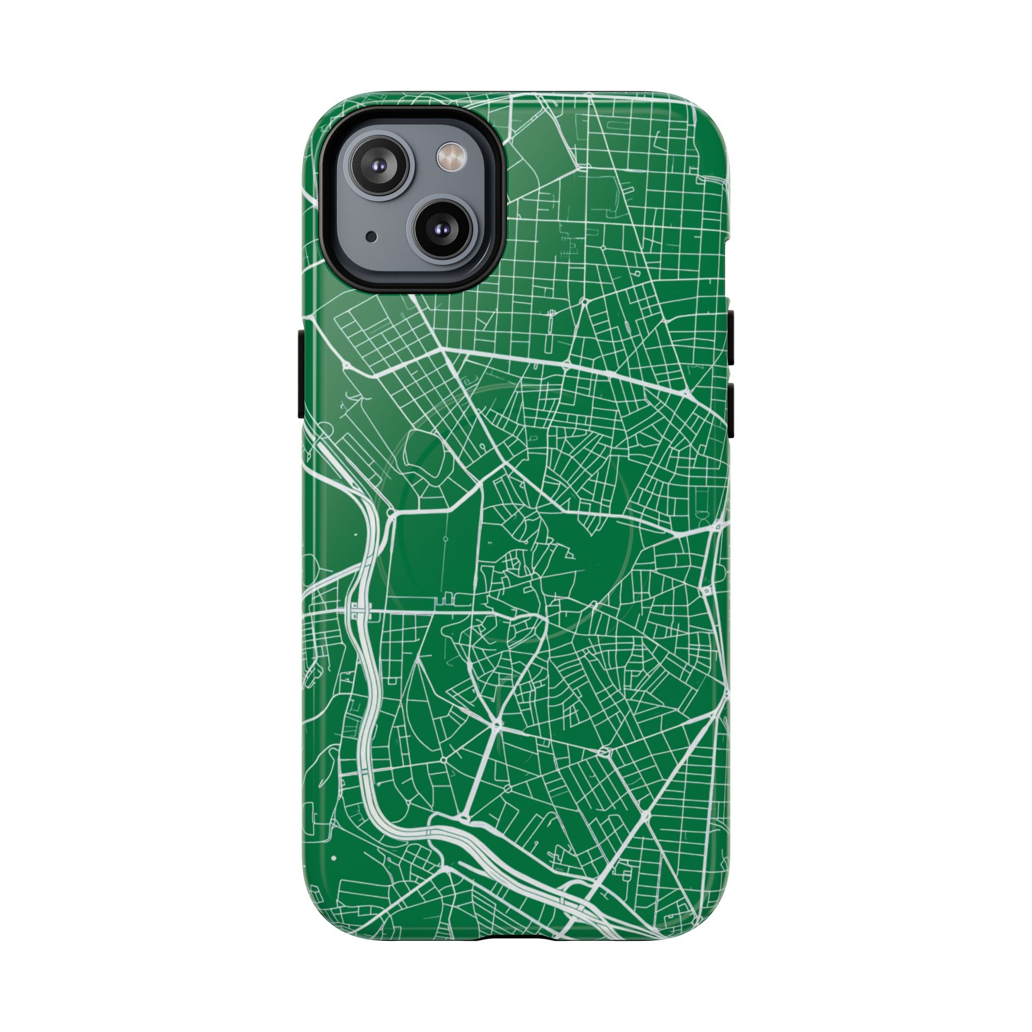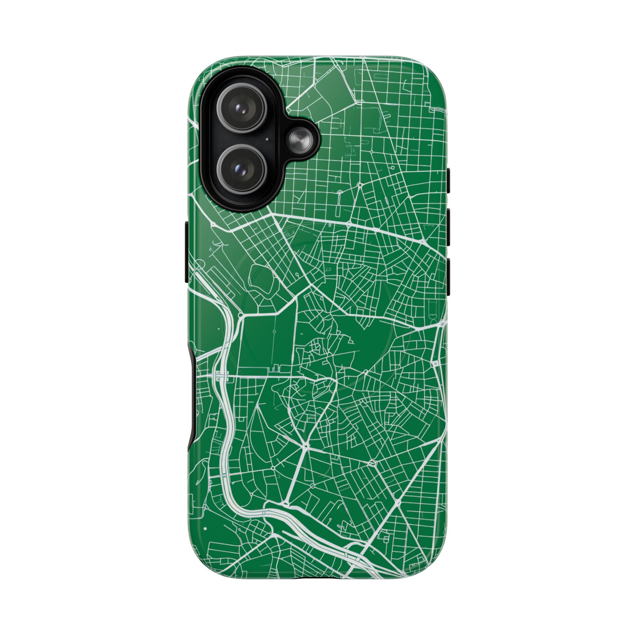 An embedded magnetic ring supports MagSafe® compatibility, allowing effortless attachment of chargers and magnetic accessories. Available in matte or glossy premium finishes, the Madrid Street Map Phone Case – Green Edition combines dependable protection with a classic, city-driven aesthetic designed for everyday carry.