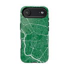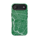 The Madrid Street Map Phone Case – Green Edition transforms Spain’s capital into a refined, heritage-inspired graphic statement. Set against a rich green backdrop, crisp white street lines trace Madrid’s dense historic core, grand radial avenues, and surrounding ring roads, capturing the structure and rhythm of the city in precise architectural detail.