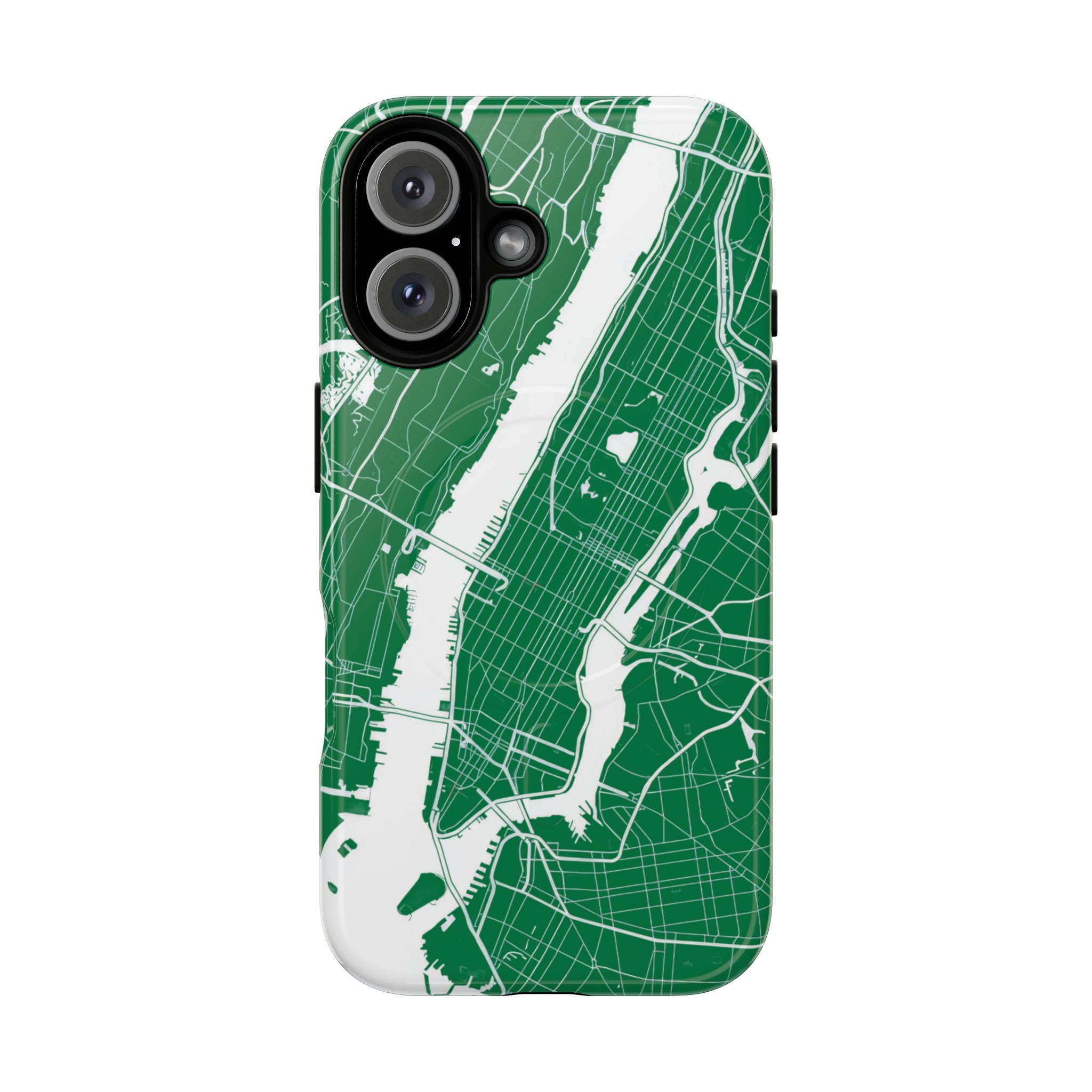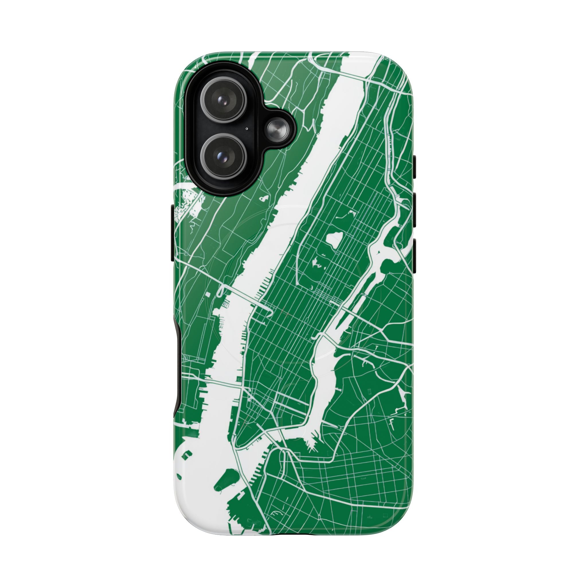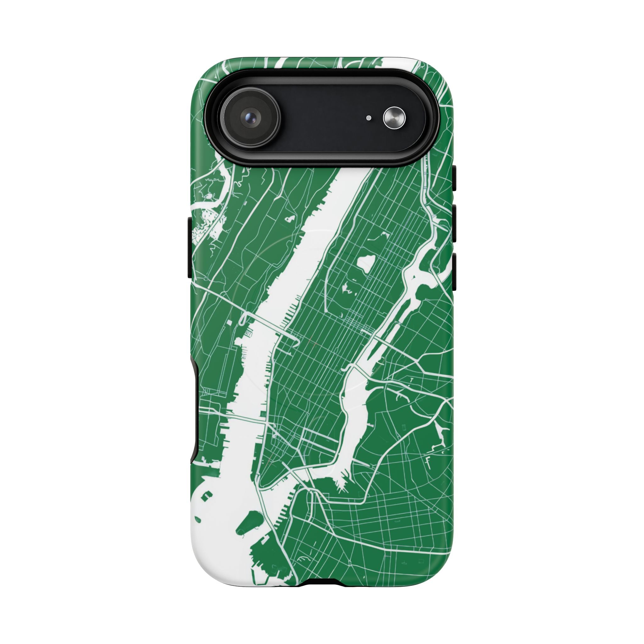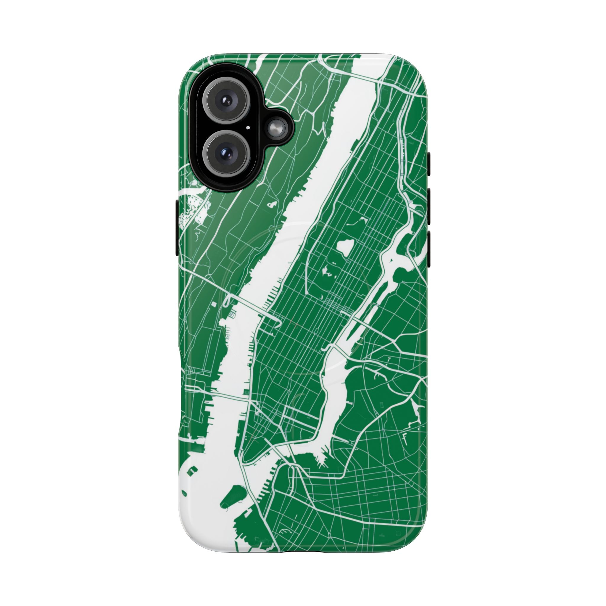An integrated magnetic ring supports MagSafe® compatibility, allowing seamless attachment of chargers and magnetic accessories. Available in either matte or glossy finishes, the New York City Map Phone Case – Green & White Edition pairs reliable protection with a clean, city-driven aesthetic designed for everyday carry.