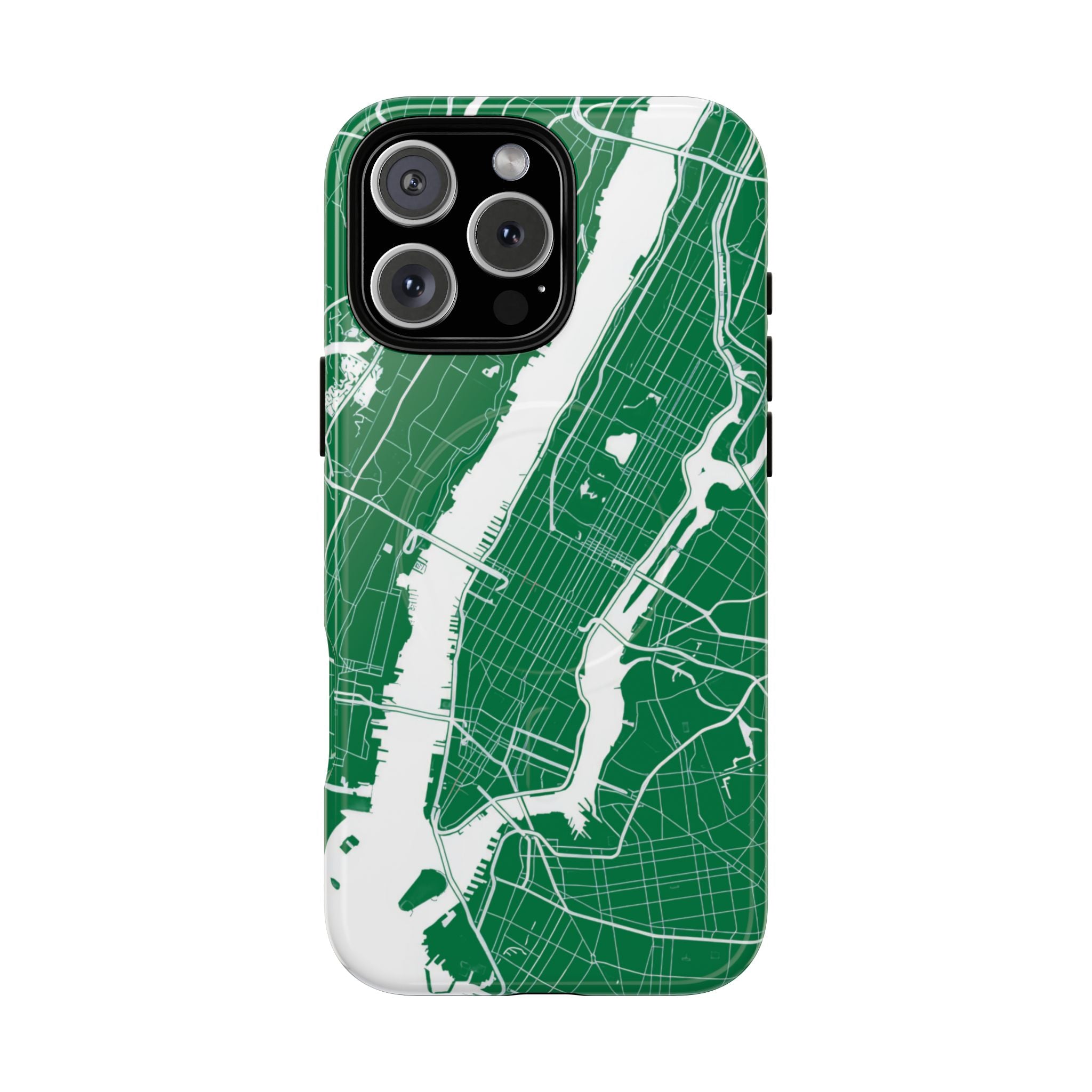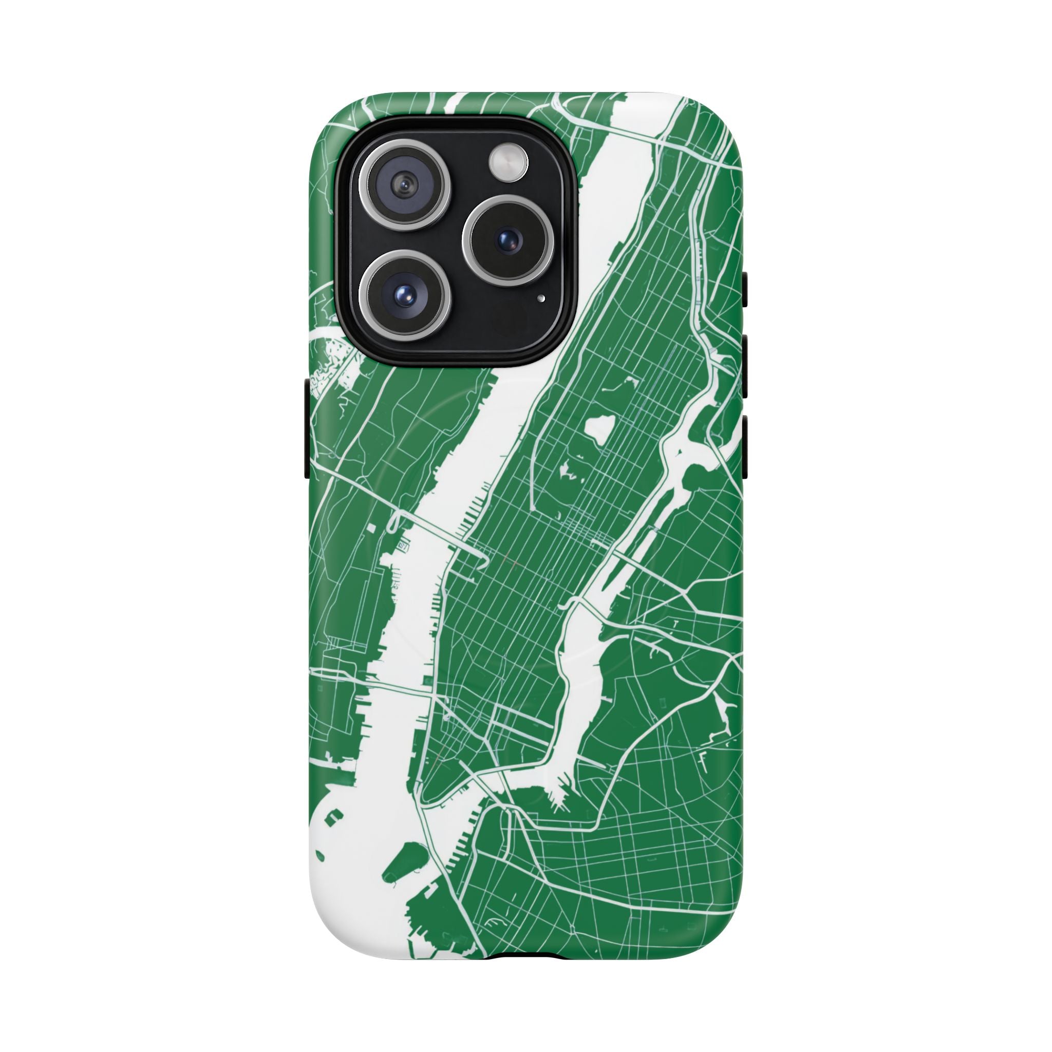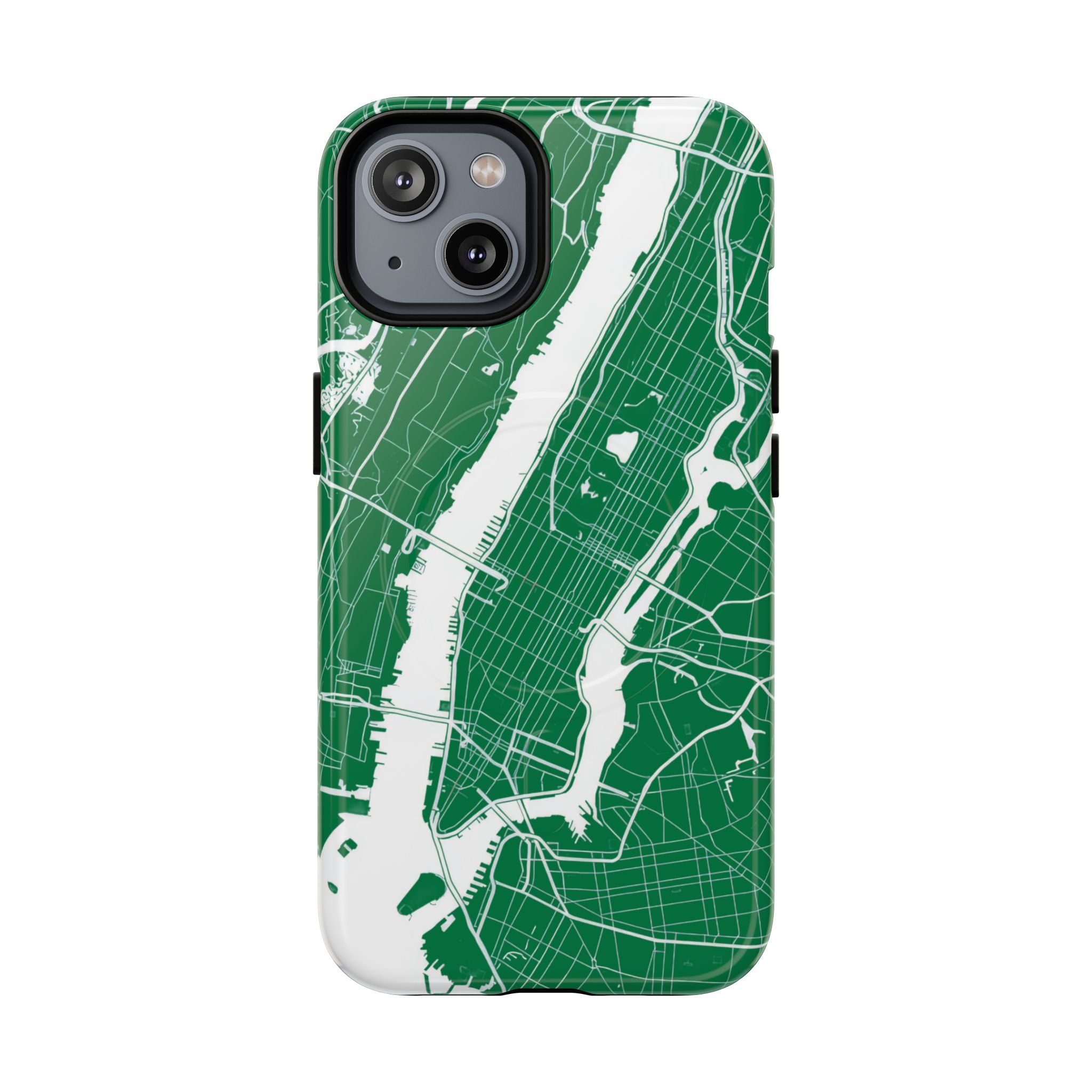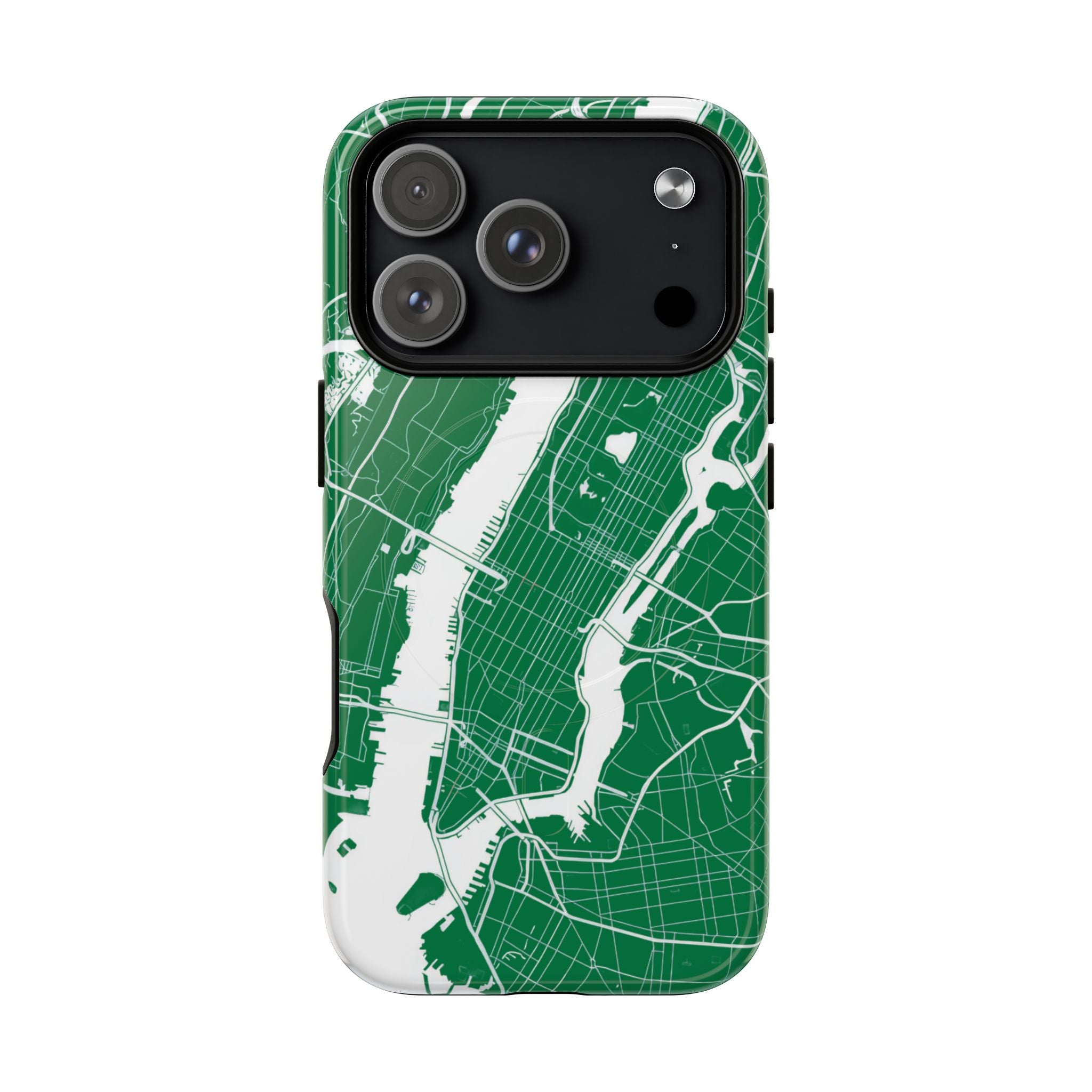 An integrated magnetic ring supports MagSafe® compatibility, allowing seamless attachment of chargers and magnetic accessories. Available in either matte or glossy finishes, the New York City Map Phone Case – Green & White Edition pairs reliable protection with a clean, city-driven aesthetic designed for everyday carry.