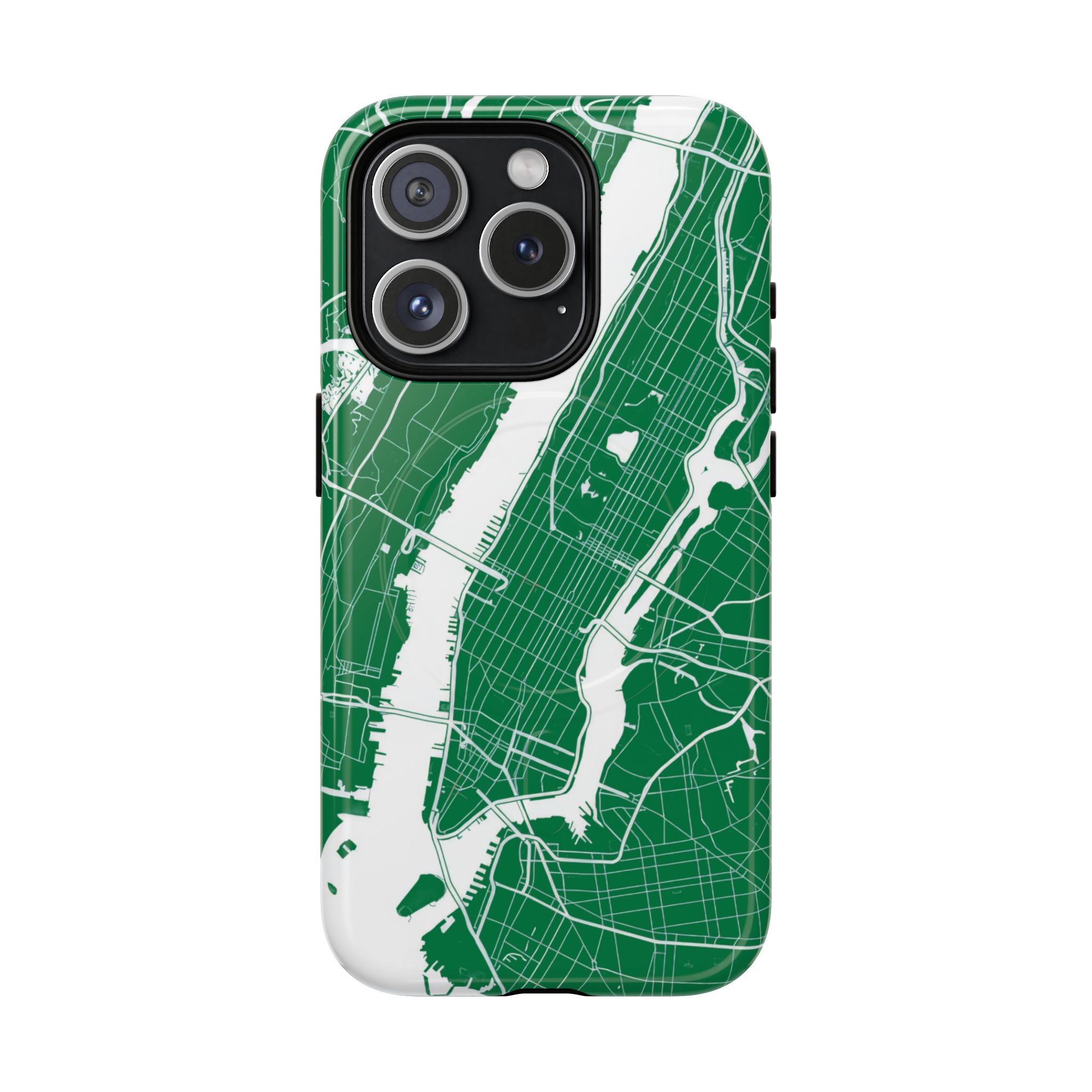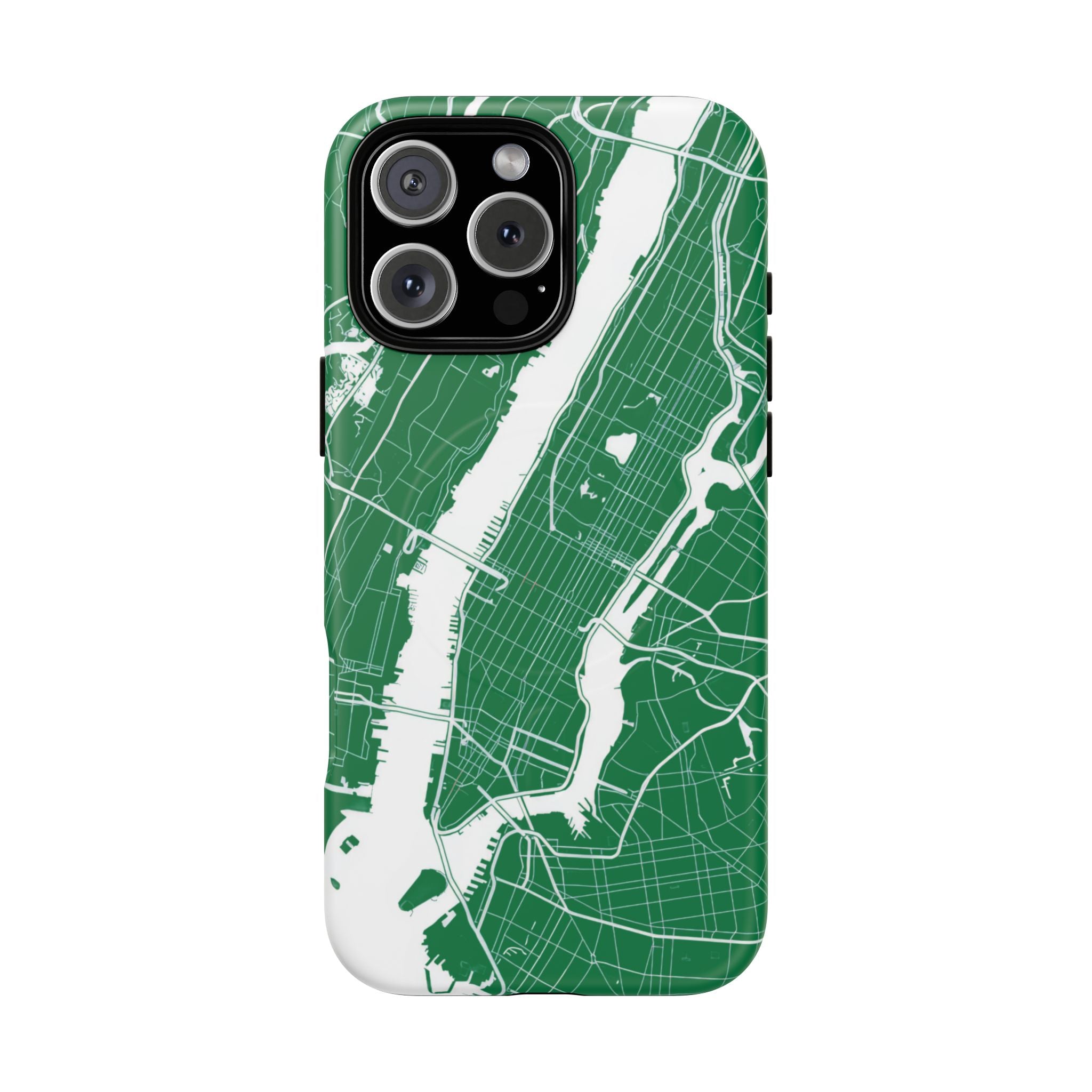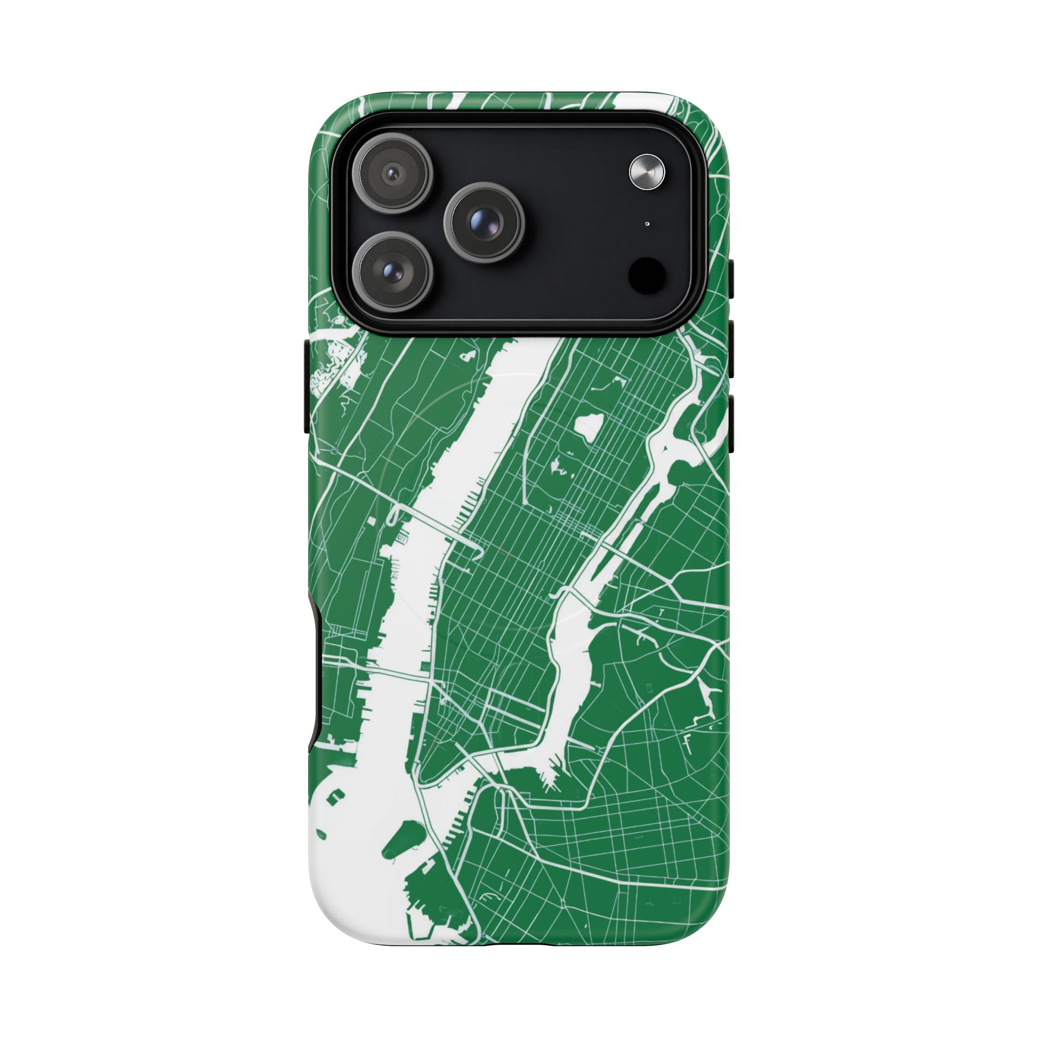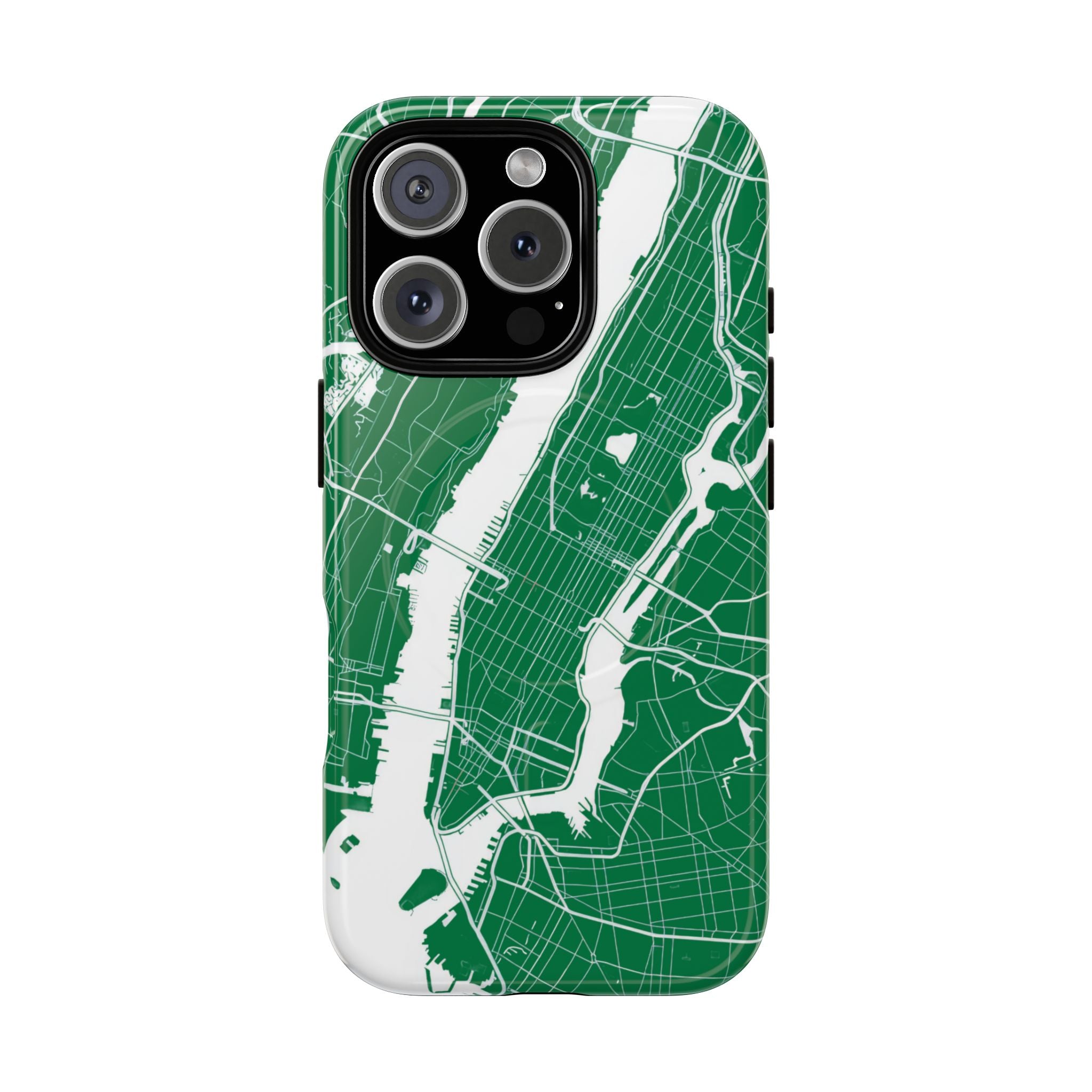 An integrated magnetic ring supports MagSafe® compatibility, allowing seamless attachment of chargers and magnetic accessories. Available in either matte or glossy finishes, the New York City Map Phone Case – Green & White Edition pairs reliable protection with a clean, city-driven aesthetic designed for everyday carry.