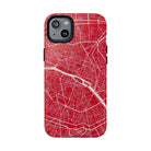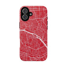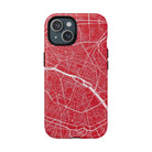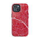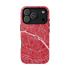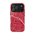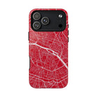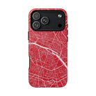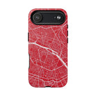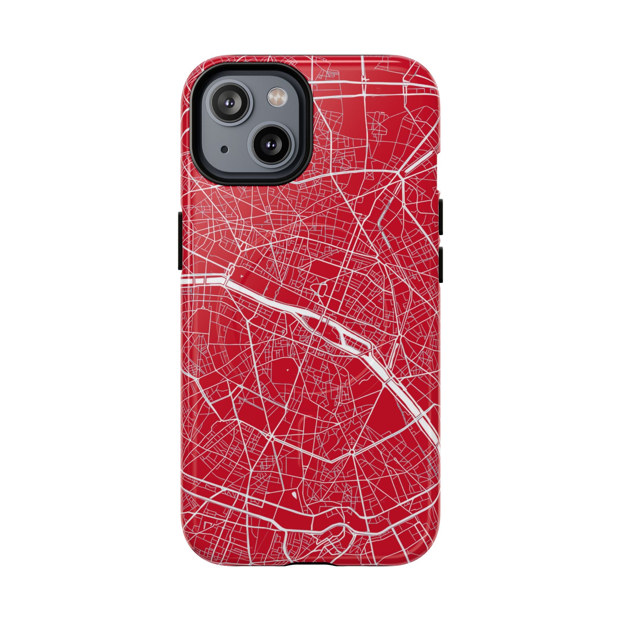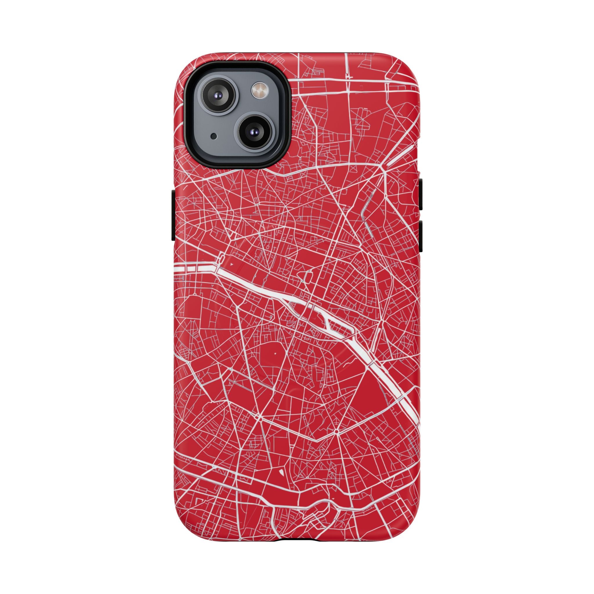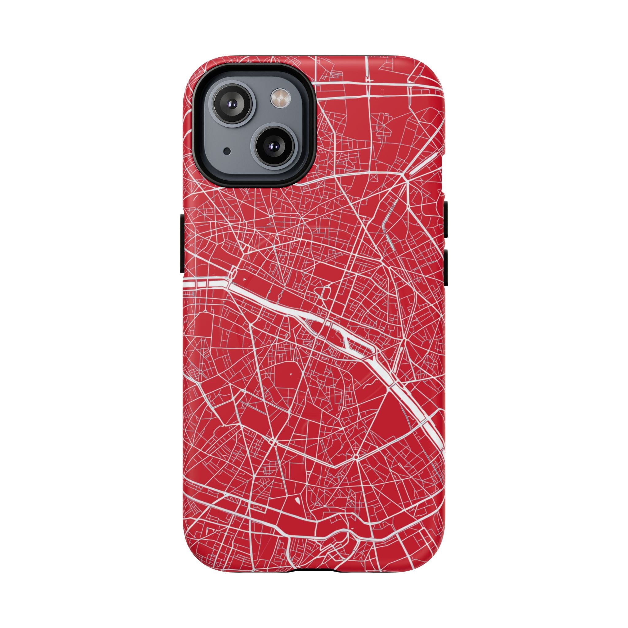 The Paris Street Map Phone Case – Red edition transforms the city’s iconic layout into a bold, high-contrast statement. Set against a vivid red backdrop, crisp white linework traces Paris’s intricate street grid, historic boulevards, and the sweeping curve of the Seine as it cuts through the heart of the capital.