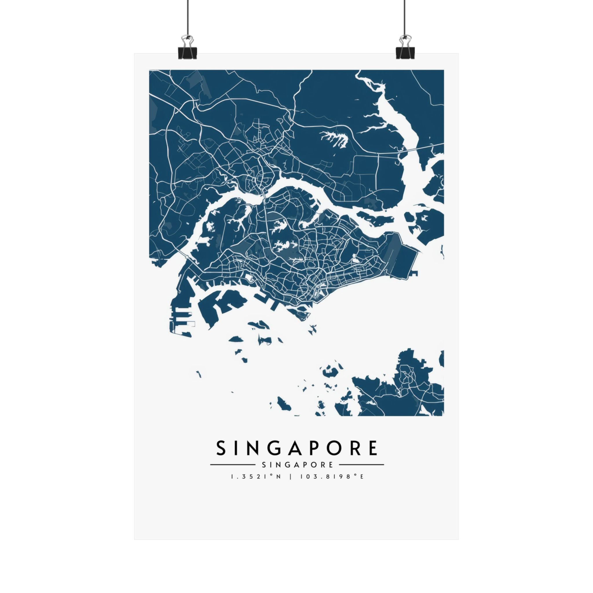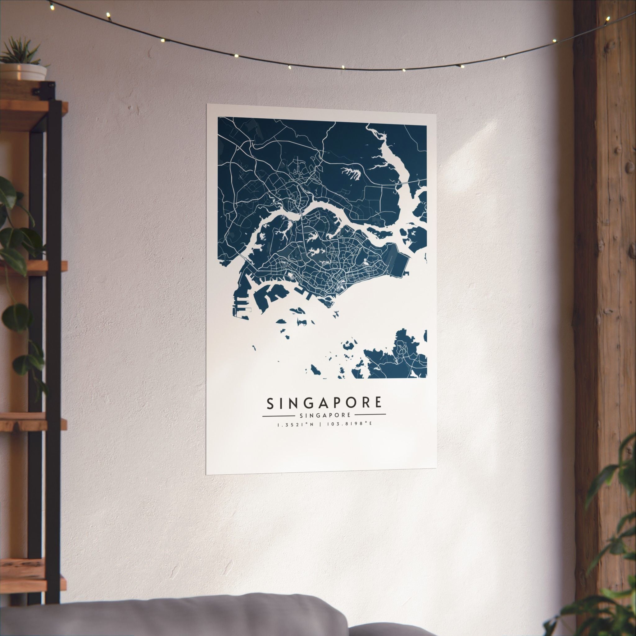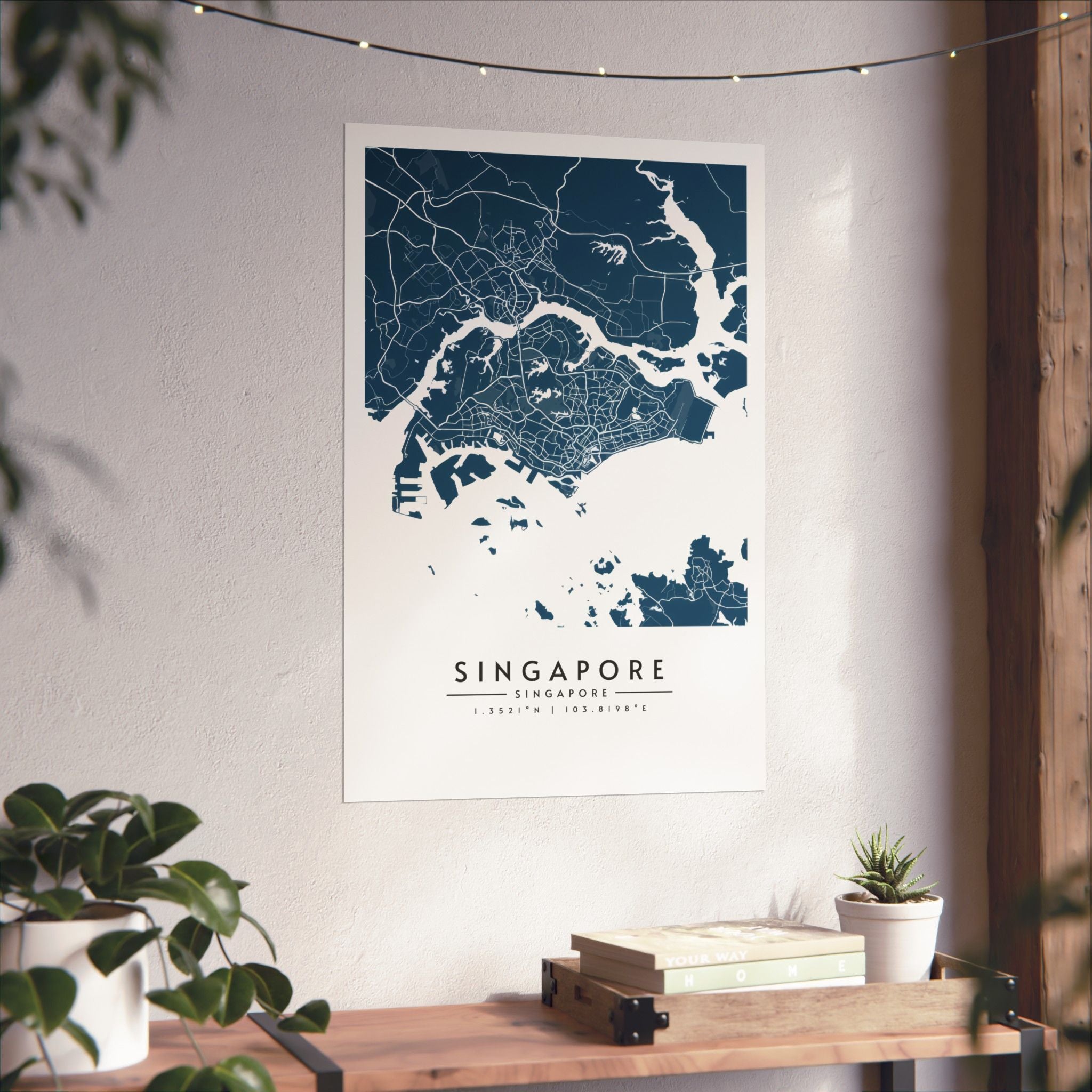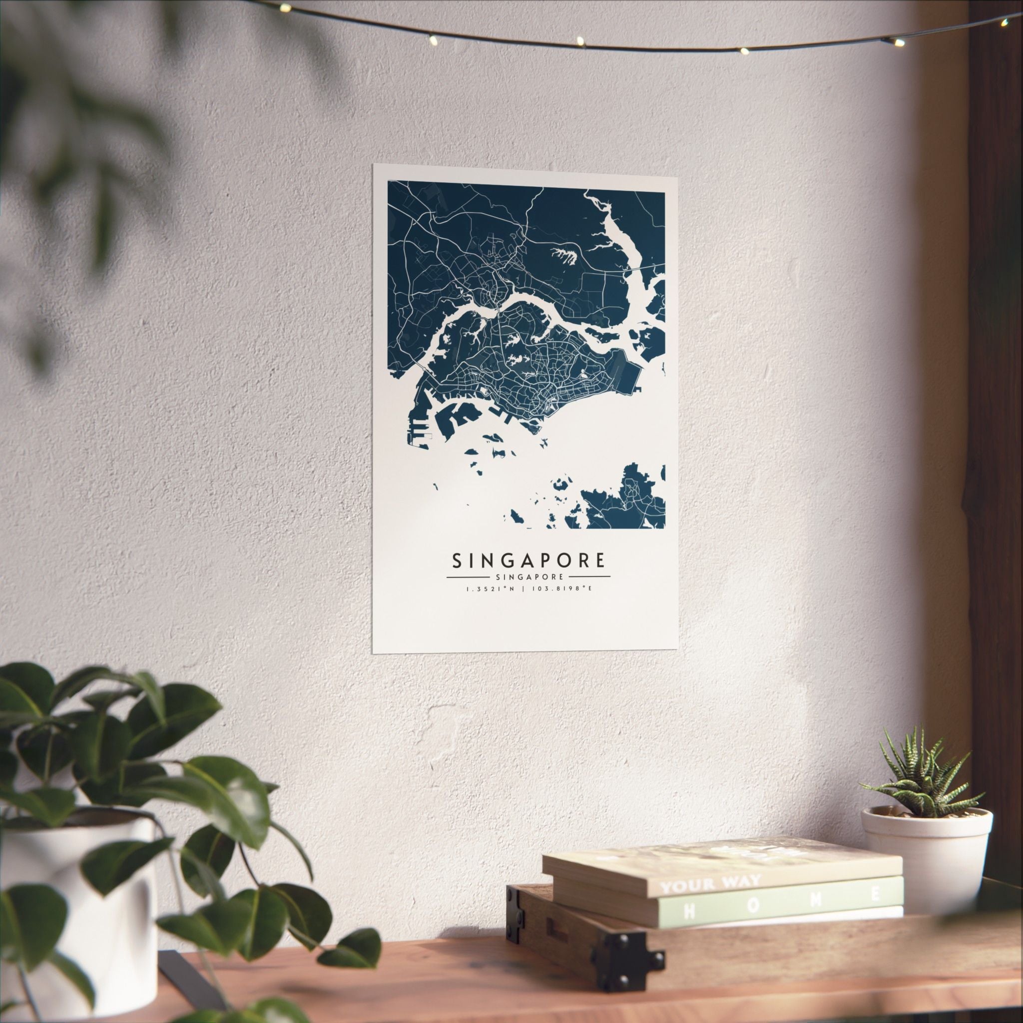 A matte Singapore map print designed to bring a clean, contemporary edge to any interior. This Singapore City Map Poster features a detailed street and coastline layout of the island nation, shown in deep navy tones that highlight the shape of the island and its surrounding waters. The matte surface keeps reflections low and preserves crisp linework, giving the artwork a calm, modern finish suited for living rooms, offices, studios, and minimalist spaces.