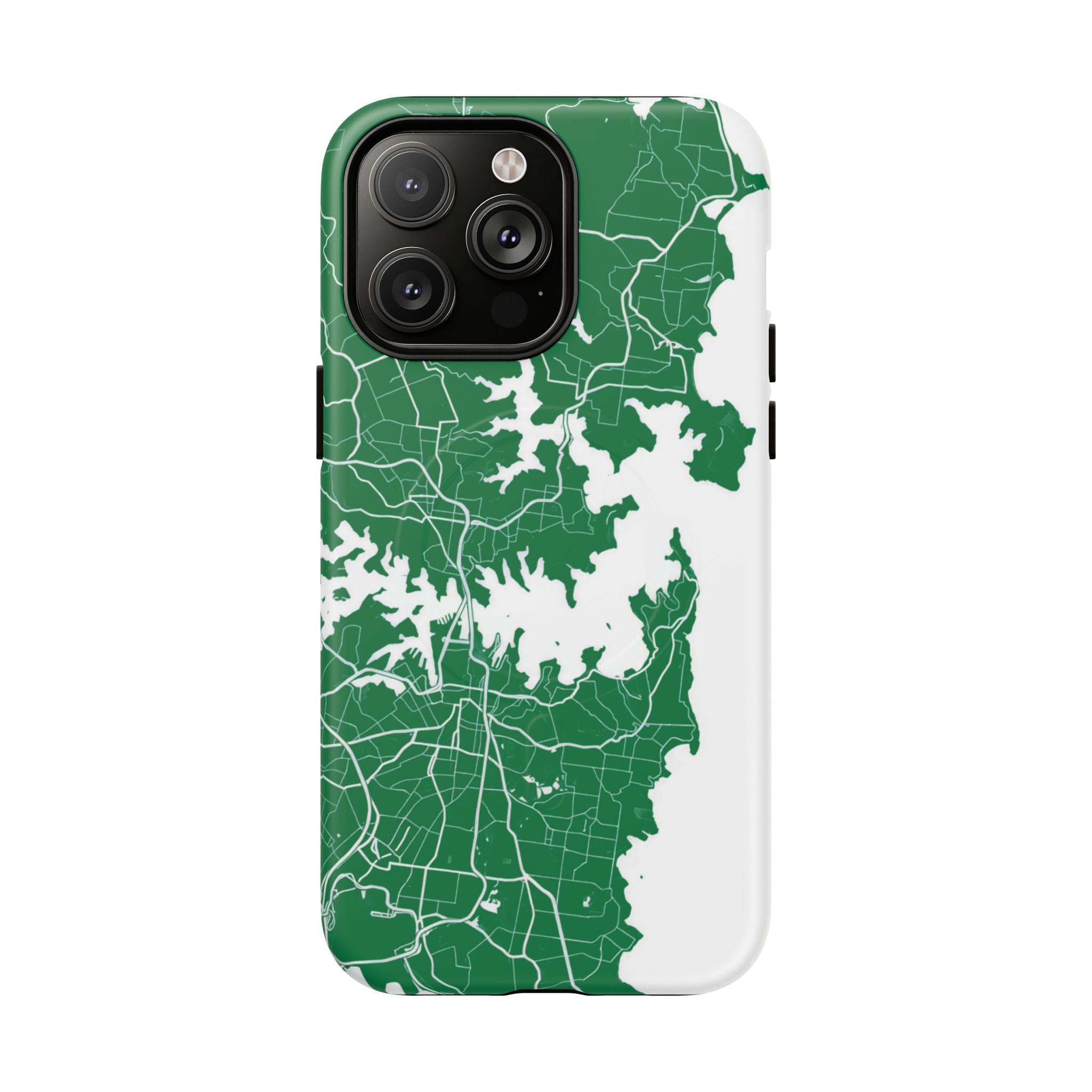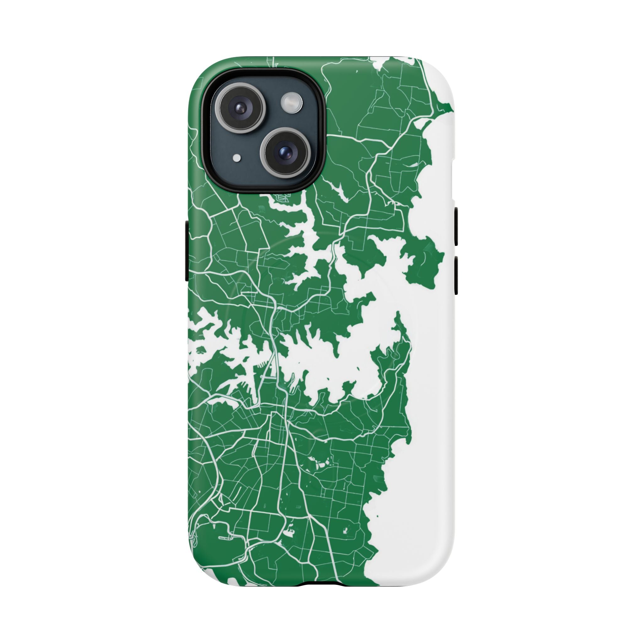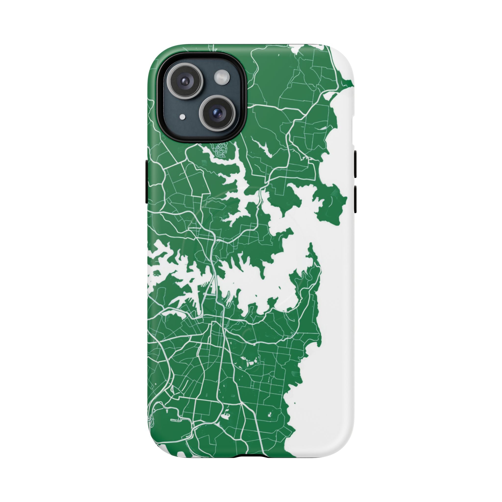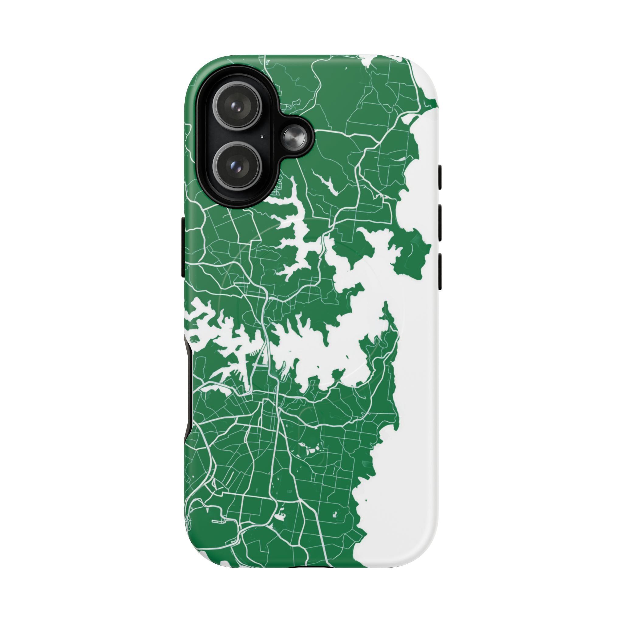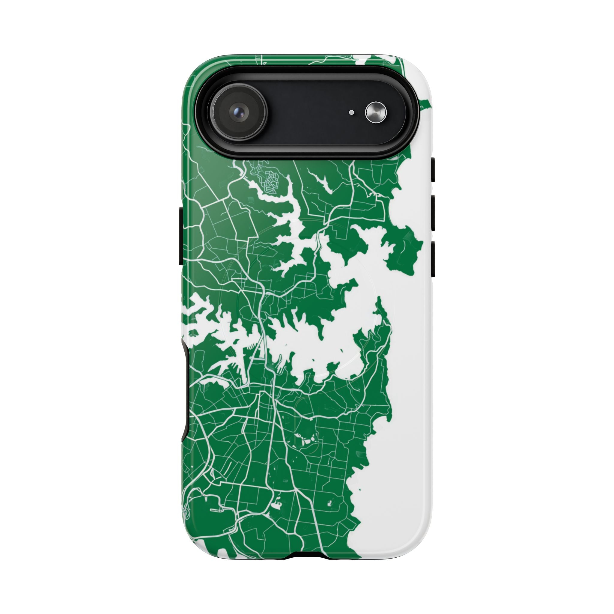 An embedded magnetic ring supports MagSafe® compatibility, allowing effortless attachment of chargers and magnetic accessories. Available in matte or glossy premium finishes, the Sydney Street Map Phone Case – Harbour Edition (Green) blends reliable durability with a refined, city-inspired aesthetic designed for everyday carry.