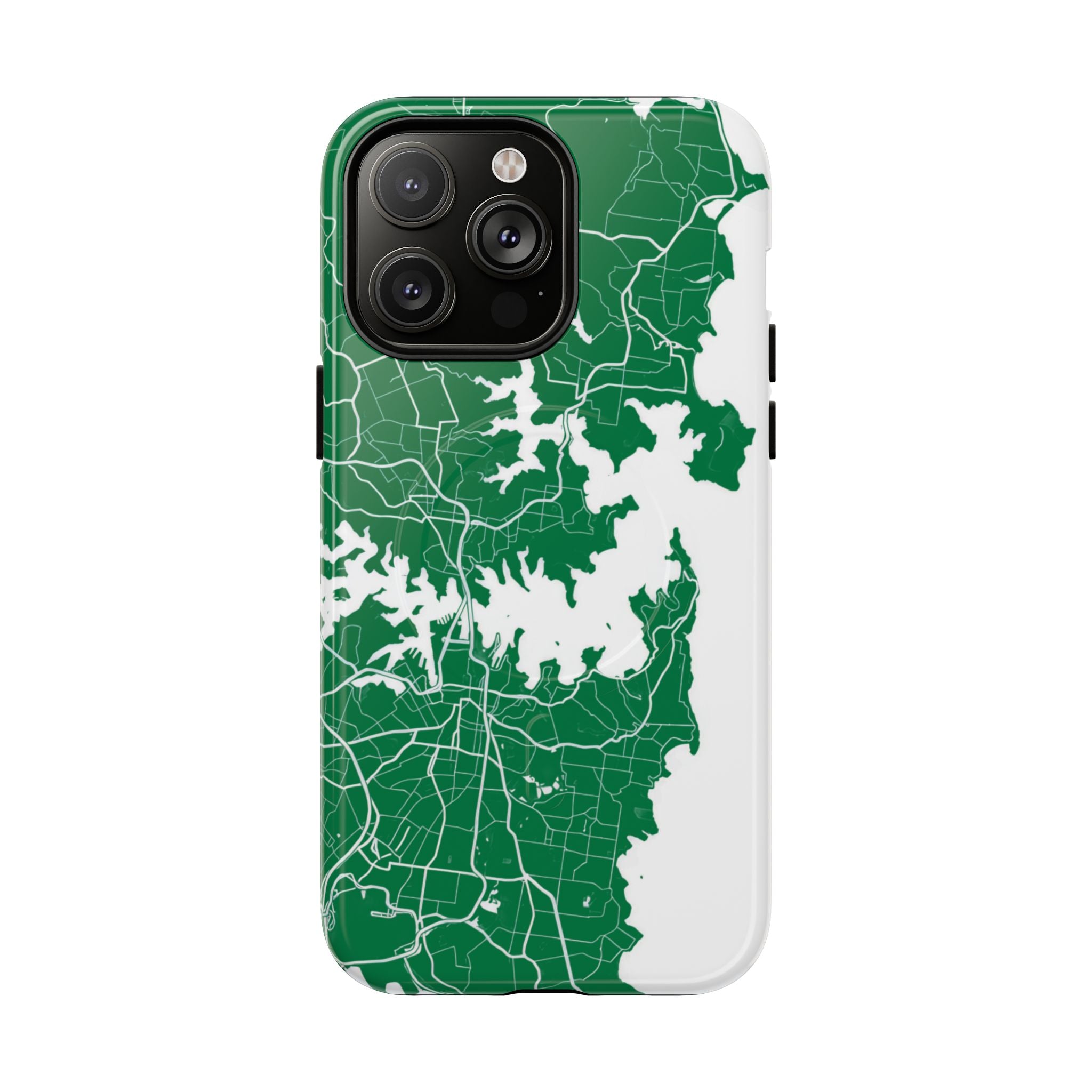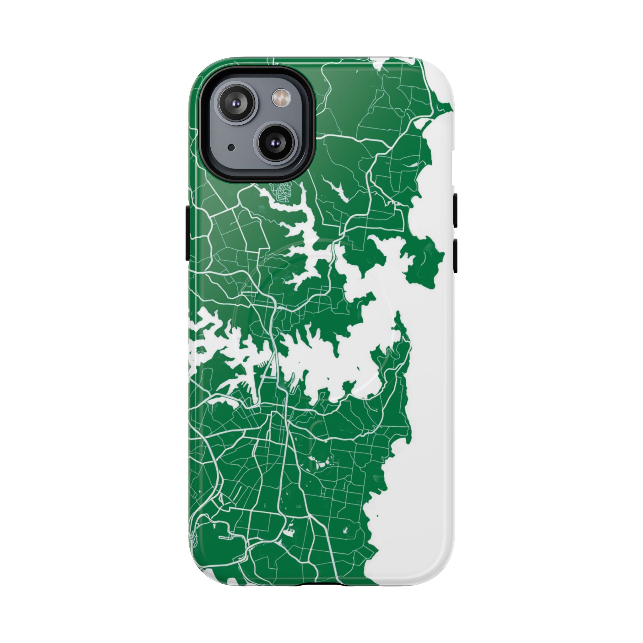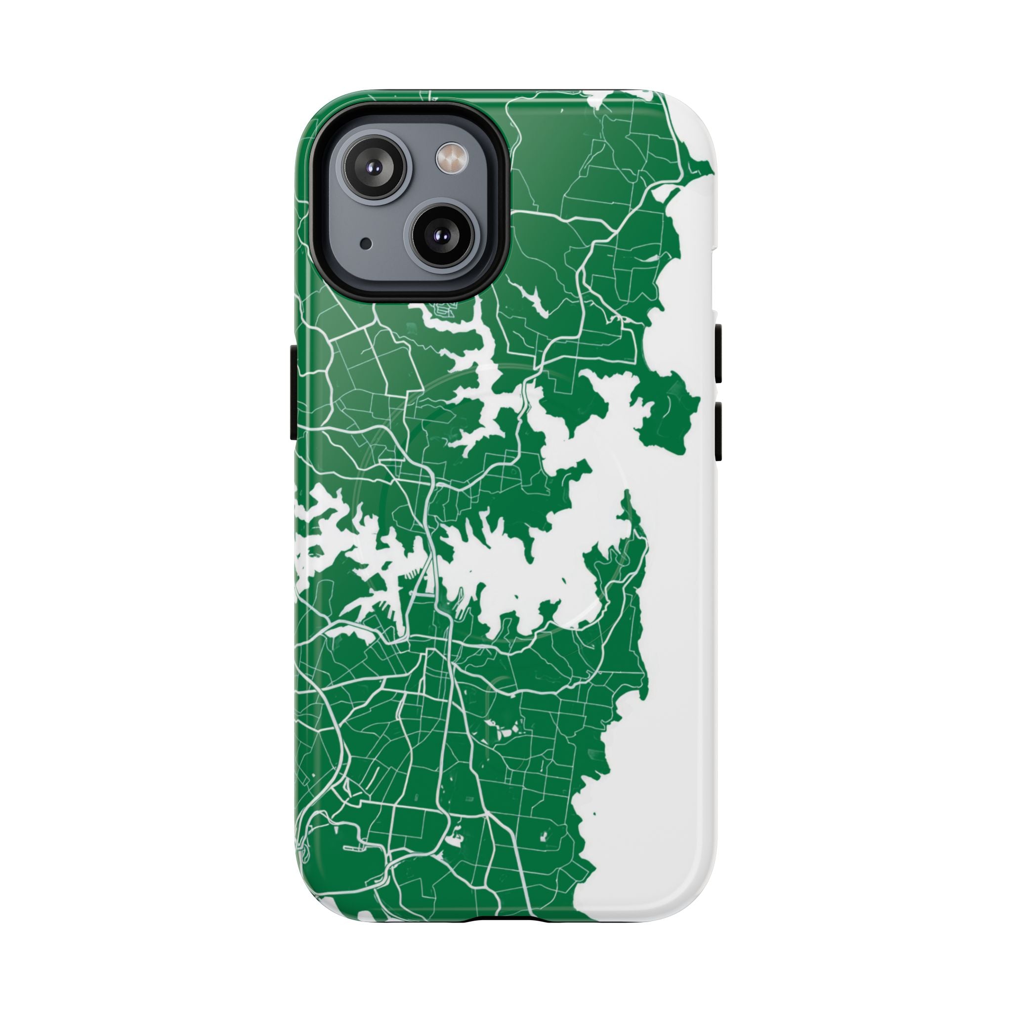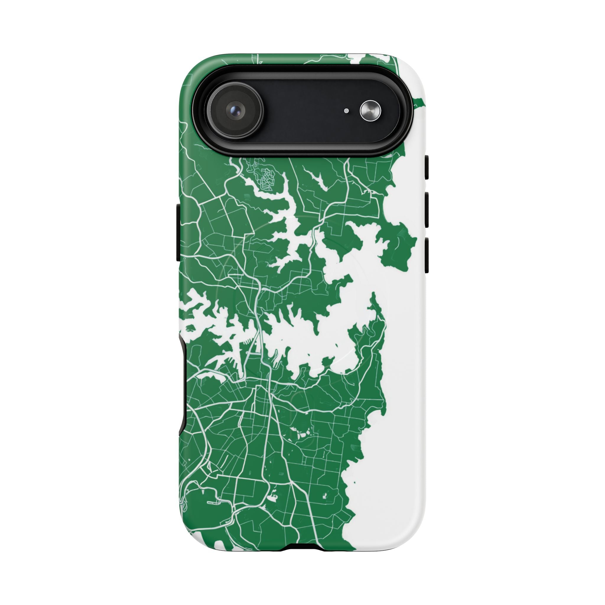 An embedded magnetic ring supports MagSafe® compatibility, allowing effortless attachment of chargers and magnetic accessories. Available in matte or glossy premium finishes, the Sydney Street Map Phone Case – Harbour Edition (Green) blends reliable durability with a refined, city-inspired aesthetic designed for everyday carry.