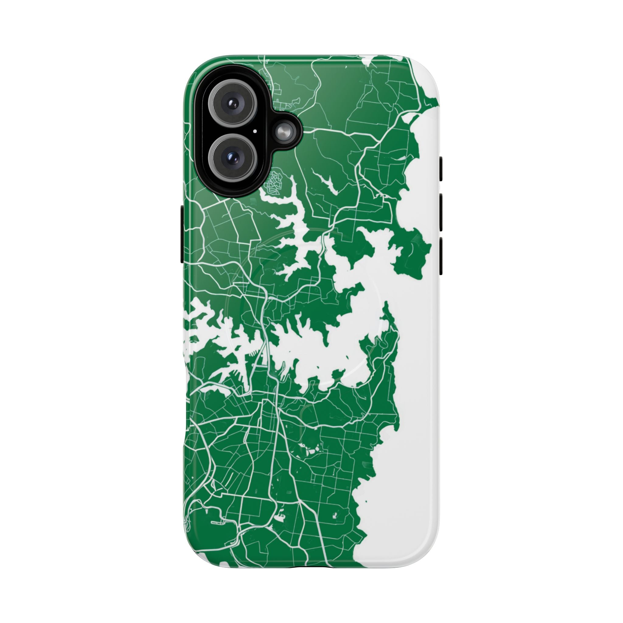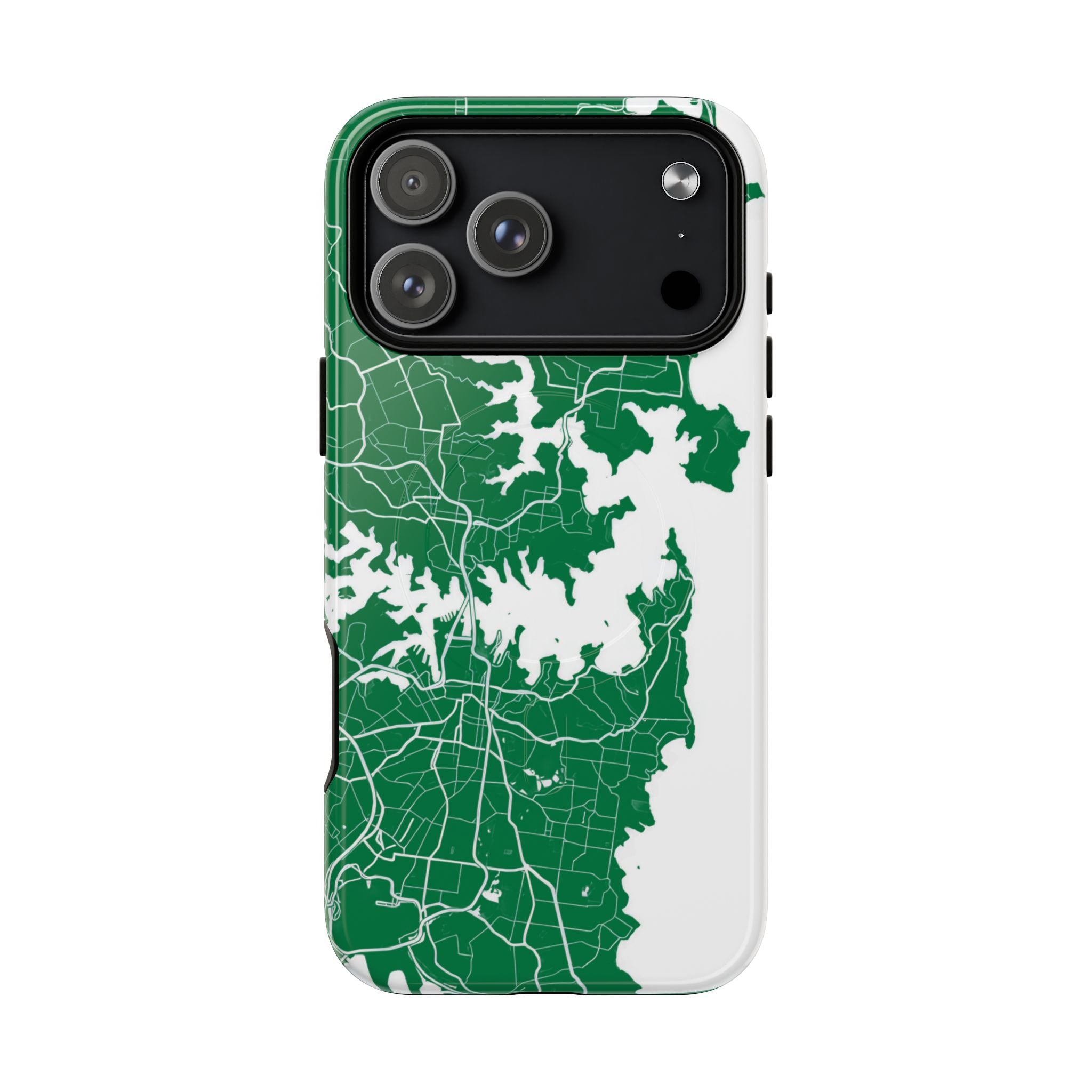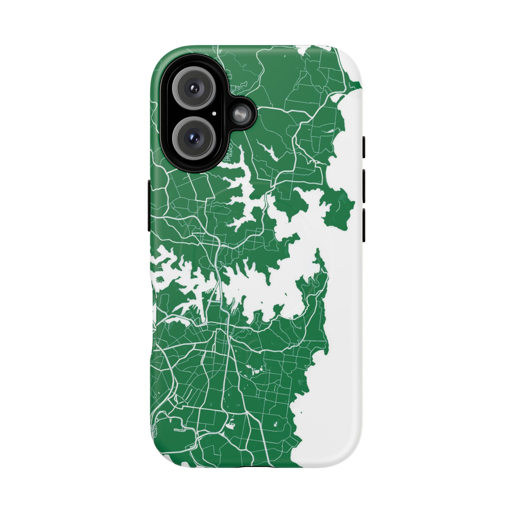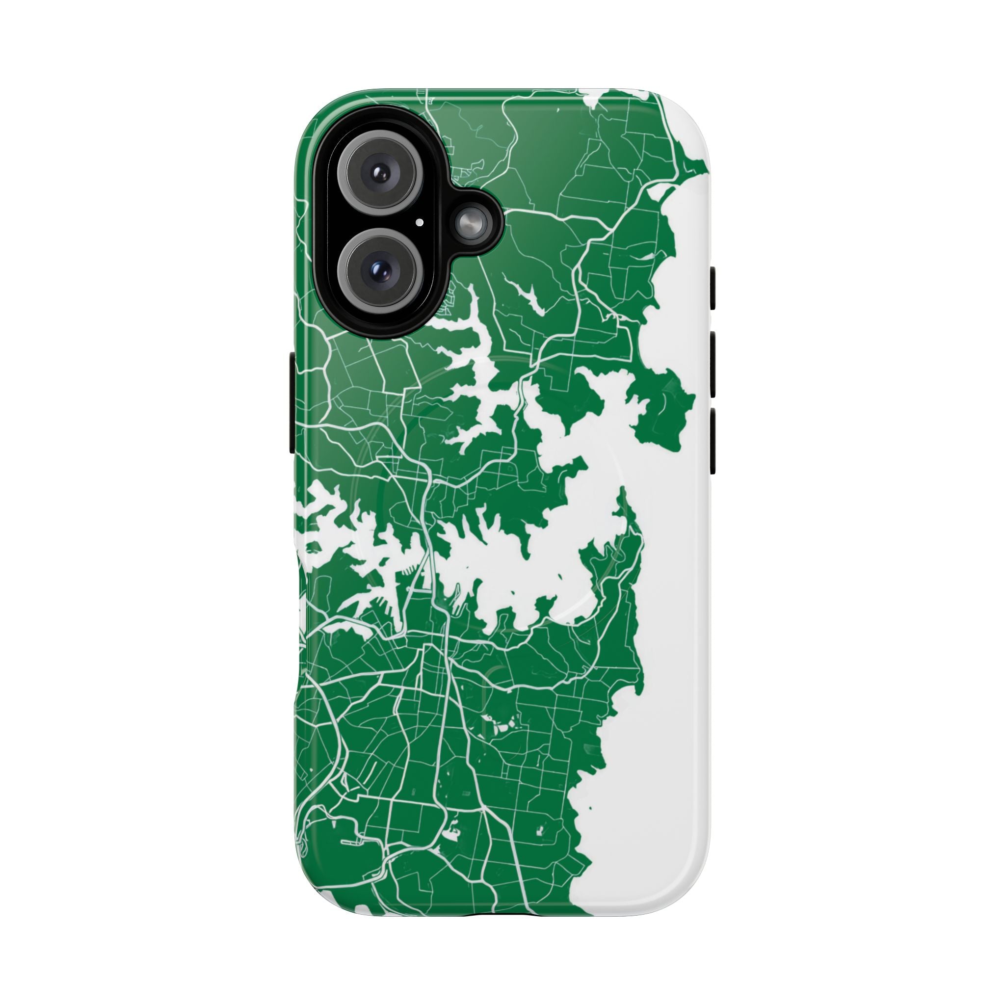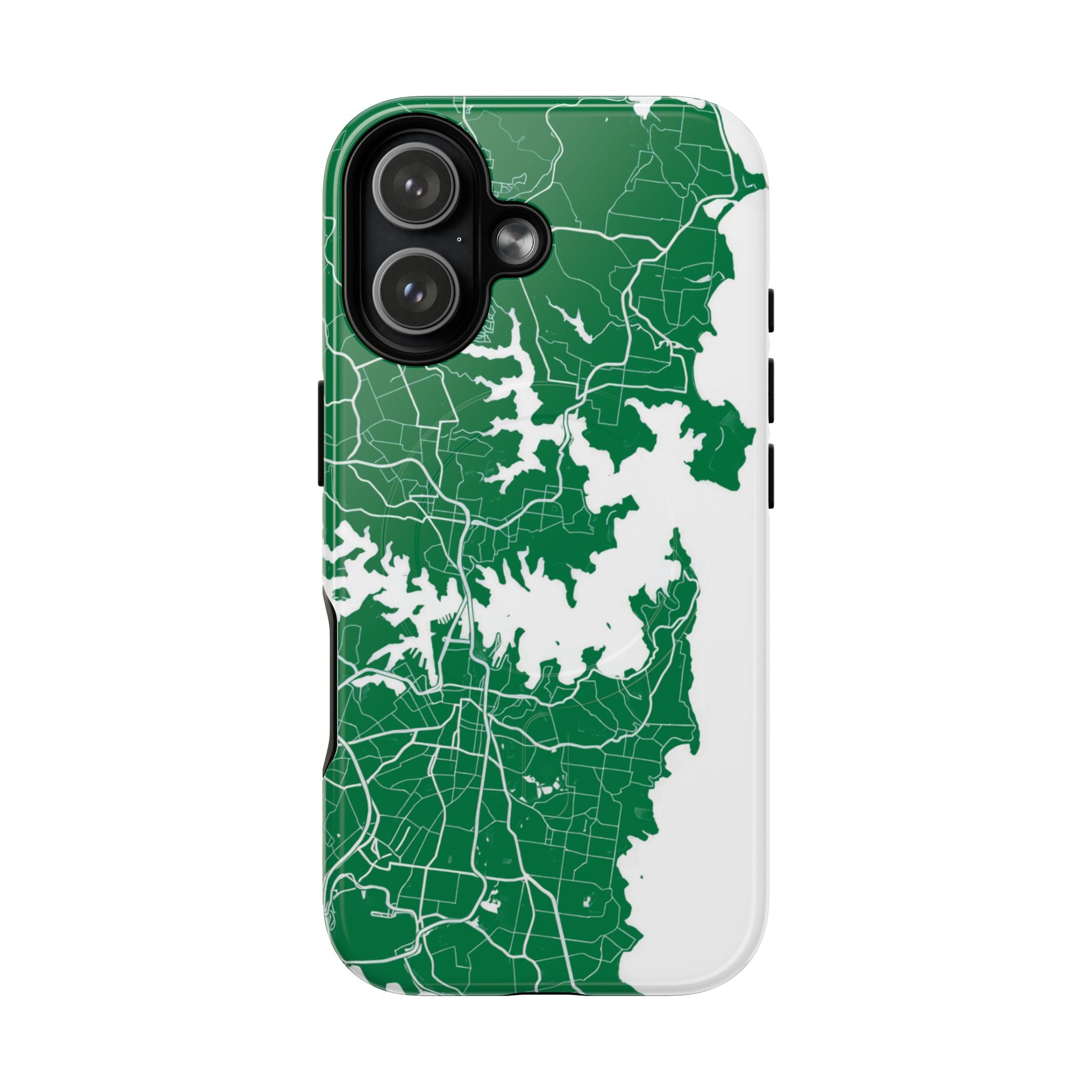 An embedded magnetic ring supports MagSafe® compatibility, allowing effortless attachment of chargers and magnetic accessories. Available in matte or glossy premium finishes, the Sydney Street Map Phone Case – Harbour Edition (Green) blends reliable durability with a refined, city-inspired aesthetic designed for everyday carry.
