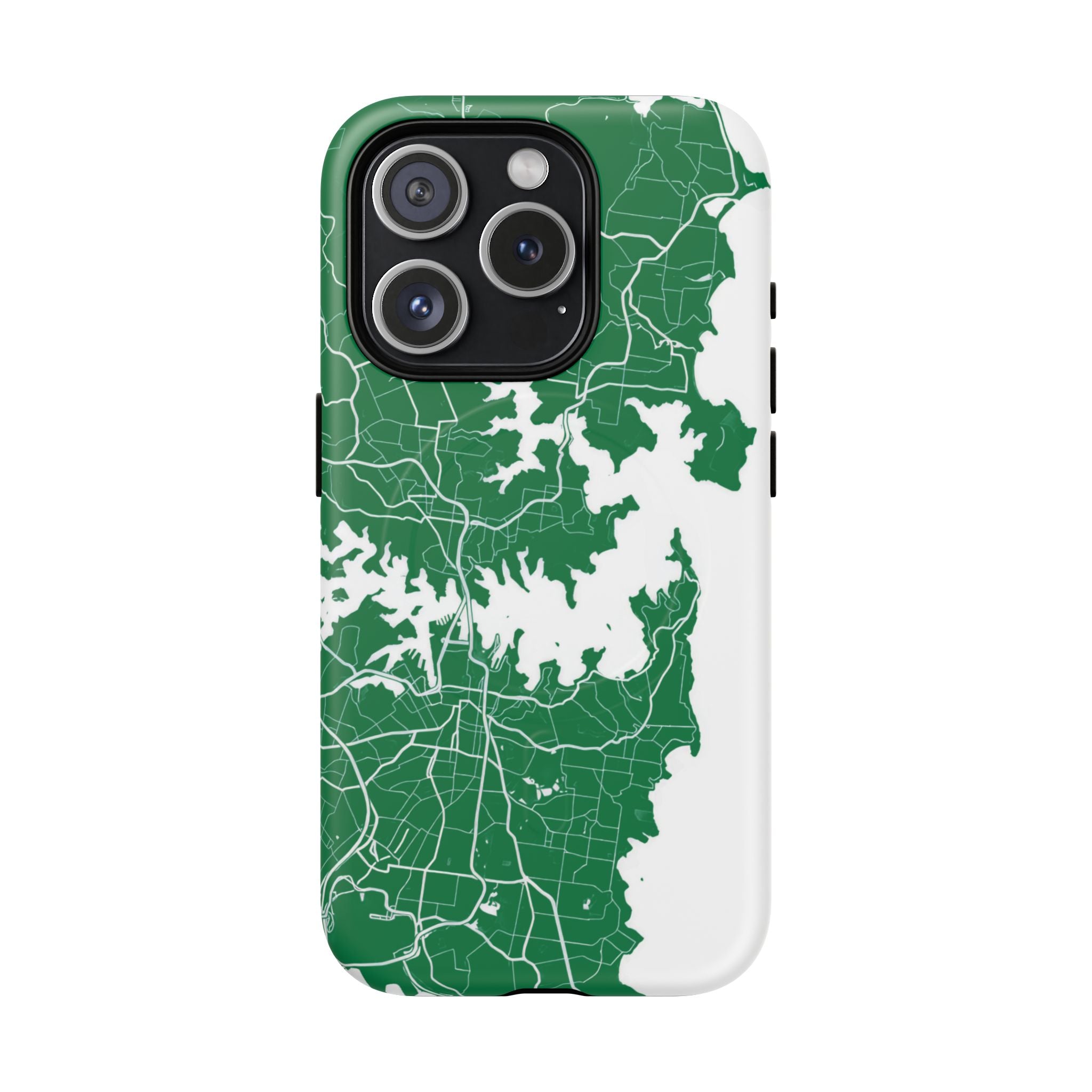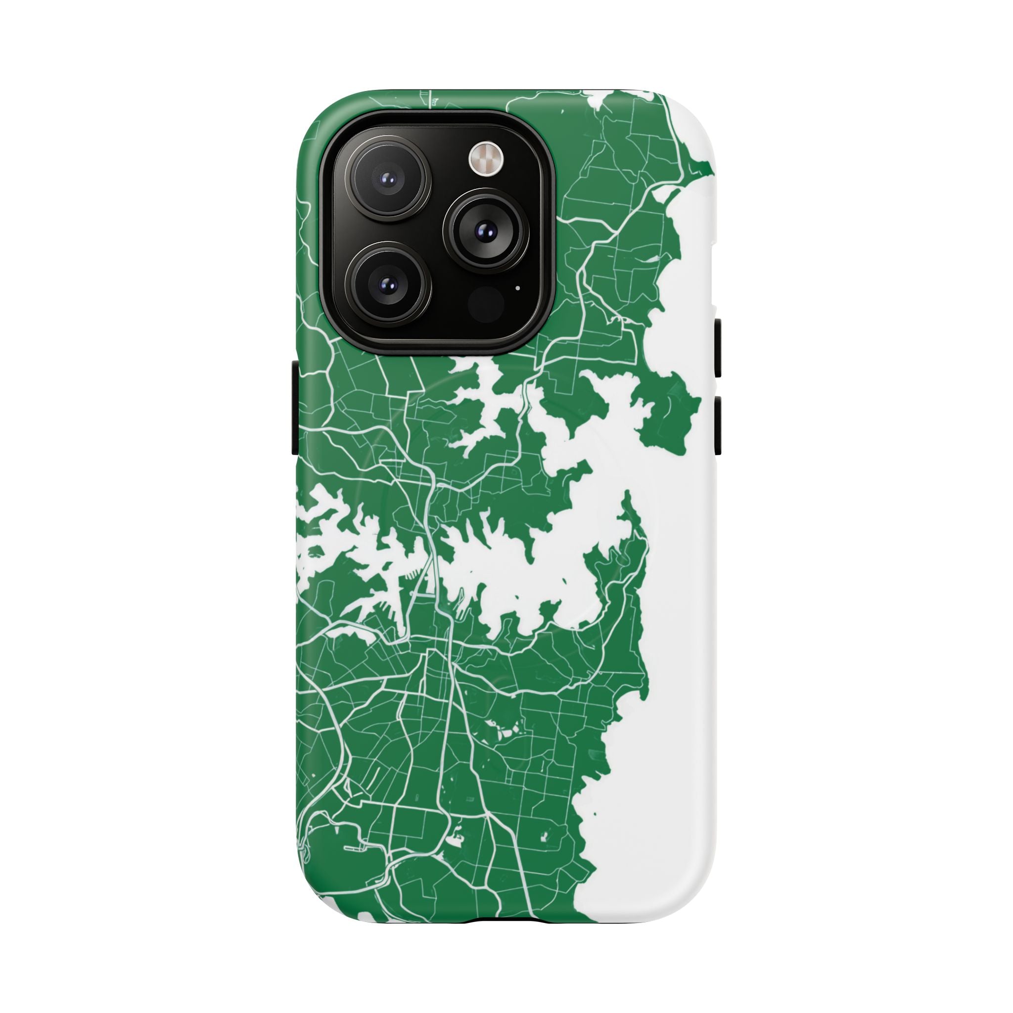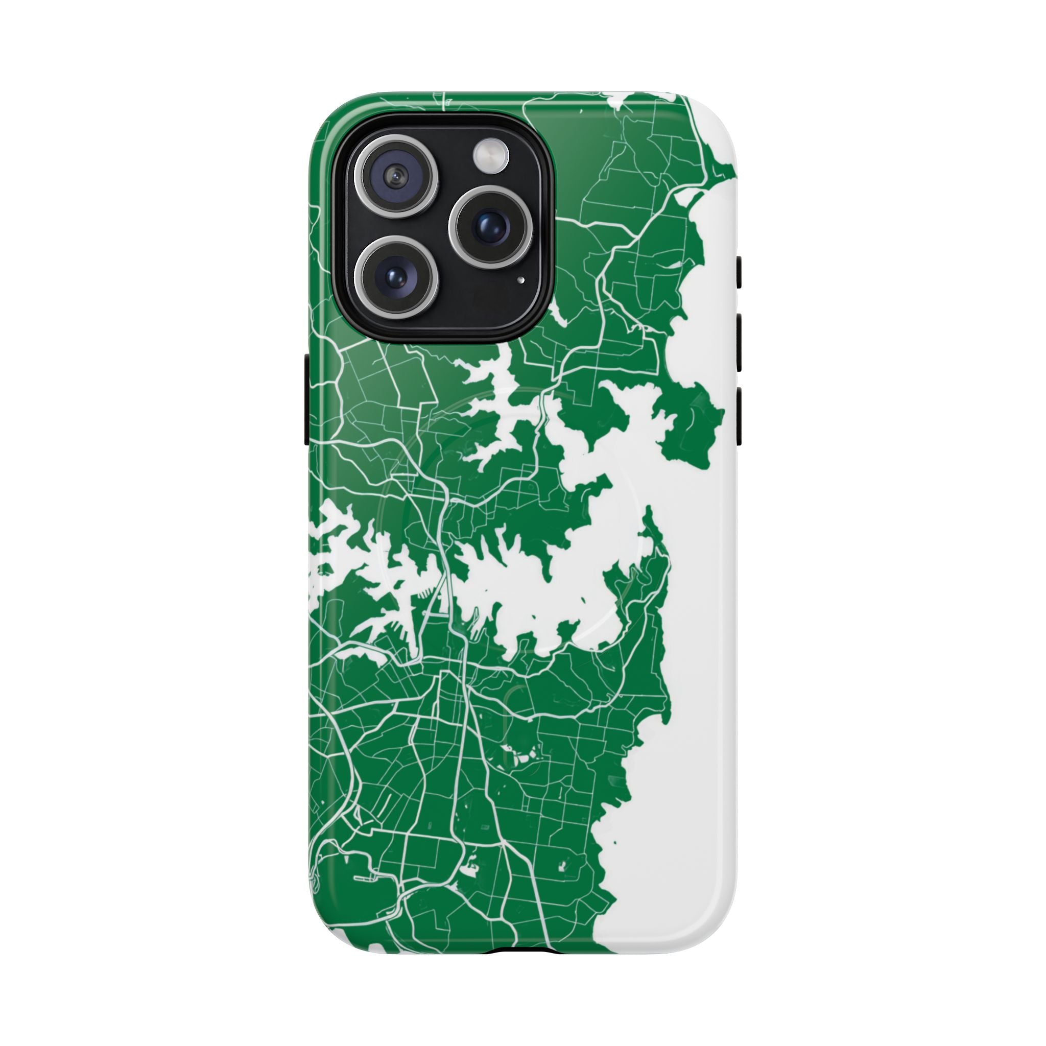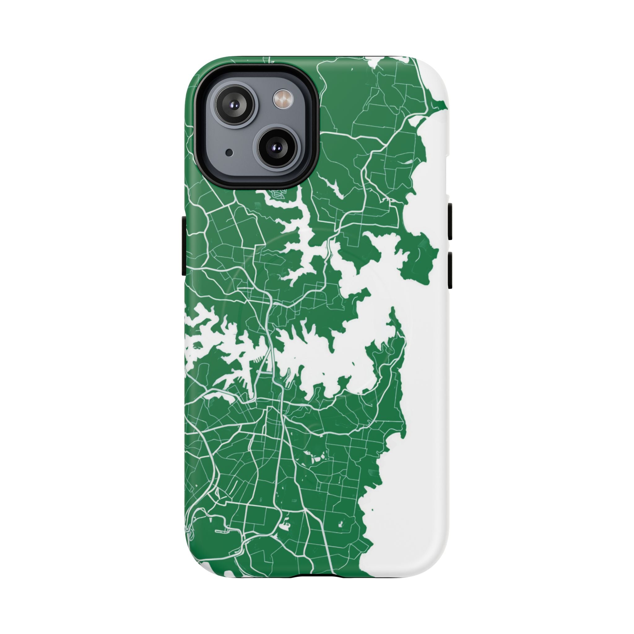 An embedded magnetic ring supports MagSafe® compatibility, allowing effortless attachment of chargers and magnetic accessories. Available in matte or glossy premium finishes, the Sydney Street Map Phone Case – Harbour Edition (Green) blends reliable durability with a refined, city-inspired aesthetic designed for everyday carry.