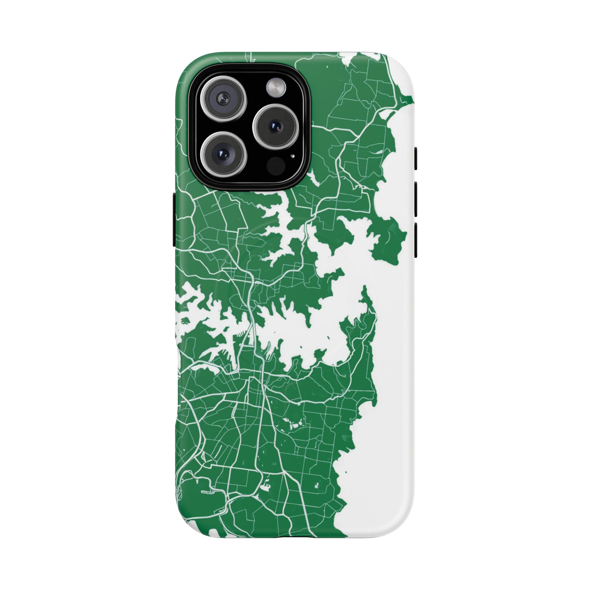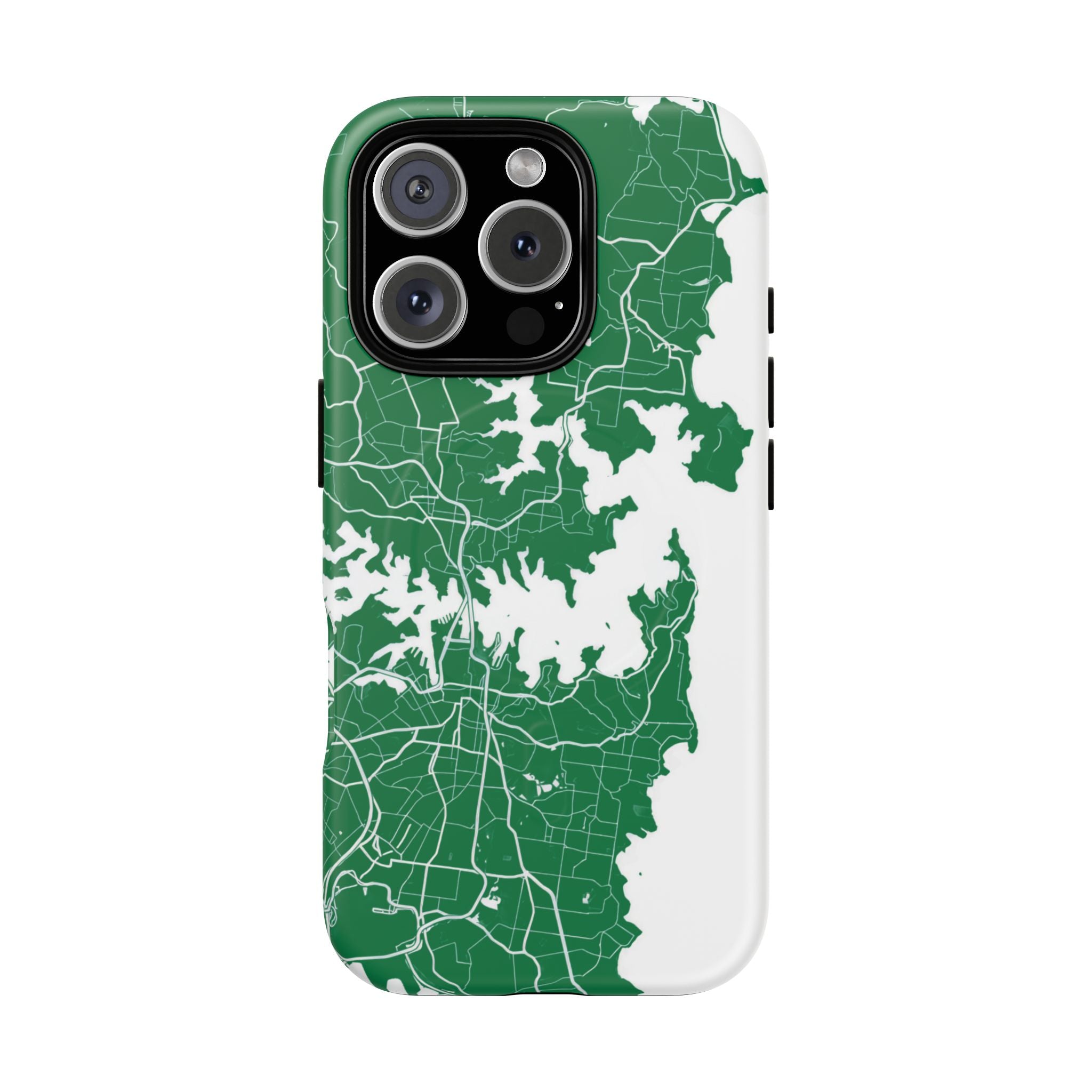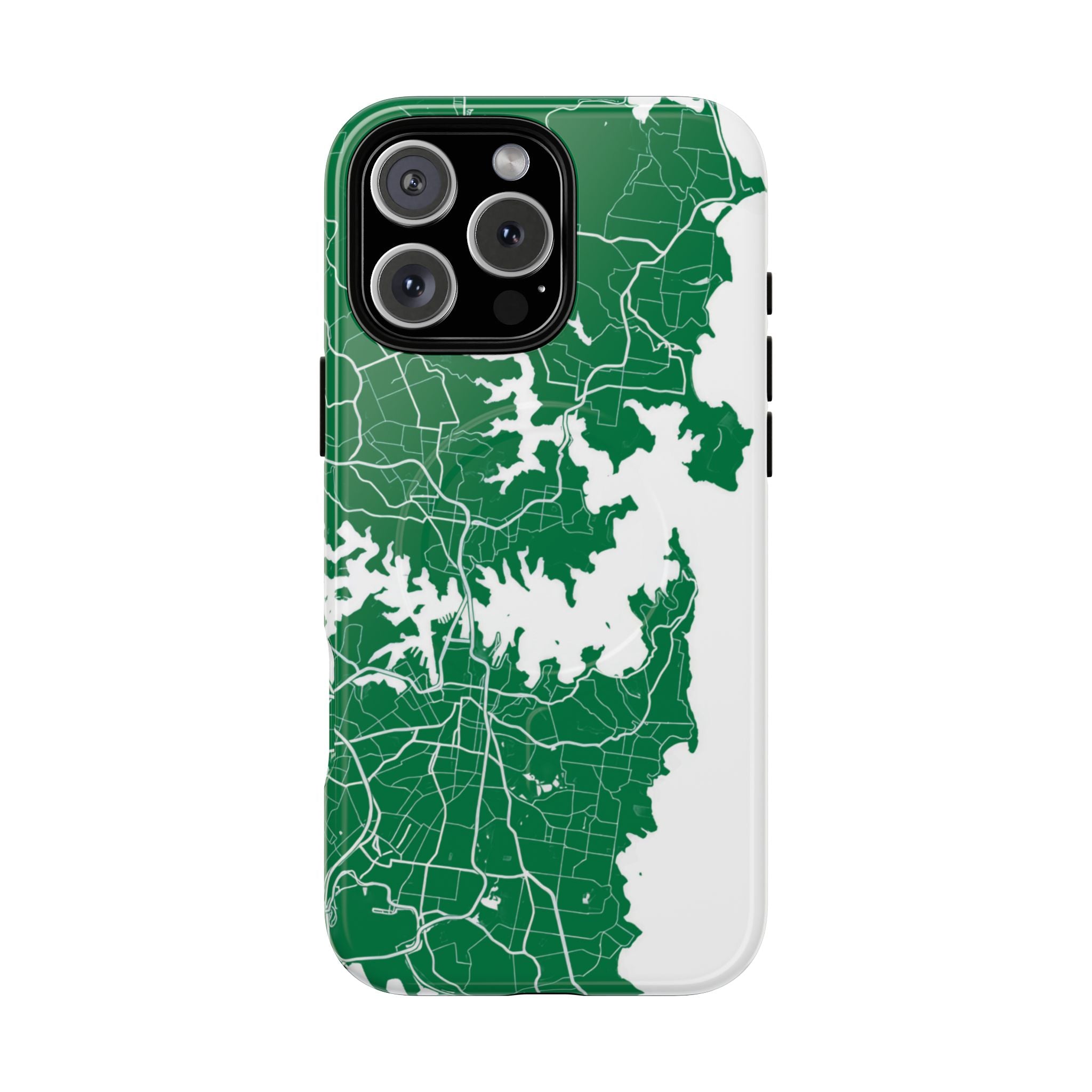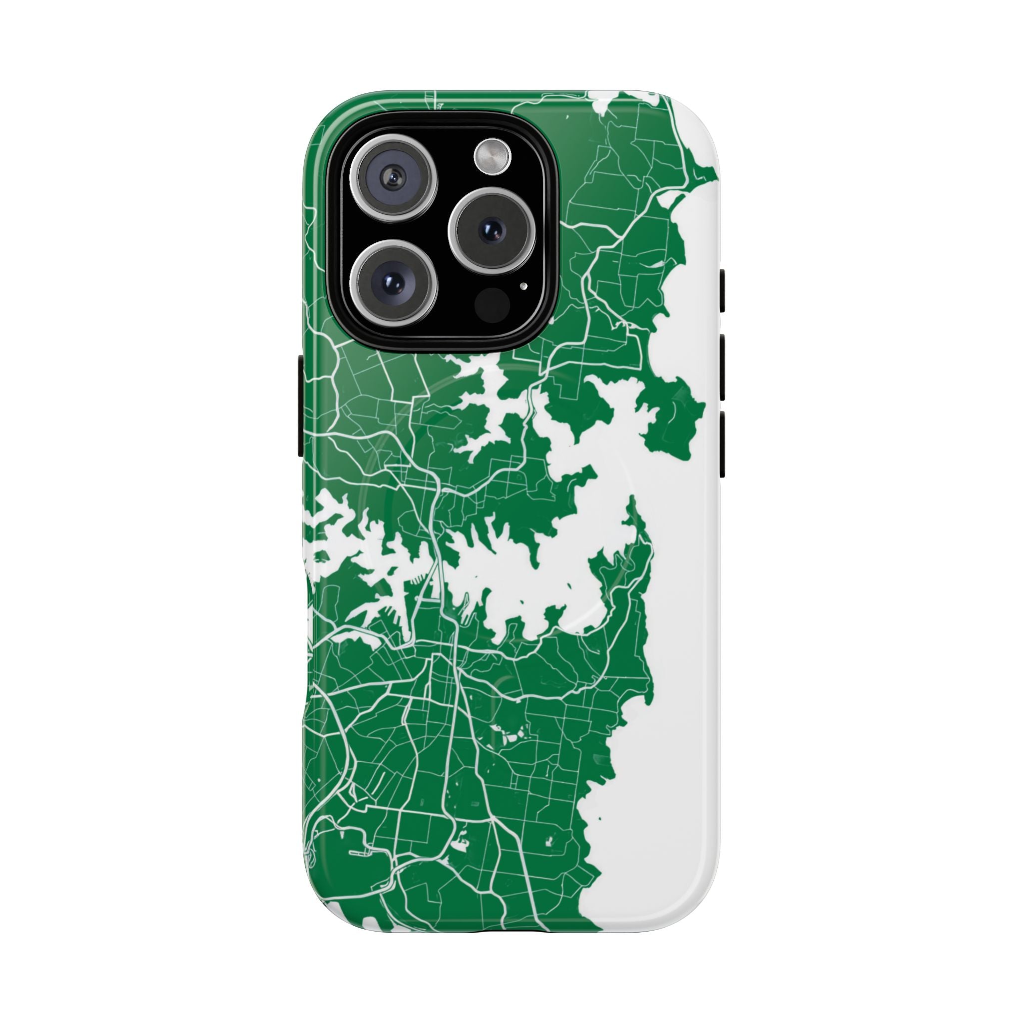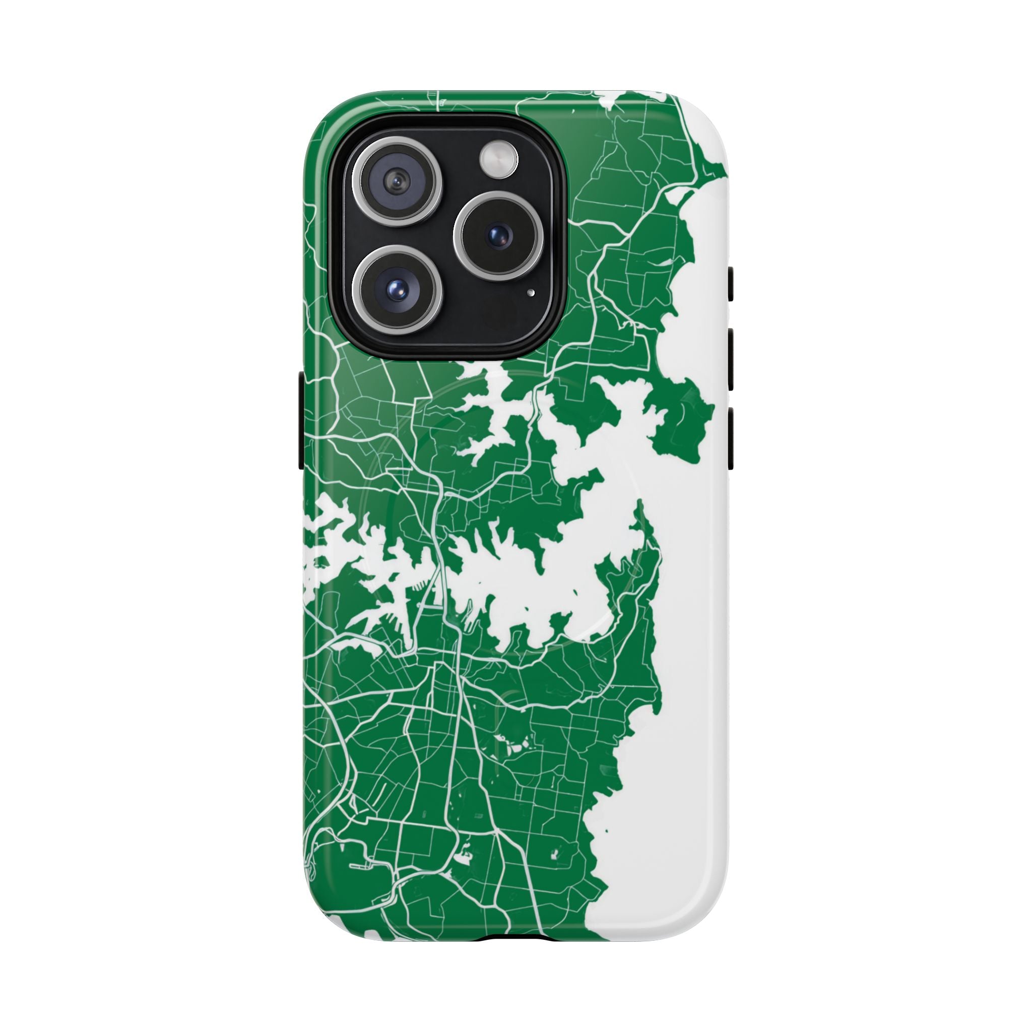 An embedded magnetic ring supports MagSafe® compatibility, allowing effortless attachment of chargers and magnetic accessories. Available in matte or glossy premium finishes, the Sydney Street Map Phone Case – Harbour Edition (Green) blends reliable durability with a refined, city-inspired aesthetic designed for everyday carry.