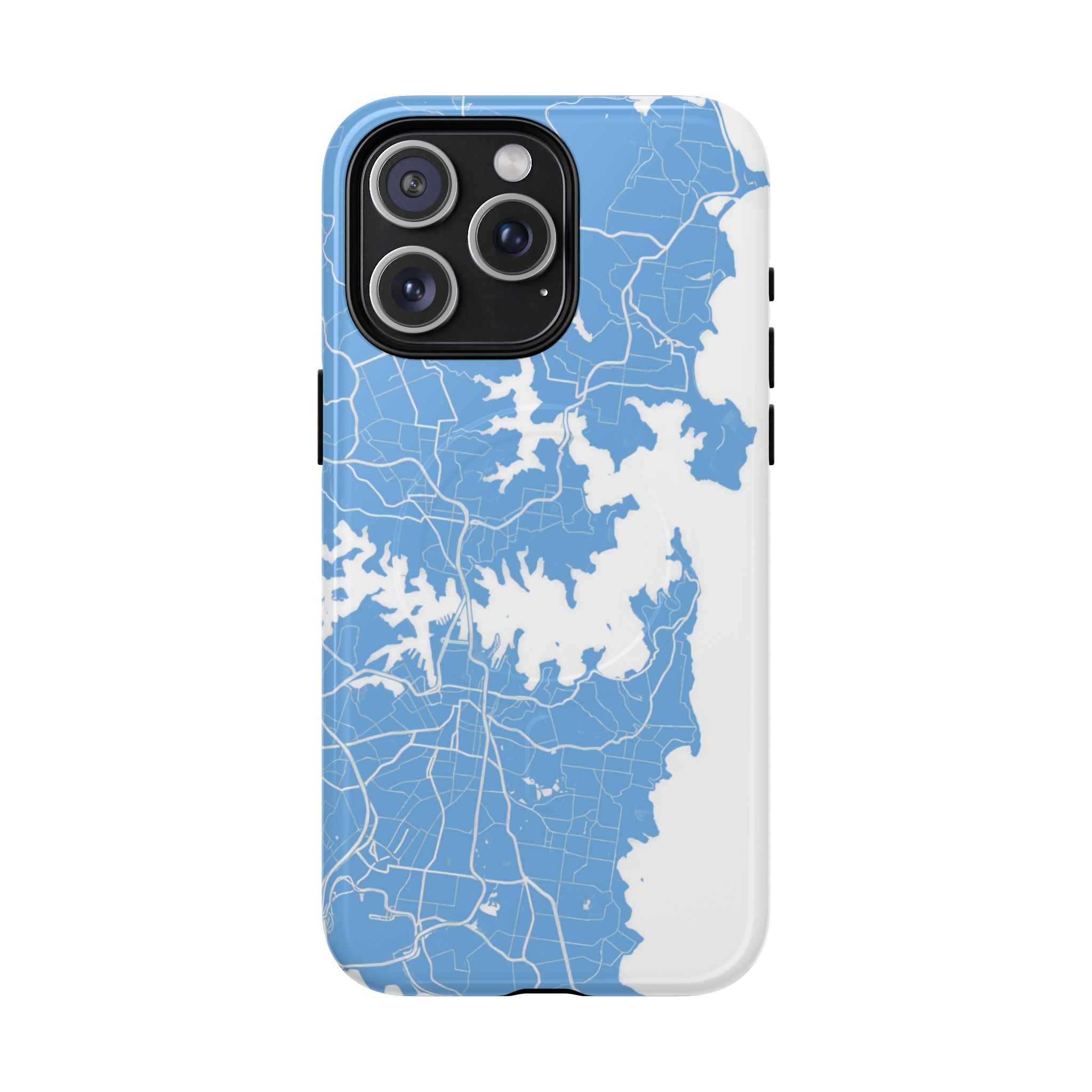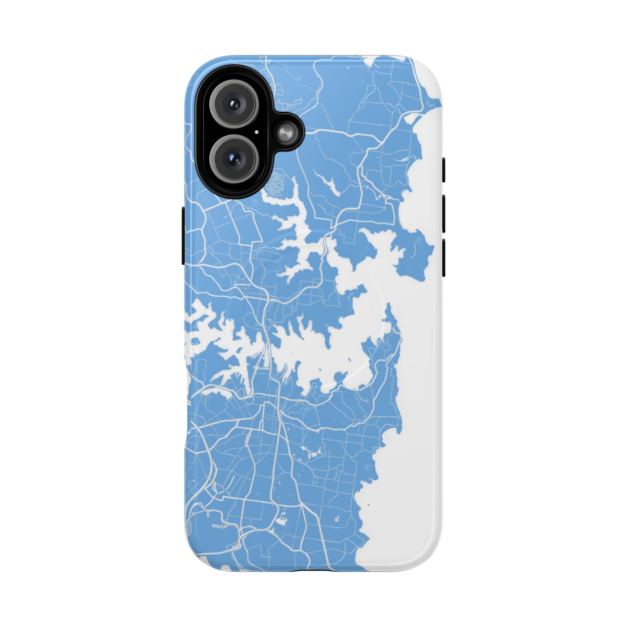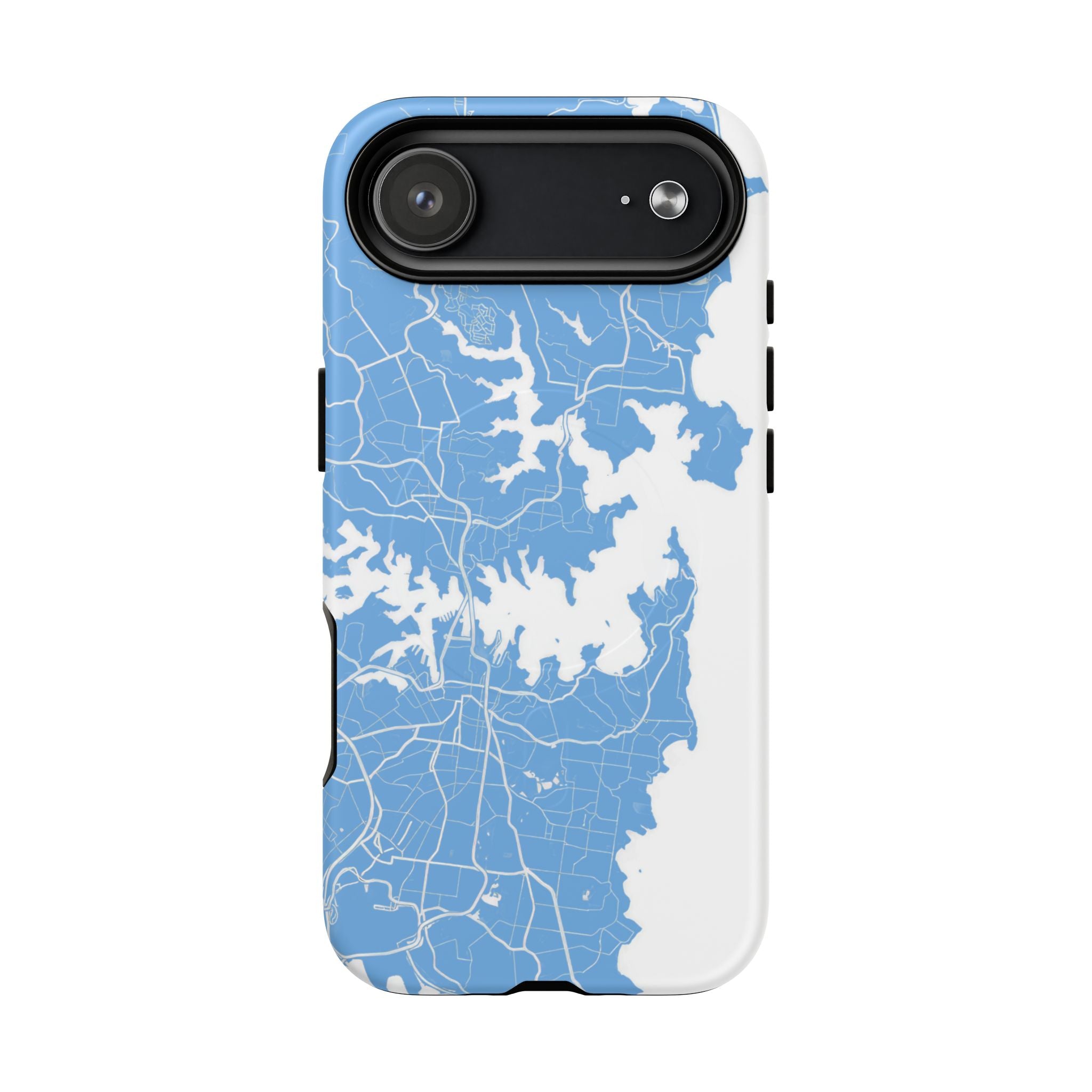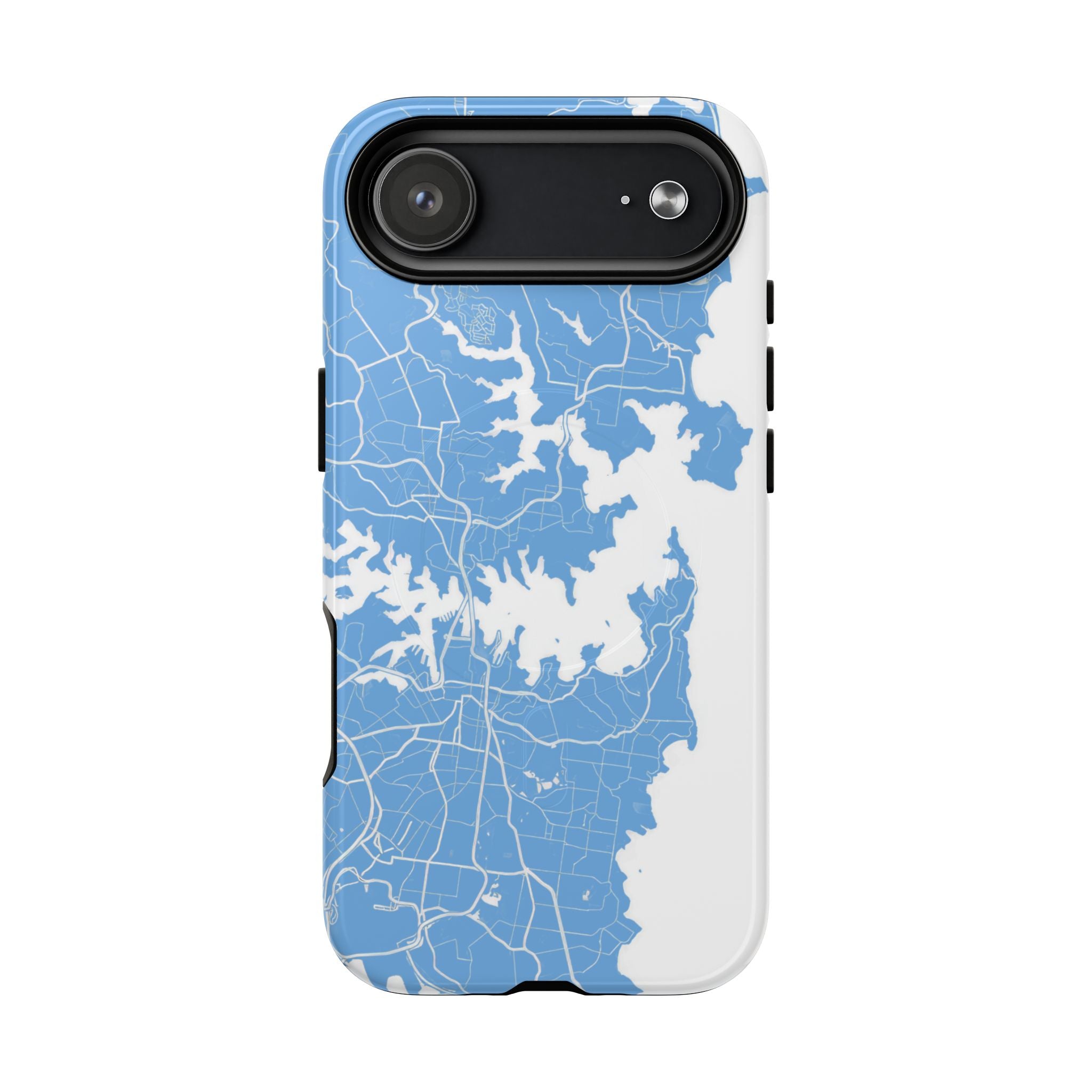 An embedded magnetic ring supports MagSafe® compatibility, allowing effortless attachment of chargers and magnetic accessories. Available in matte or glossy premium finishes, the Sydney Street Map Phone Case – Harbour Edition (Light Blue) blends dependable durability with a fresh, coastal aesthetic designed for everyday carry.