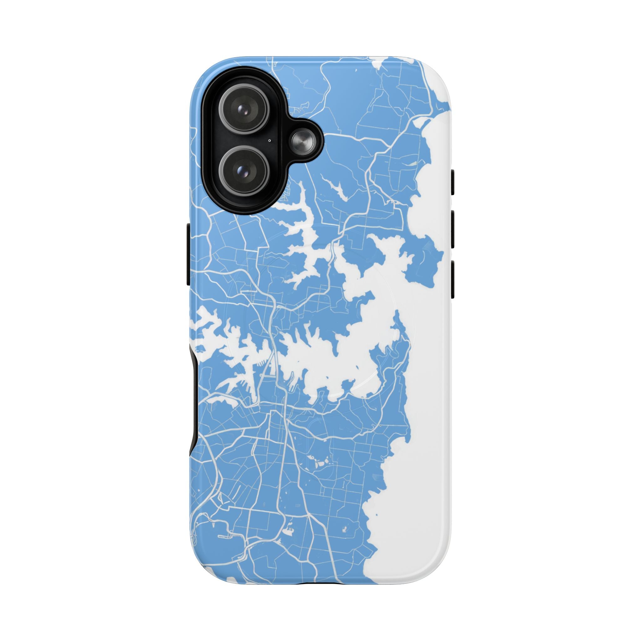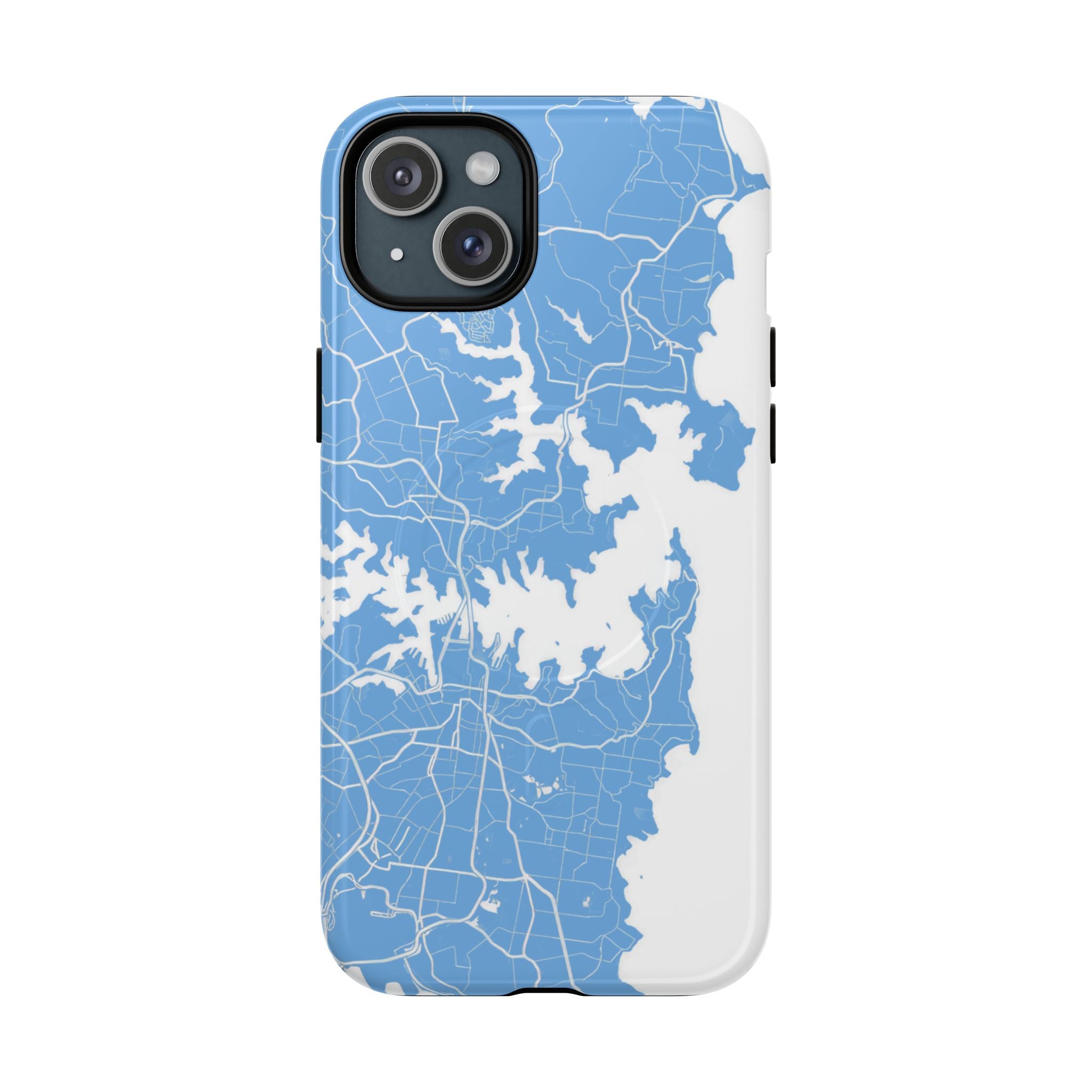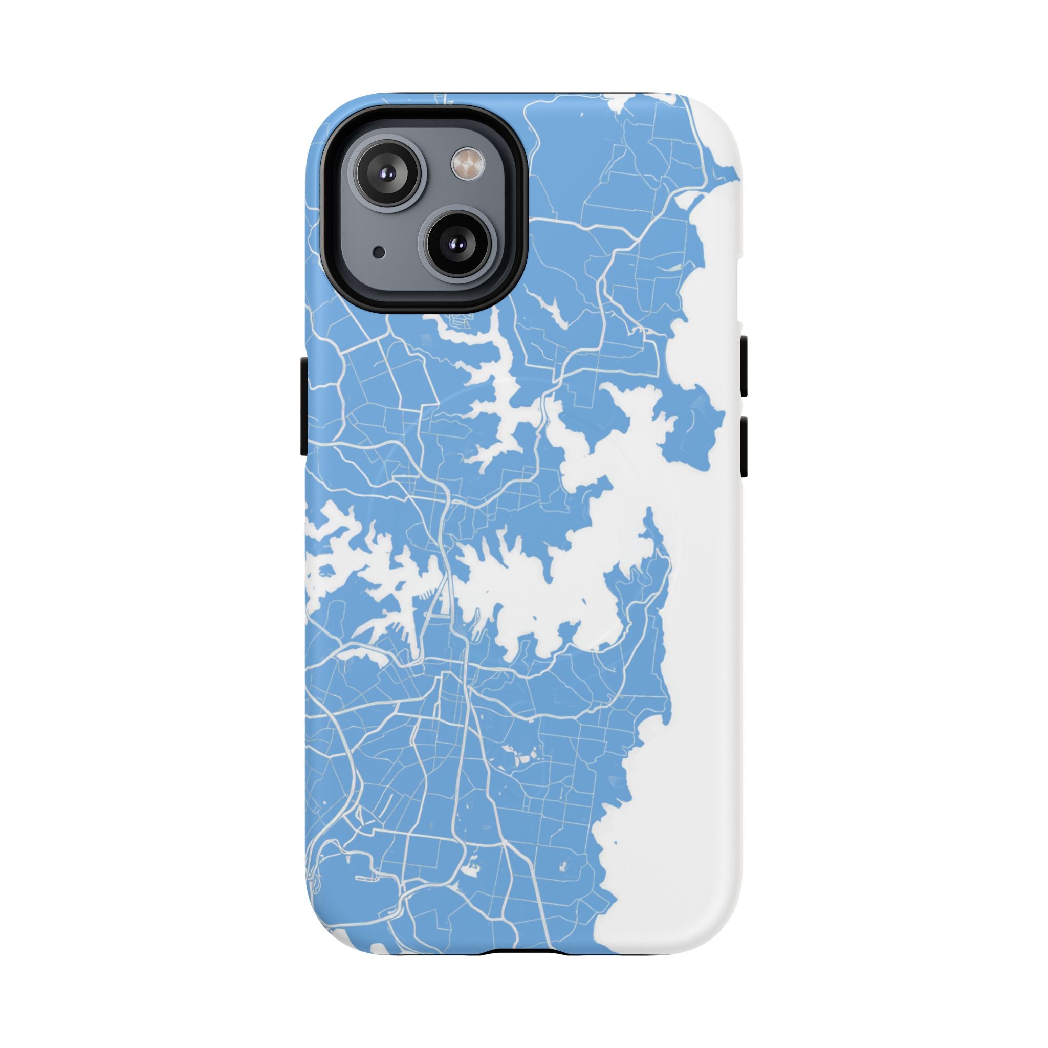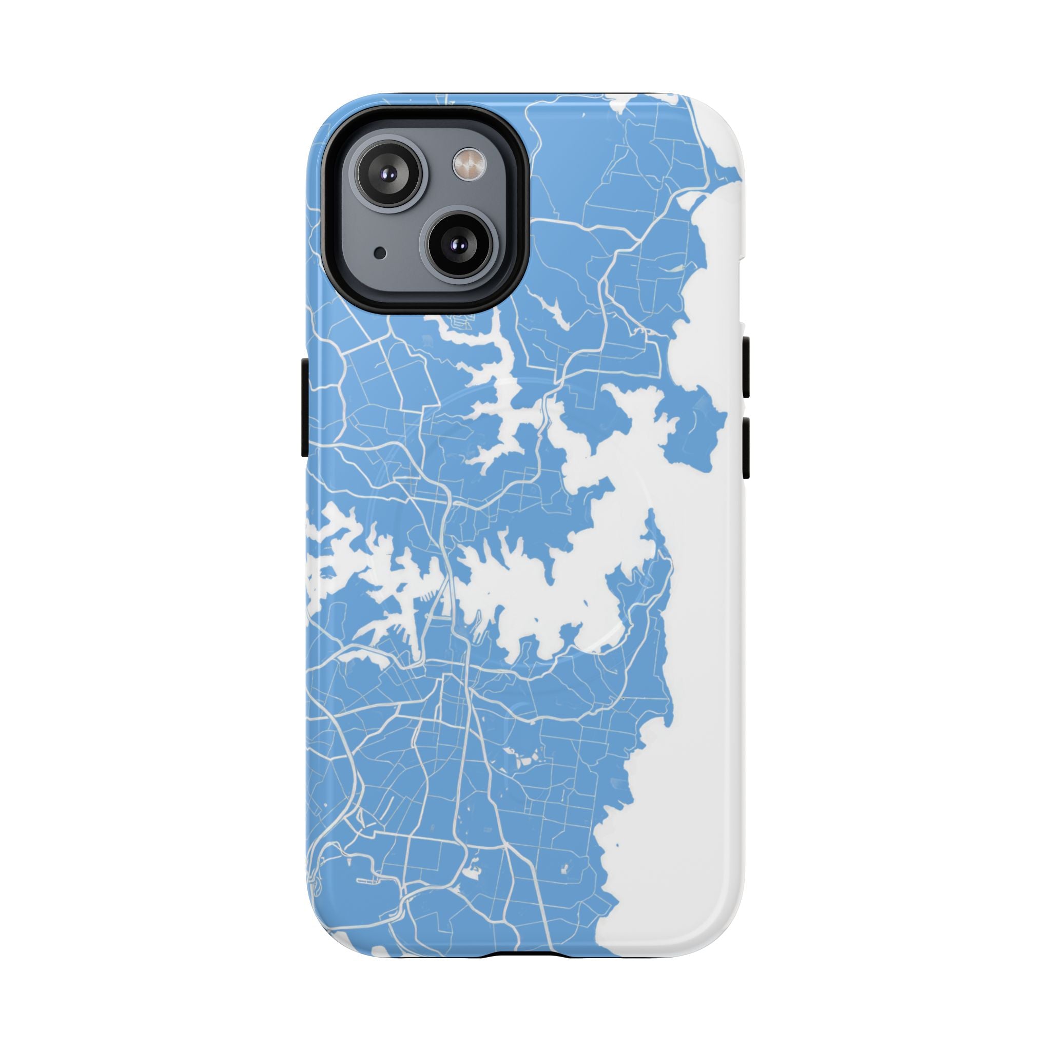 An embedded magnetic ring supports MagSafe® compatibility, allowing effortless attachment of chargers and magnetic accessories. Available in matte or glossy premium finishes, the Sydney Street Map Phone Case – Harbour Edition (Light Blue) blends dependable durability with a fresh, coastal aesthetic designed for everyday carry.