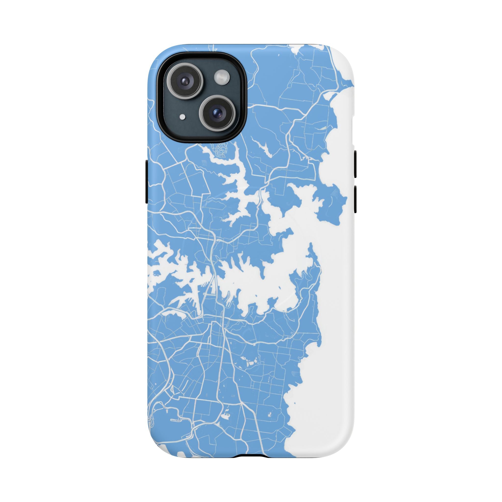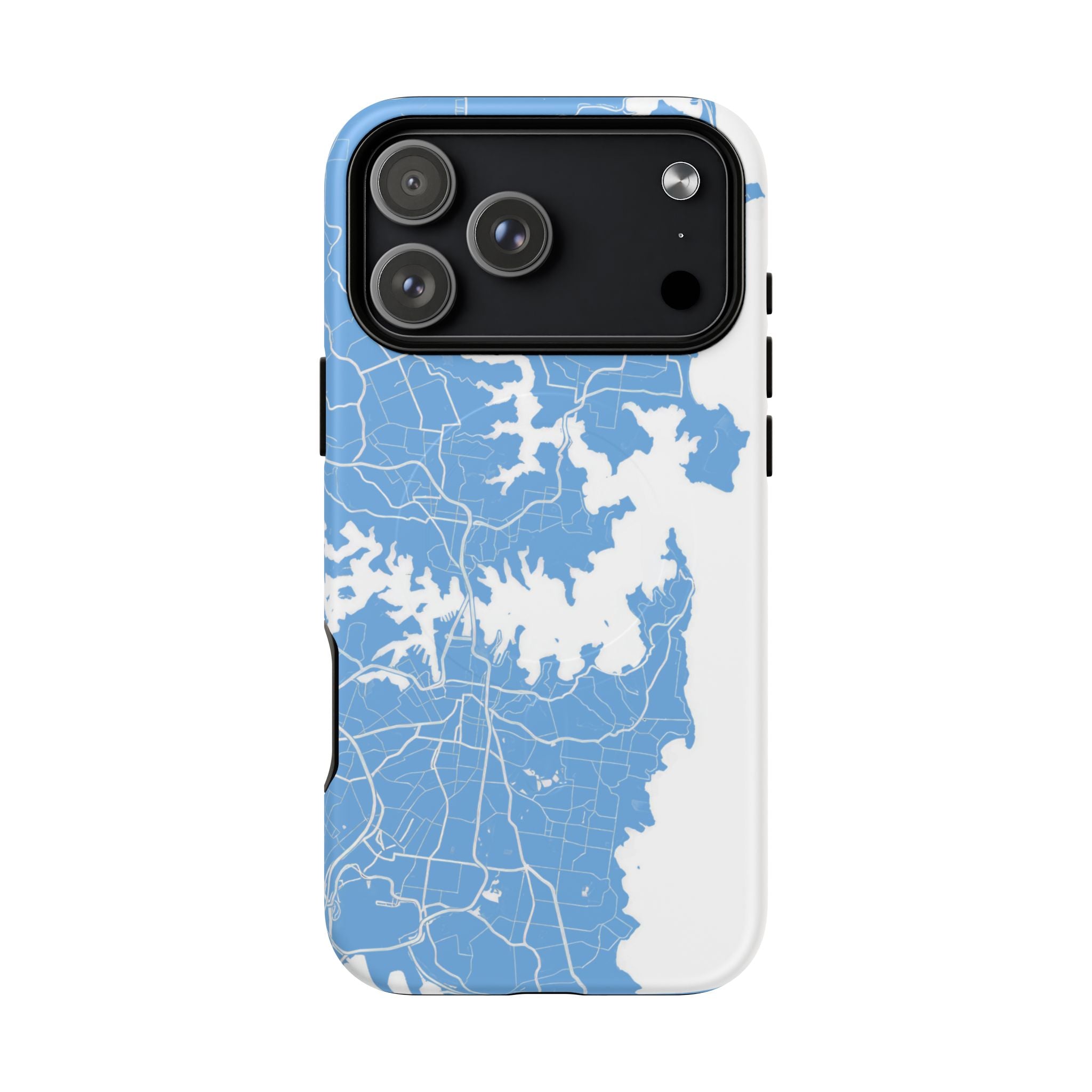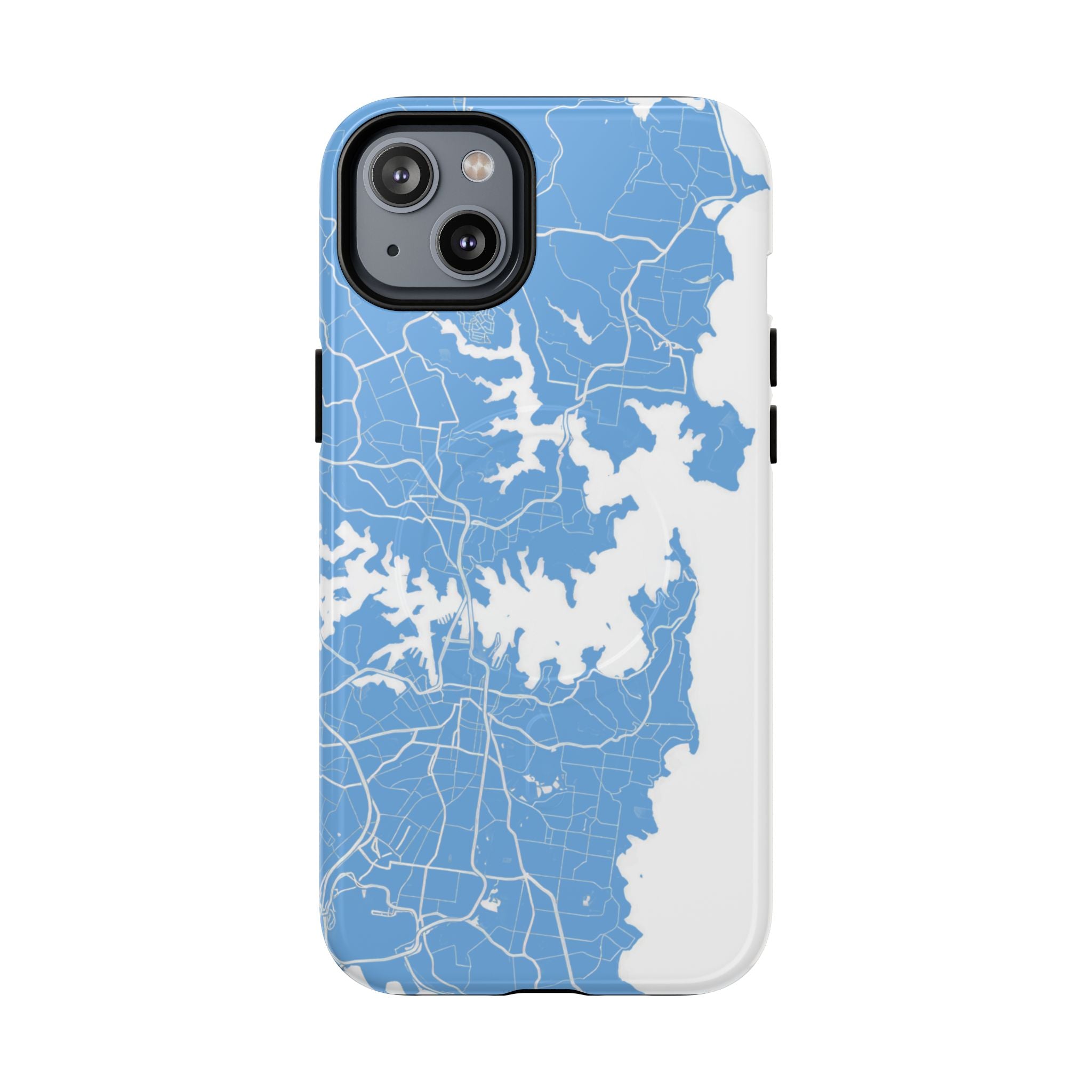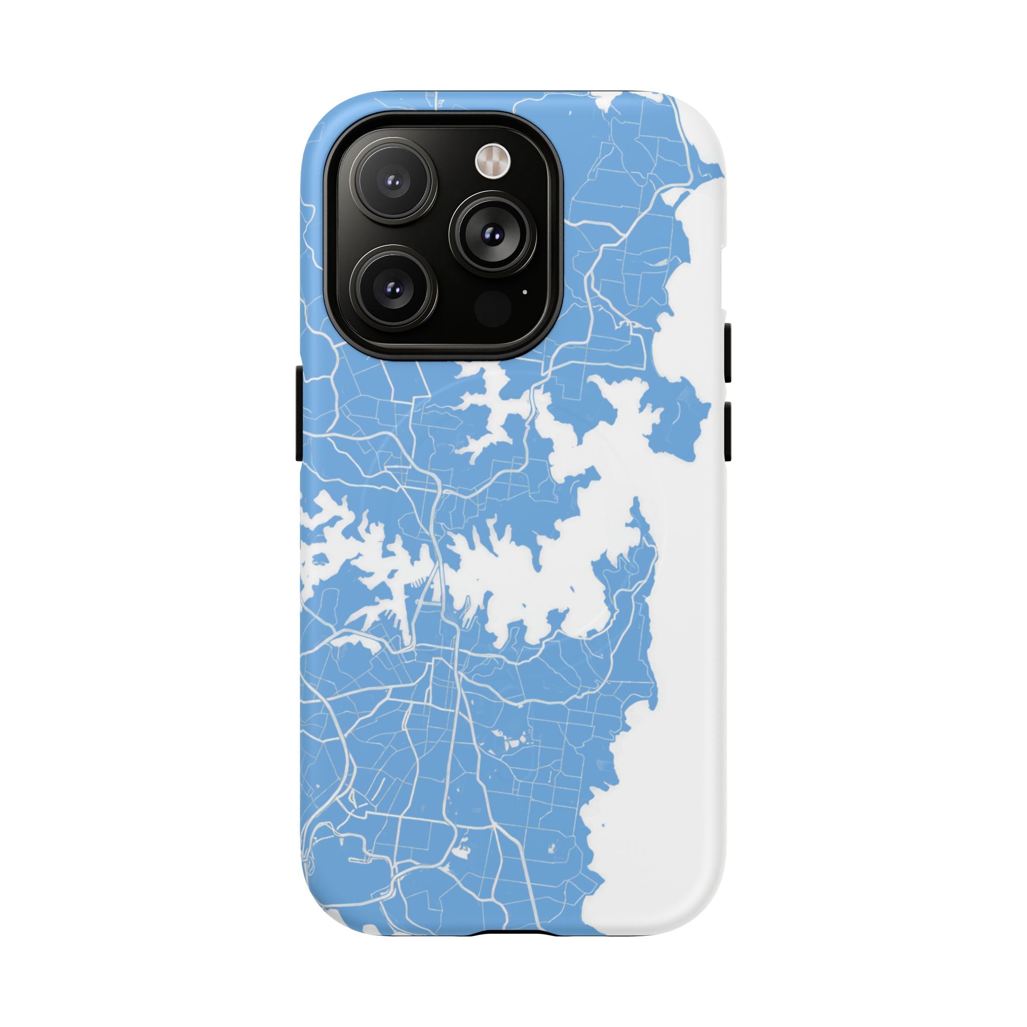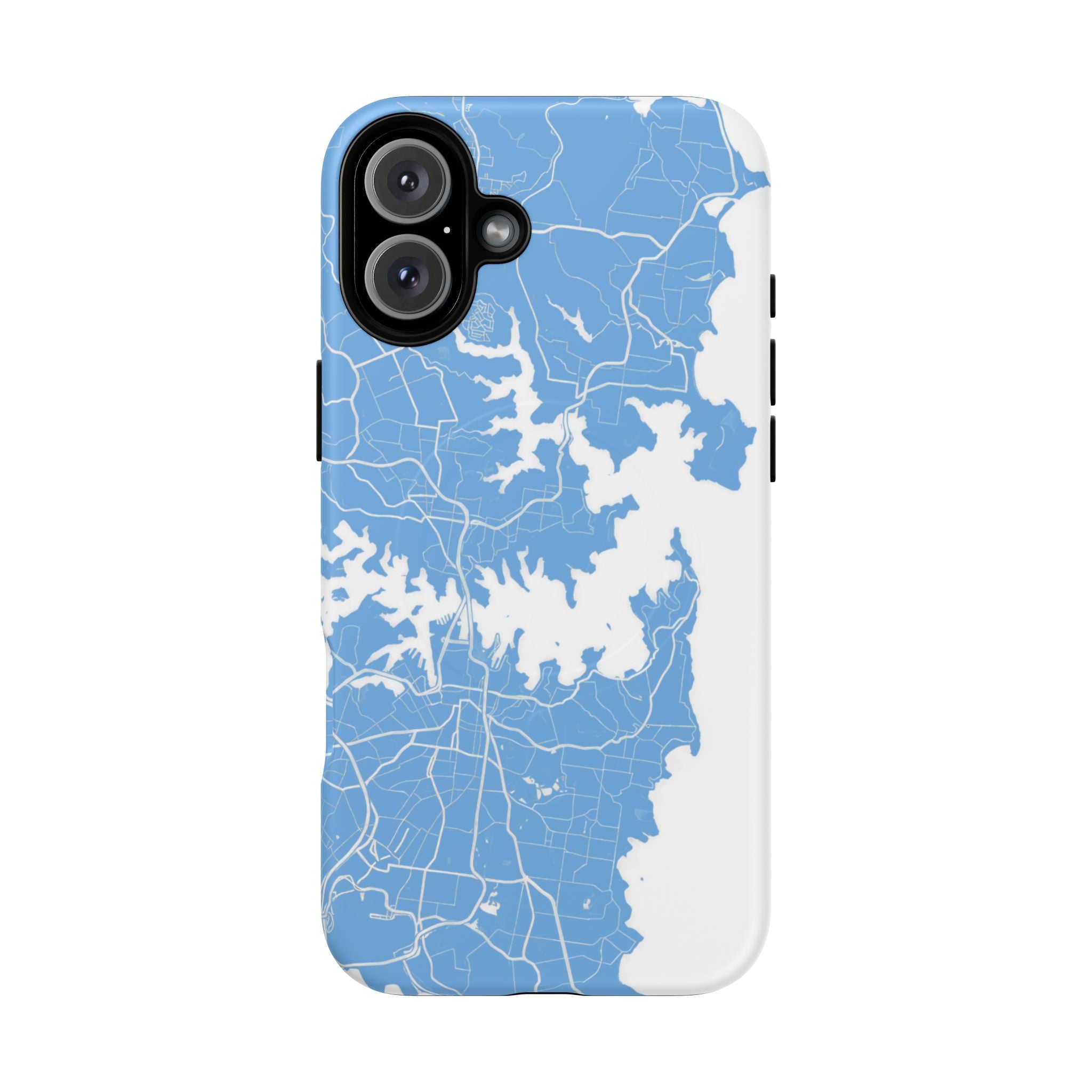 An embedded magnetic ring supports MagSafe® compatibility, allowing effortless attachment of chargers and magnetic accessories. Available in matte or glossy premium finishes, the Sydney Street Map Phone Case – Harbour Edition (Light Blue) blends dependable durability with a fresh, coastal aesthetic designed for everyday carry.