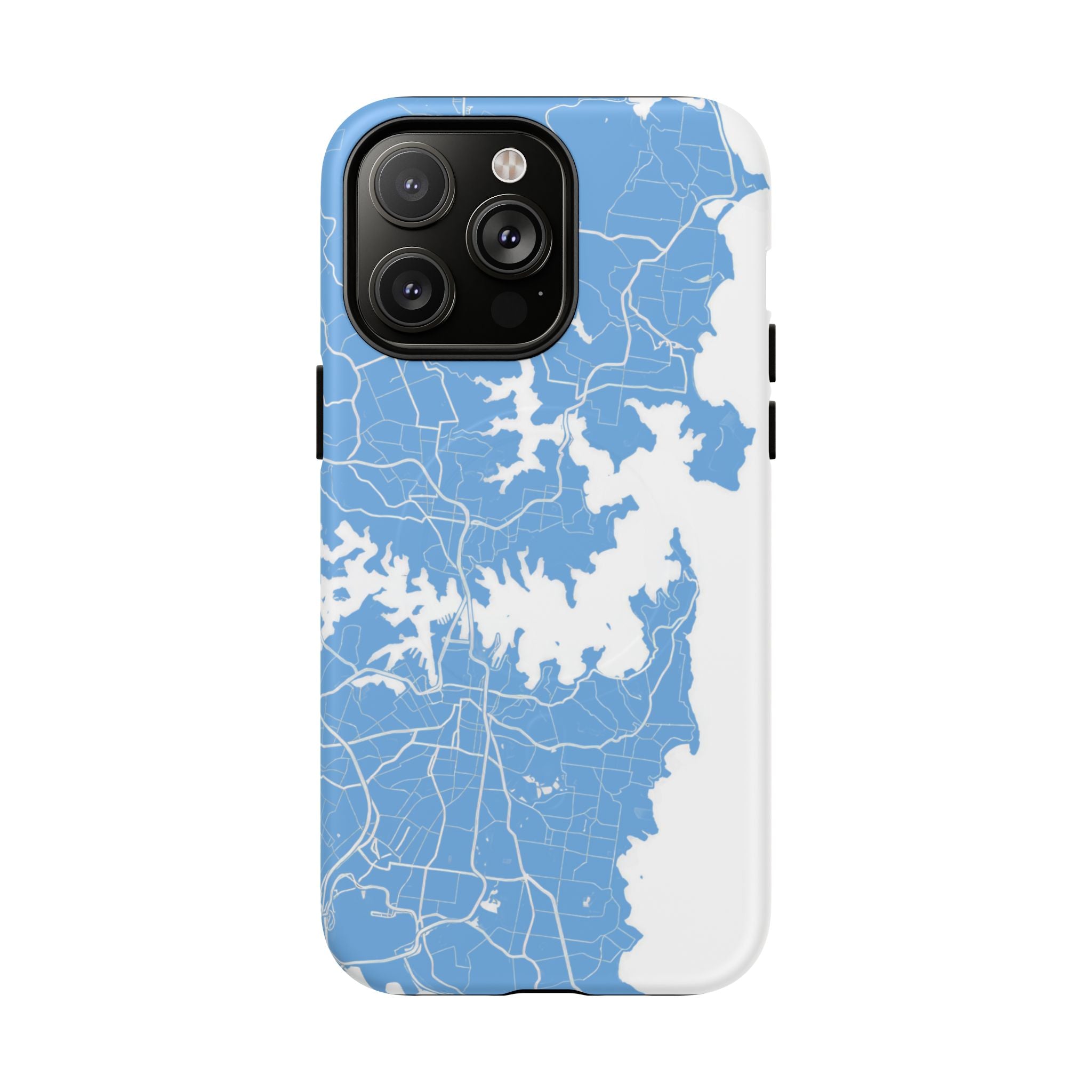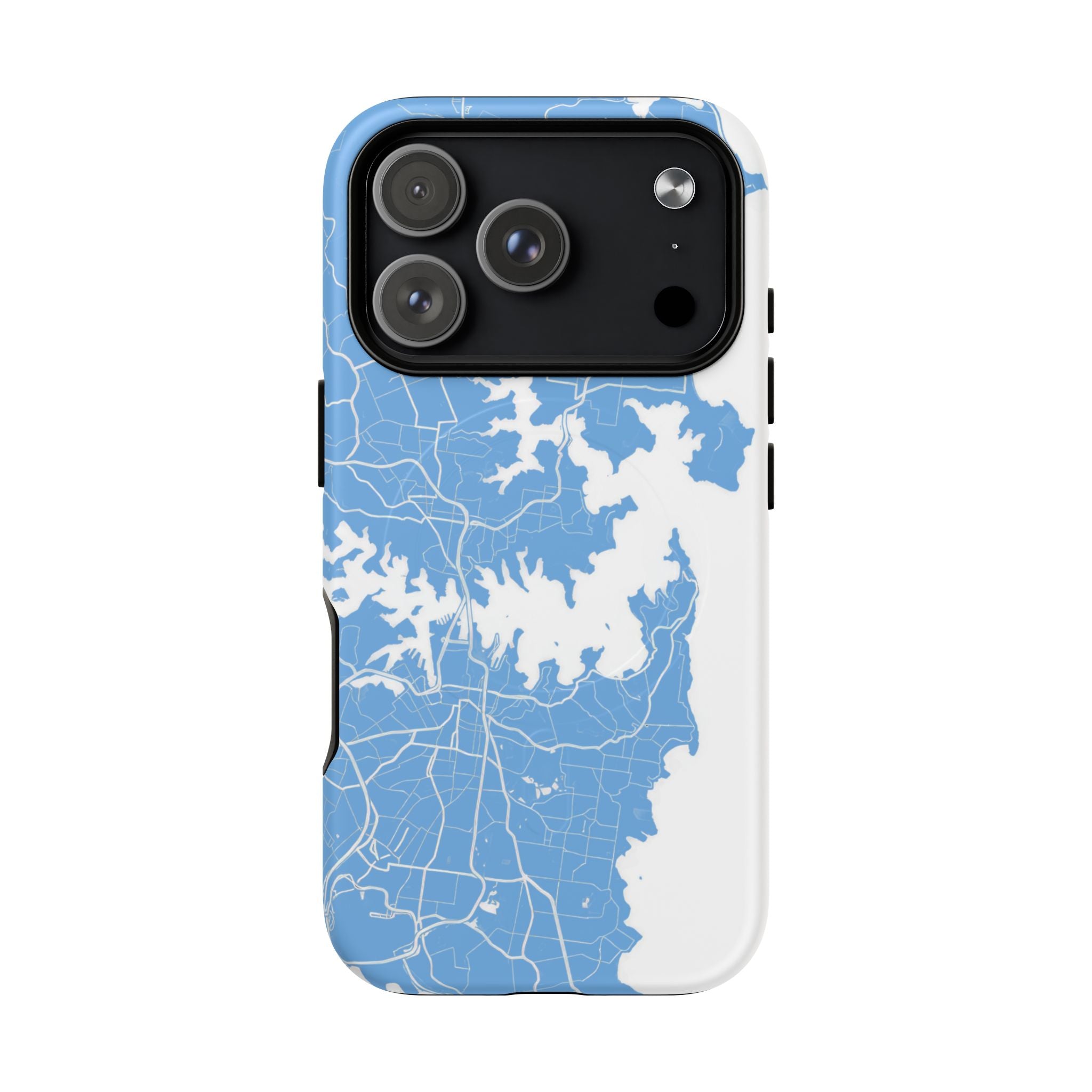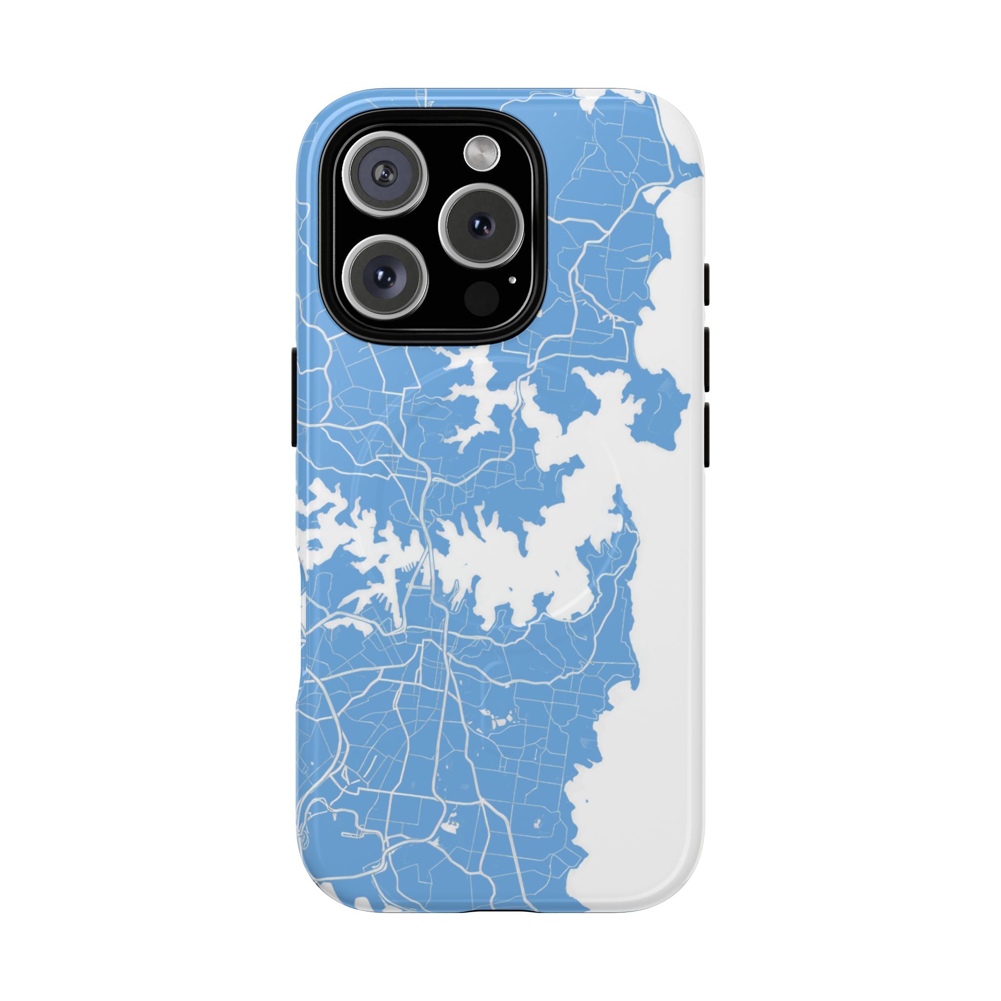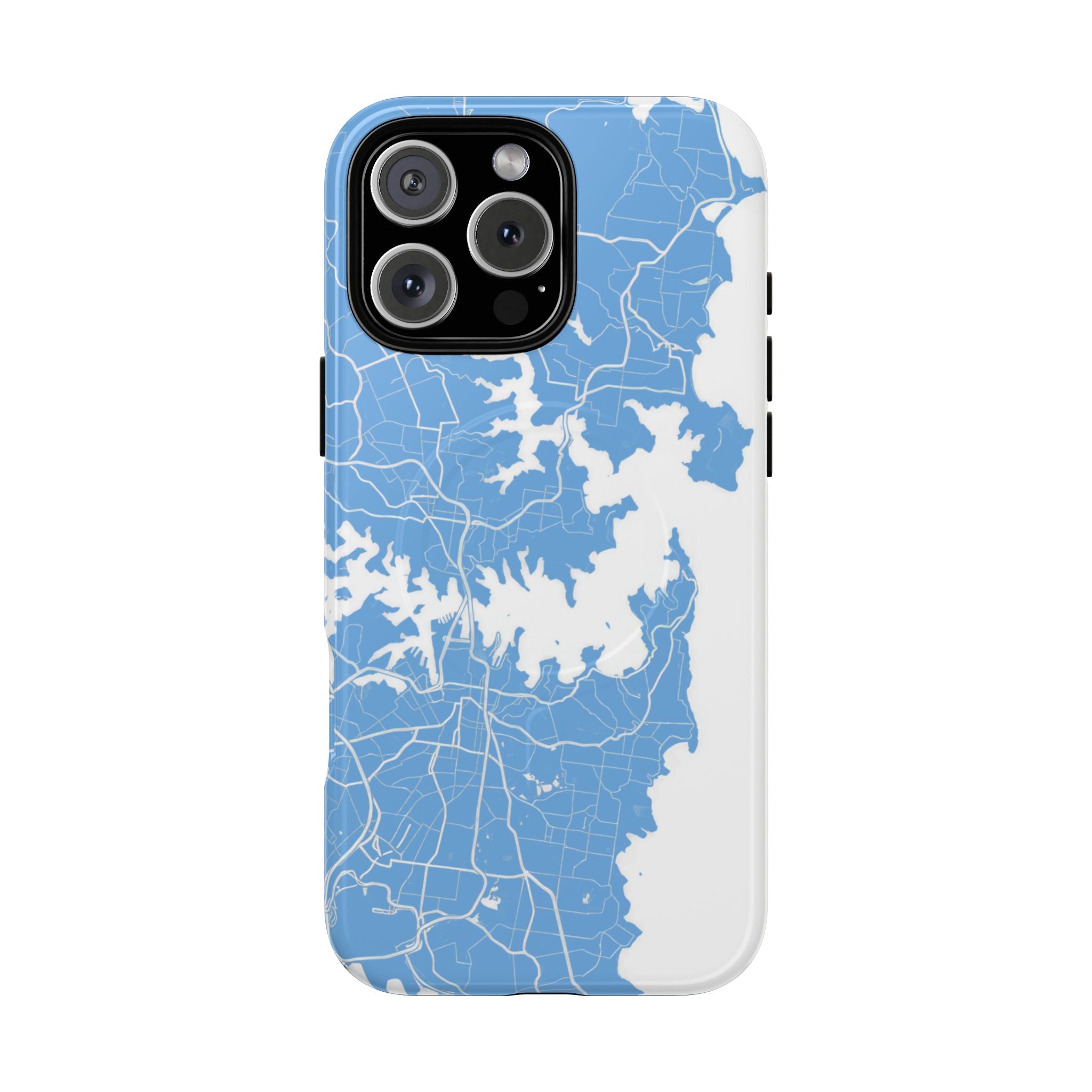 An embedded magnetic ring supports MagSafe® compatibility, allowing effortless attachment of chargers and magnetic accessories. Available in matte or glossy premium finishes, the Sydney Street Map Phone Case – Harbour Edition (Light Blue) blends dependable durability with a fresh, coastal aesthetic designed for everyday carry.