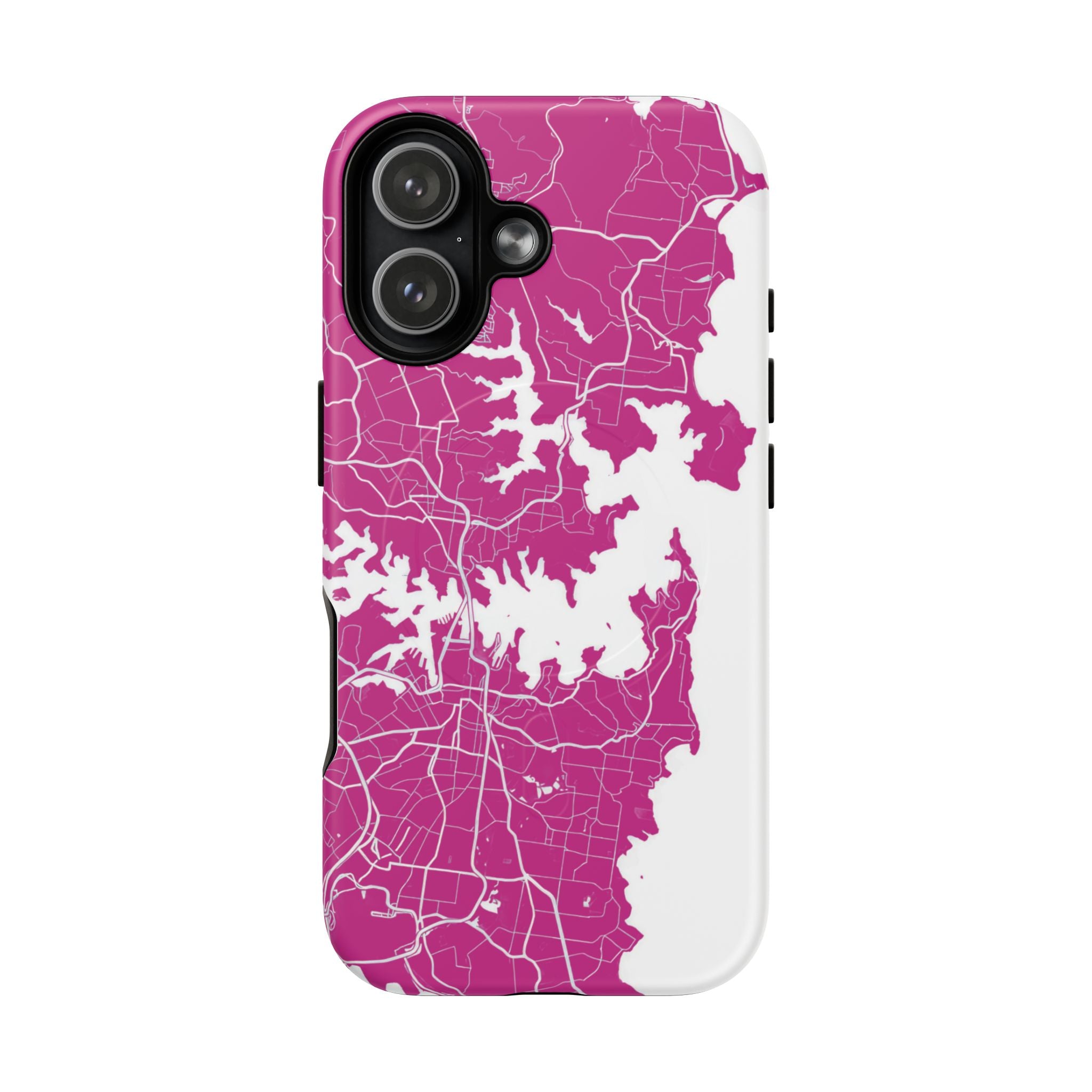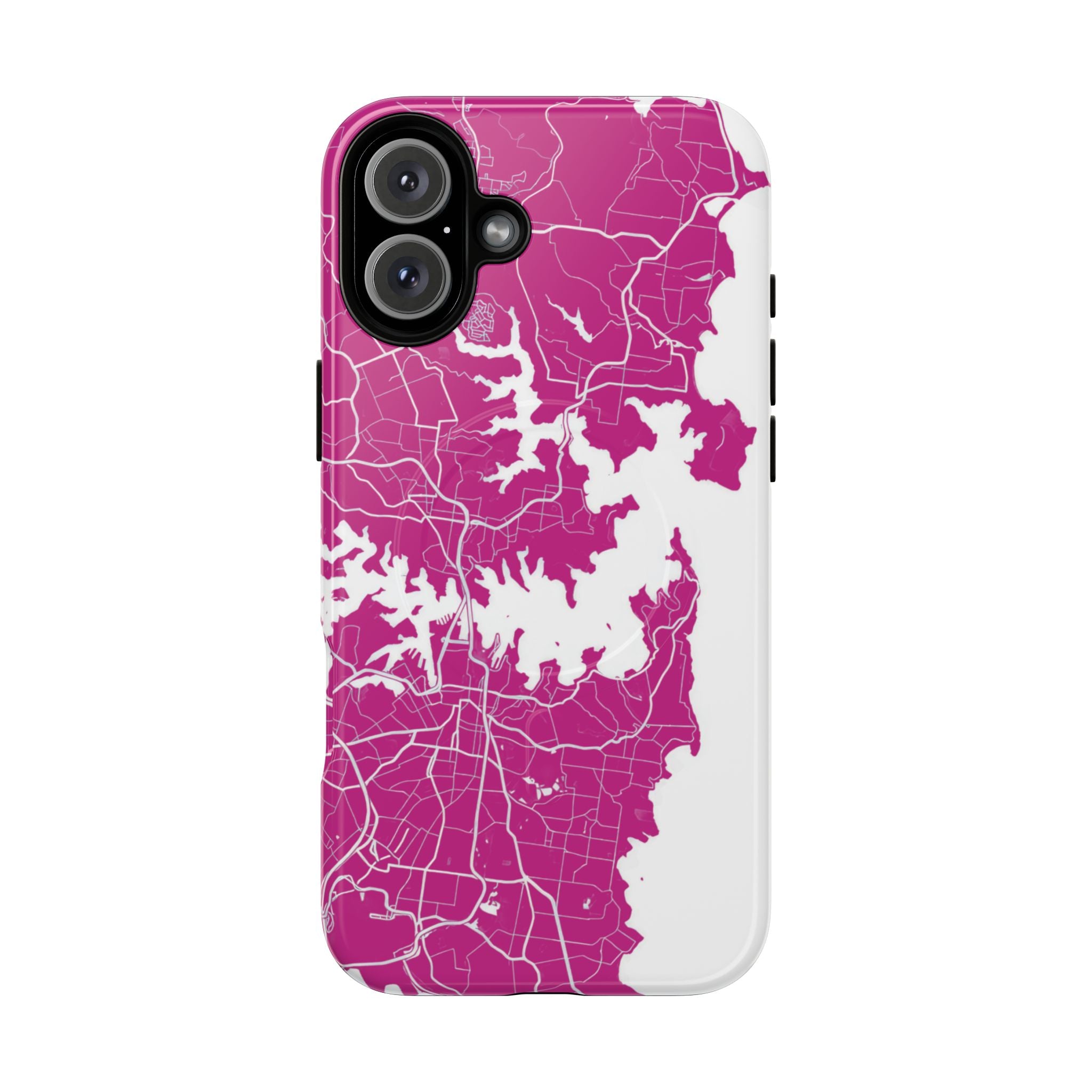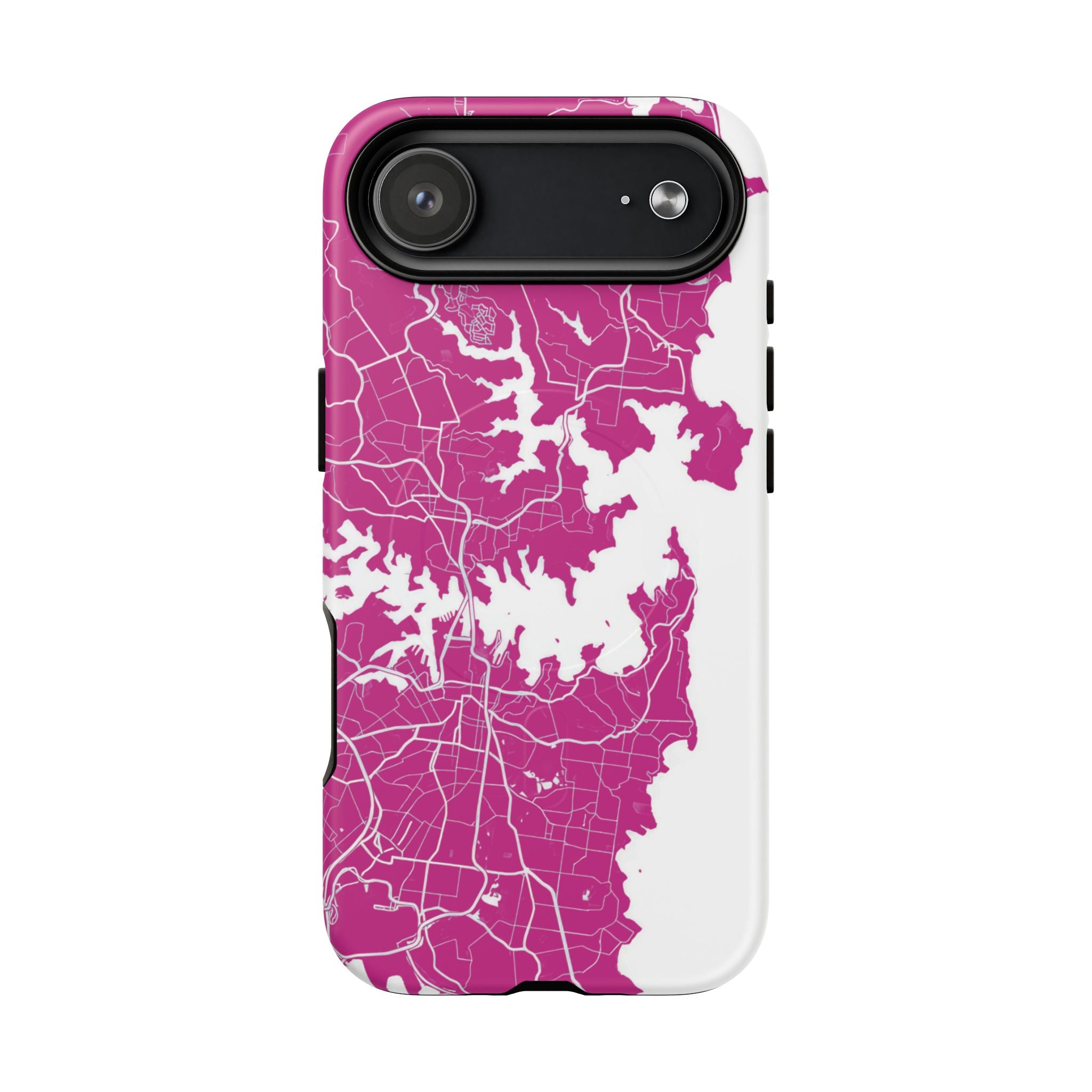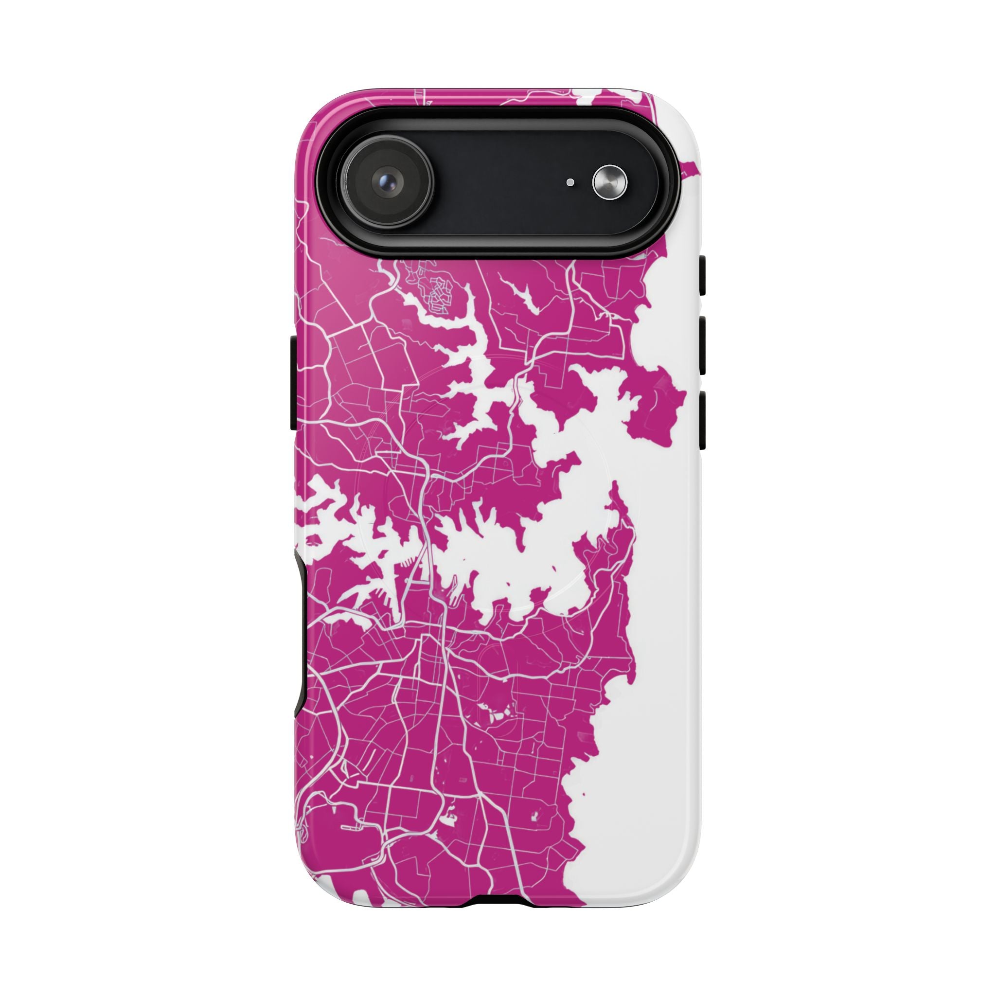An embedded magnetic ring supports MagSafe® compatibility, allowing effortless attachment of chargers and magnetic accessories. Available in matte or glossy premium finishes, the Sydney Street Map Phone Case – Harbour Edition (Pink) blends reliable durability with a bold, coastal-inspired aesthetic designed for everyday carry.