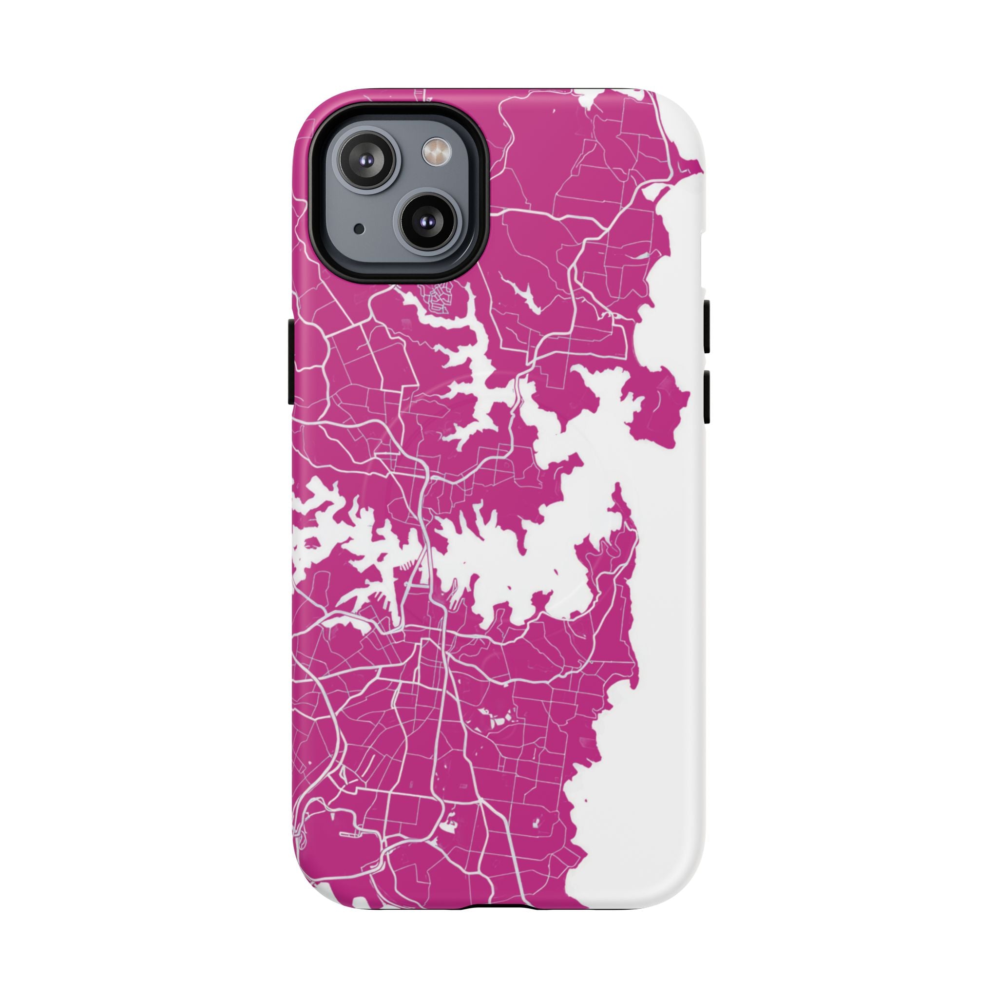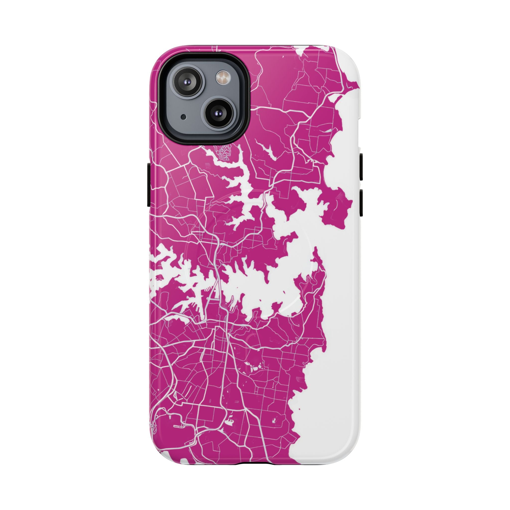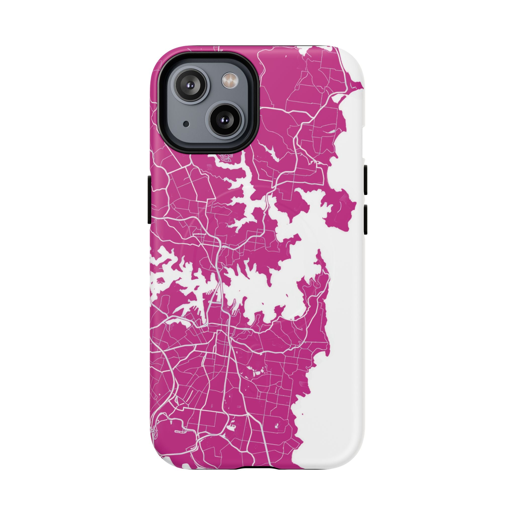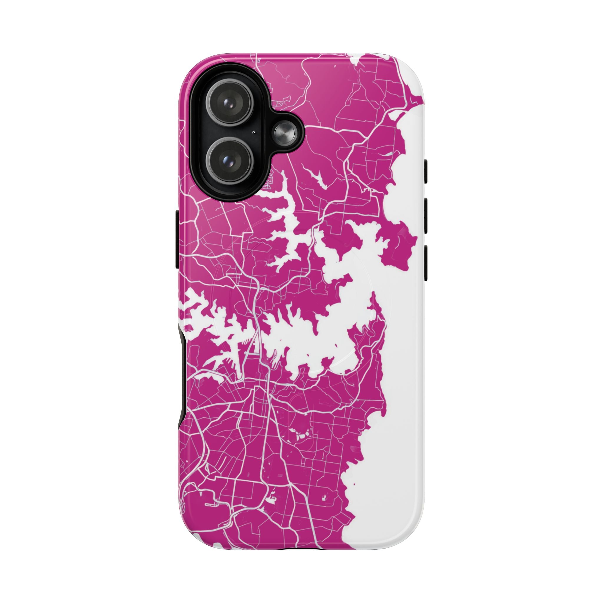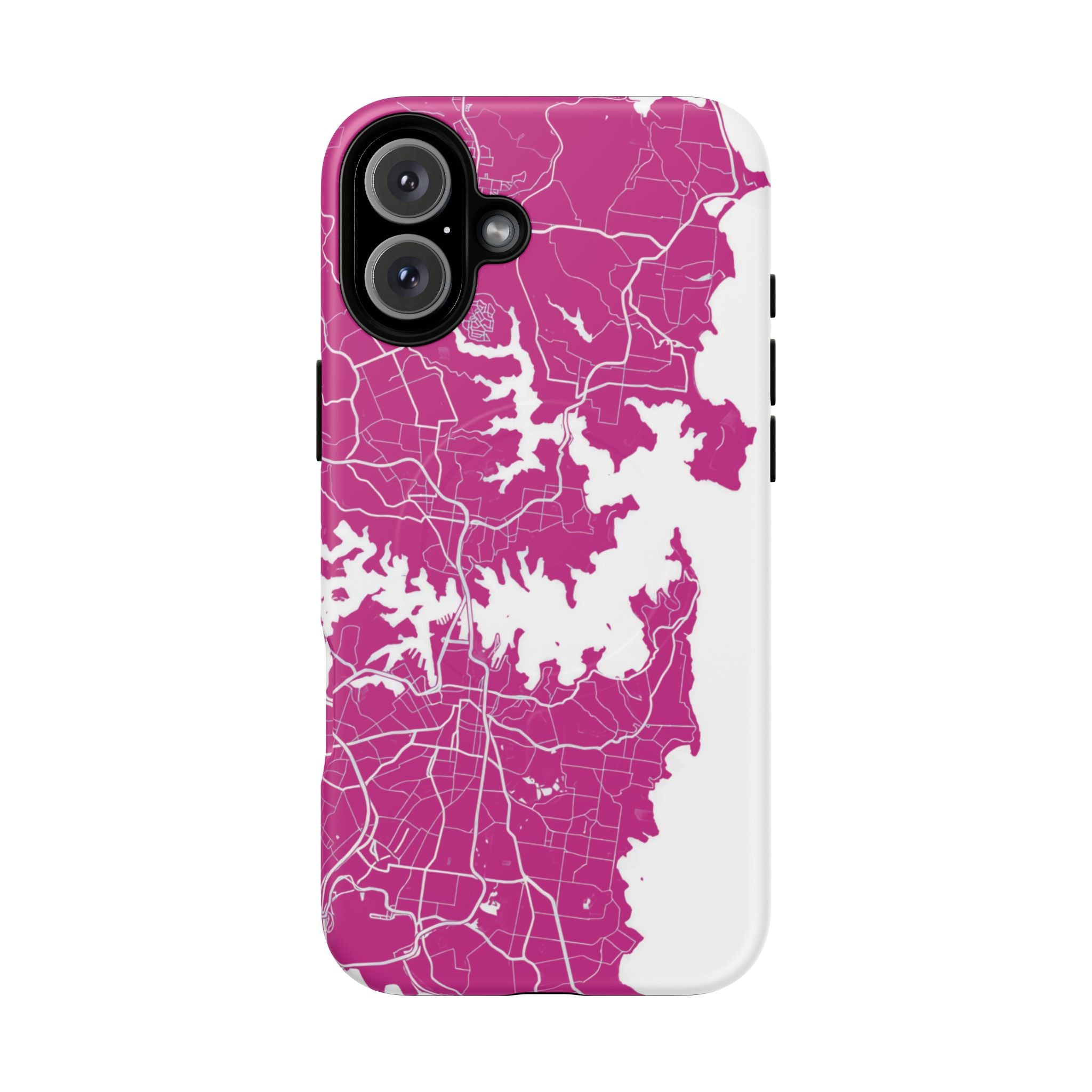 An embedded magnetic ring supports MagSafe® compatibility, allowing effortless attachment of chargers and magnetic accessories. Available in matte or glossy premium finishes, the Sydney Street Map Phone Case – Harbour Edition (Pink) blends reliable durability with a bold, coastal-inspired aesthetic designed for everyday carry.