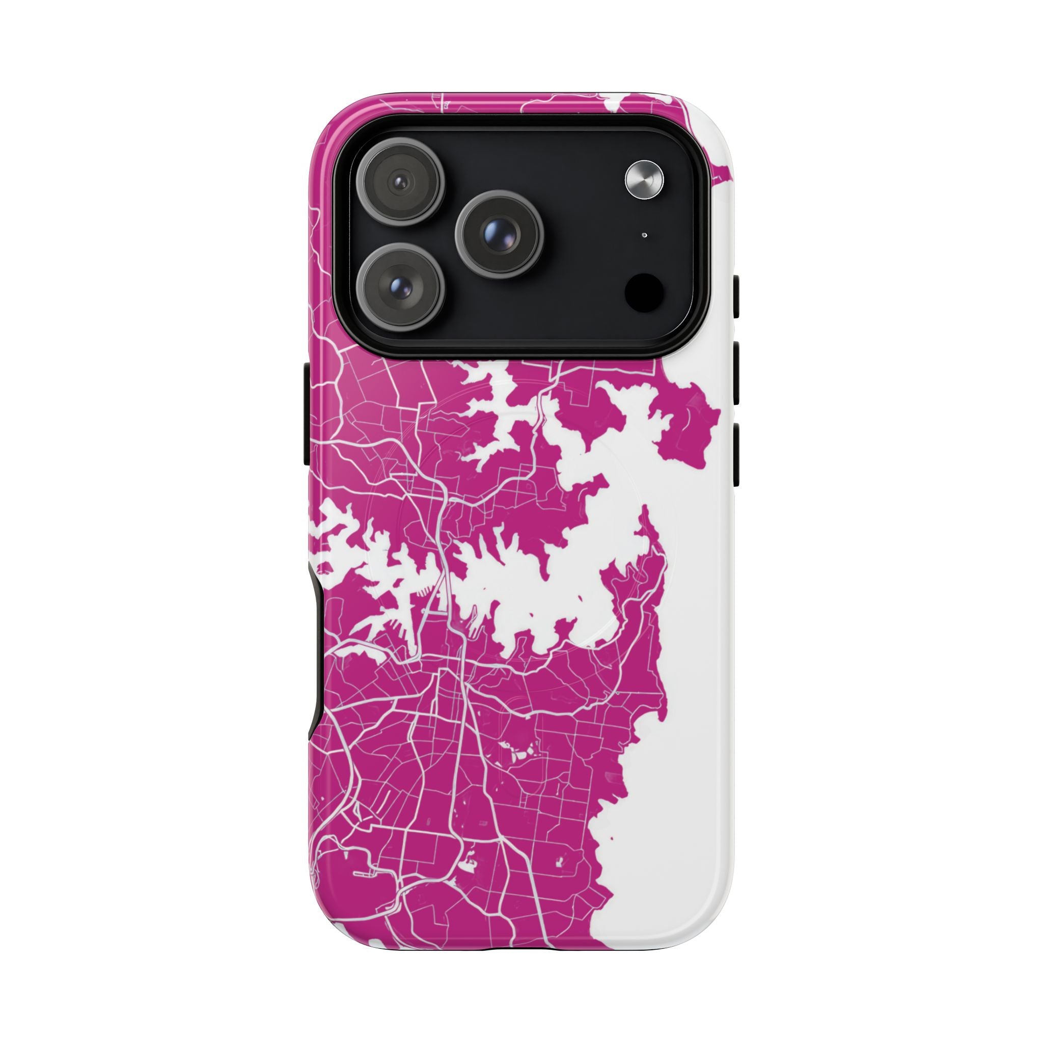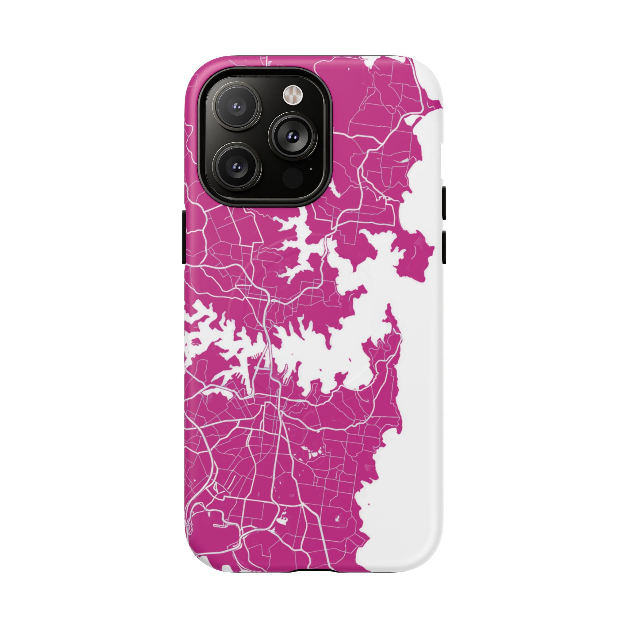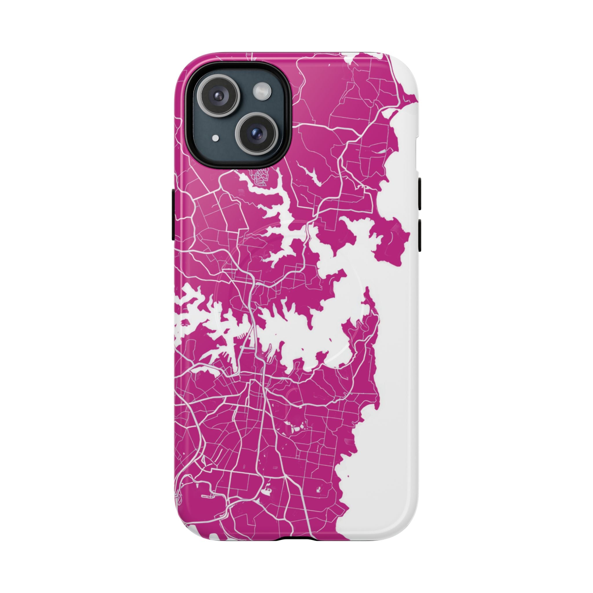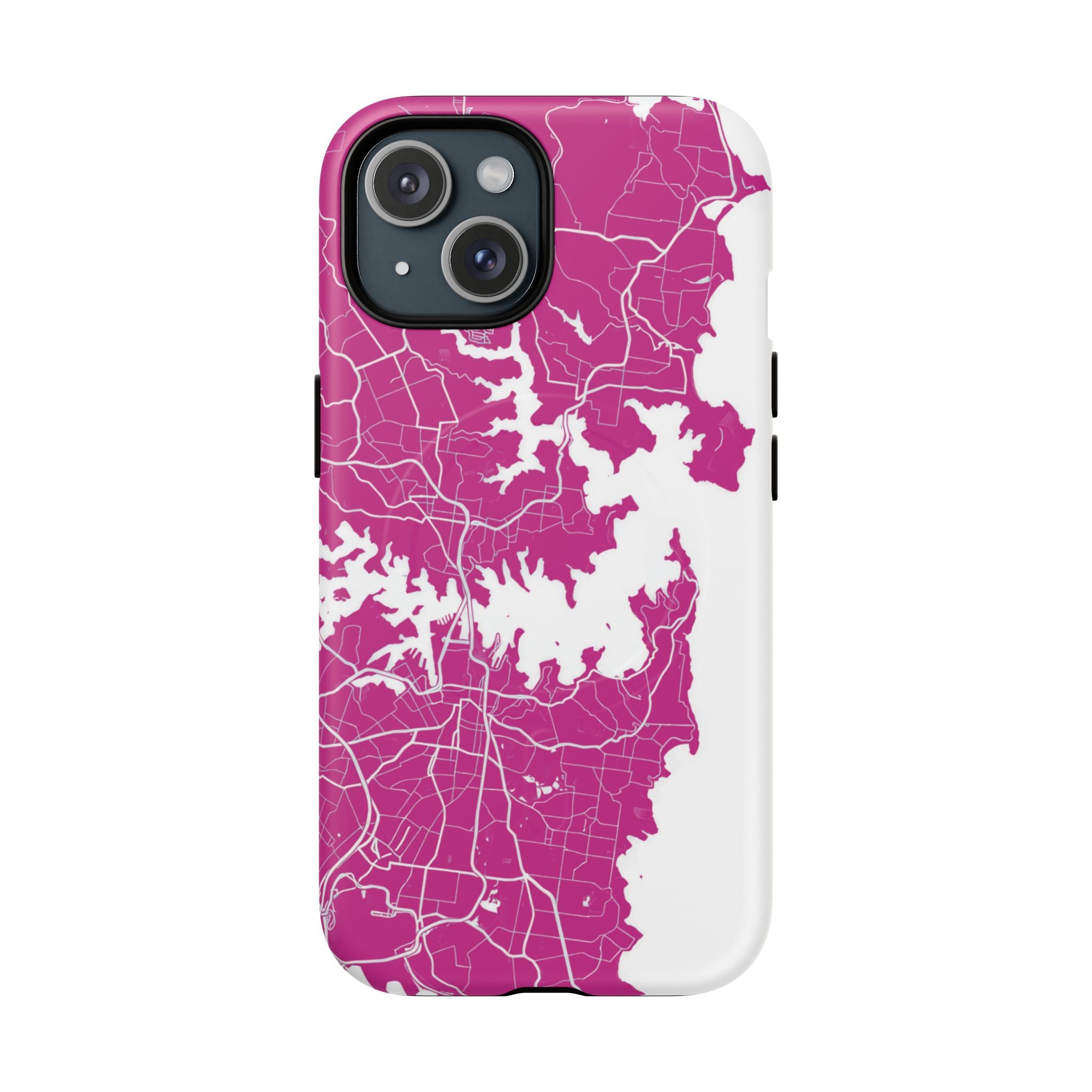 An embedded magnetic ring supports MagSafe® compatibility, allowing effortless attachment of chargers and magnetic accessories. Available in matte or glossy premium finishes, the Sydney Street Map Phone Case – Harbour Edition (Pink) blends reliable durability with a bold, coastal-inspired aesthetic designed for everyday carry.
