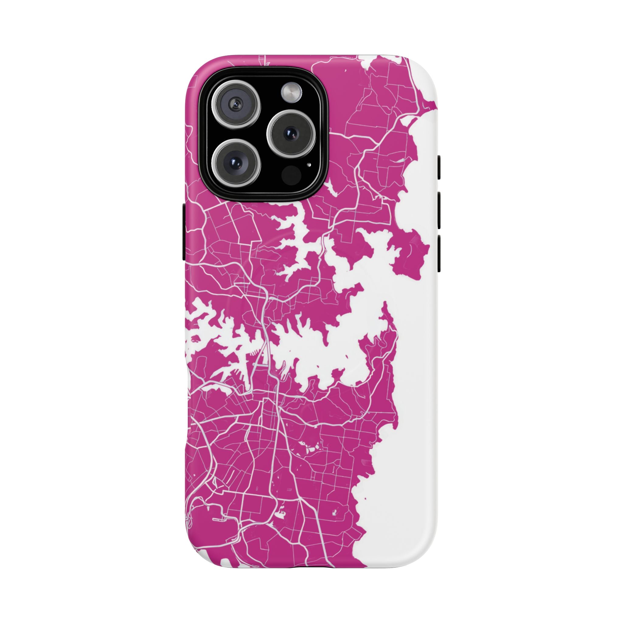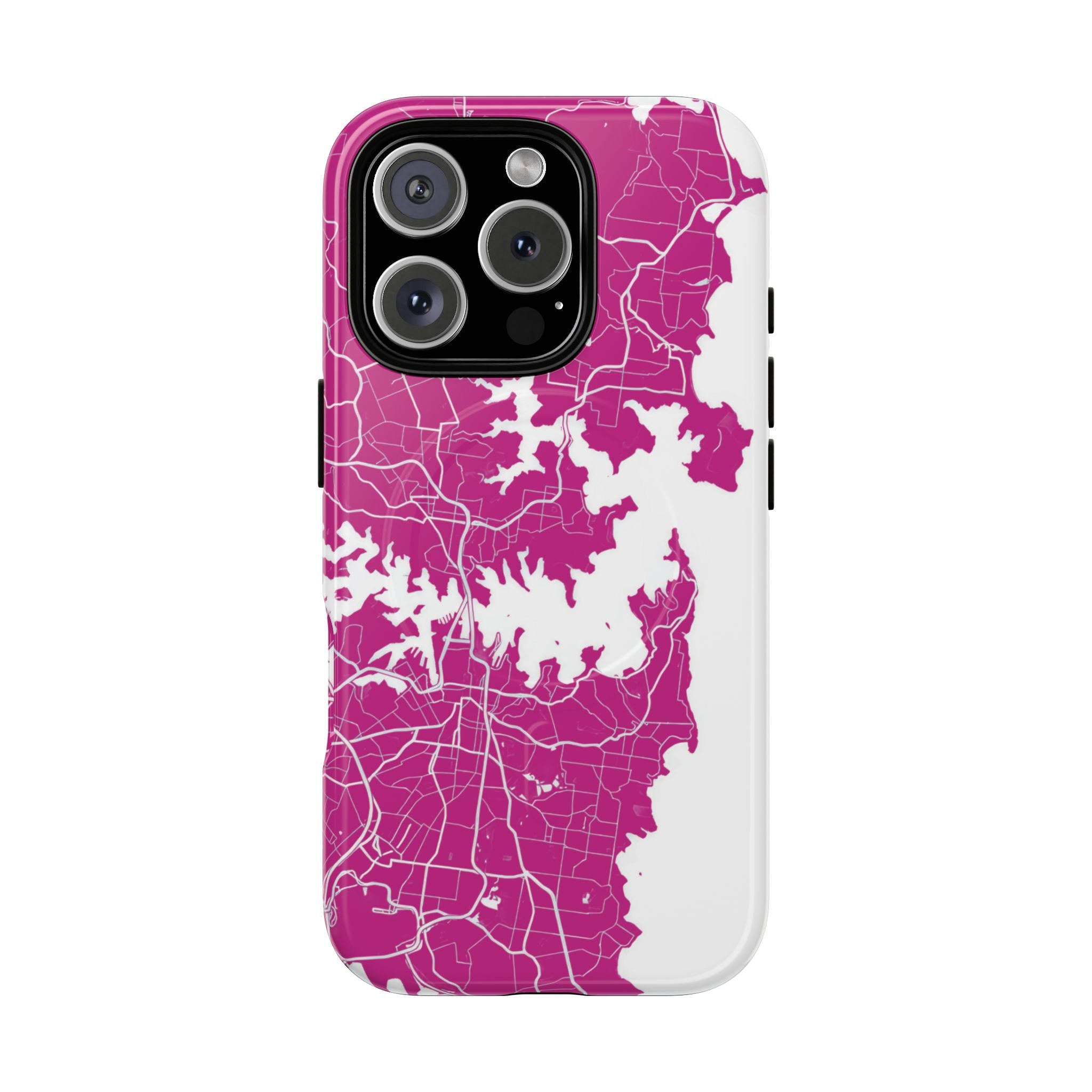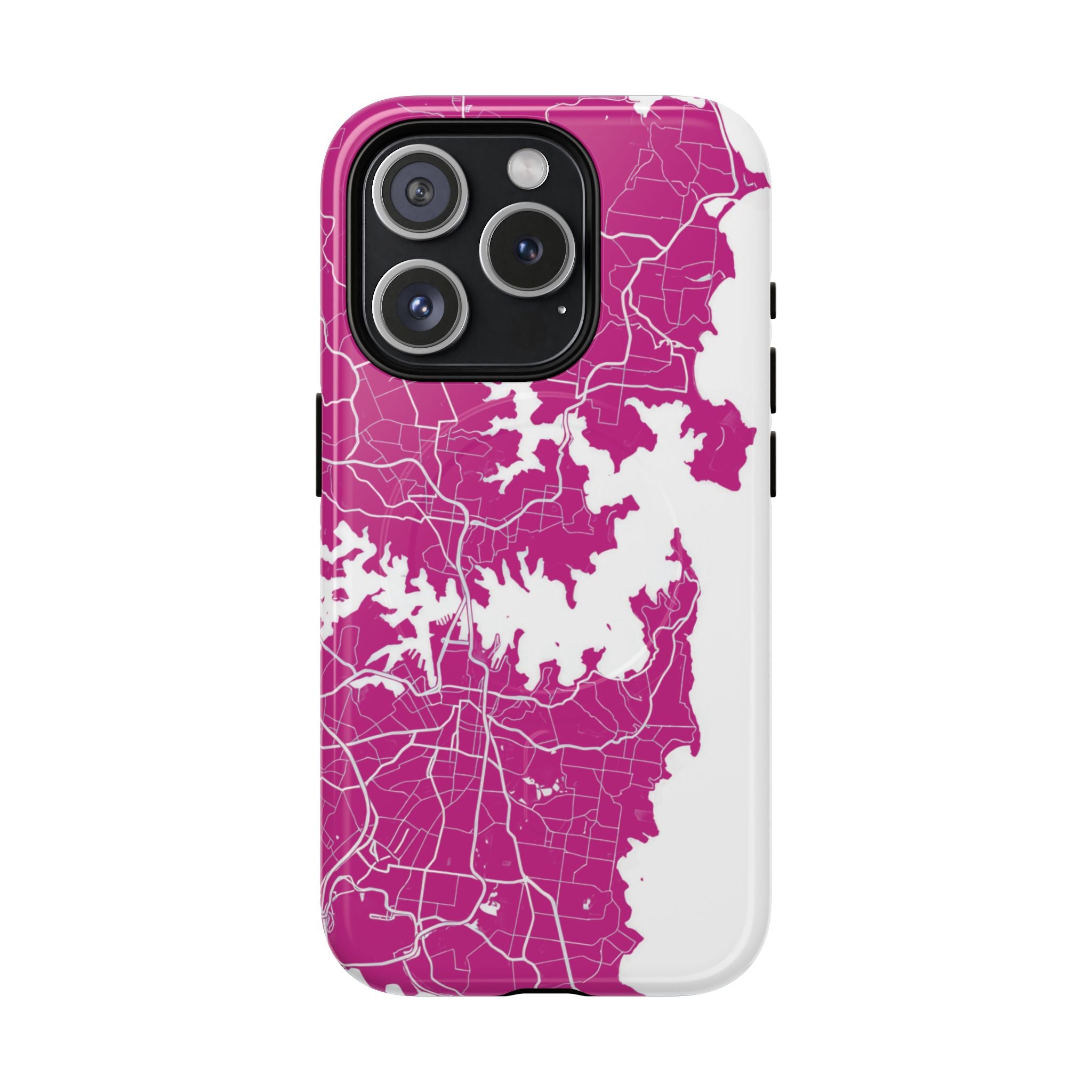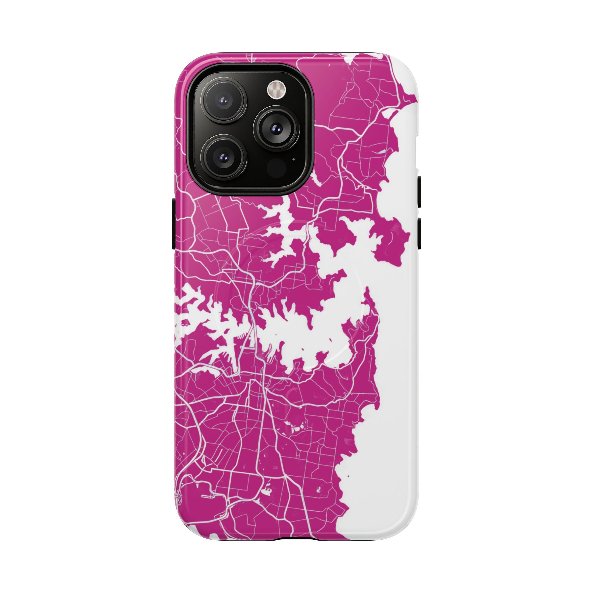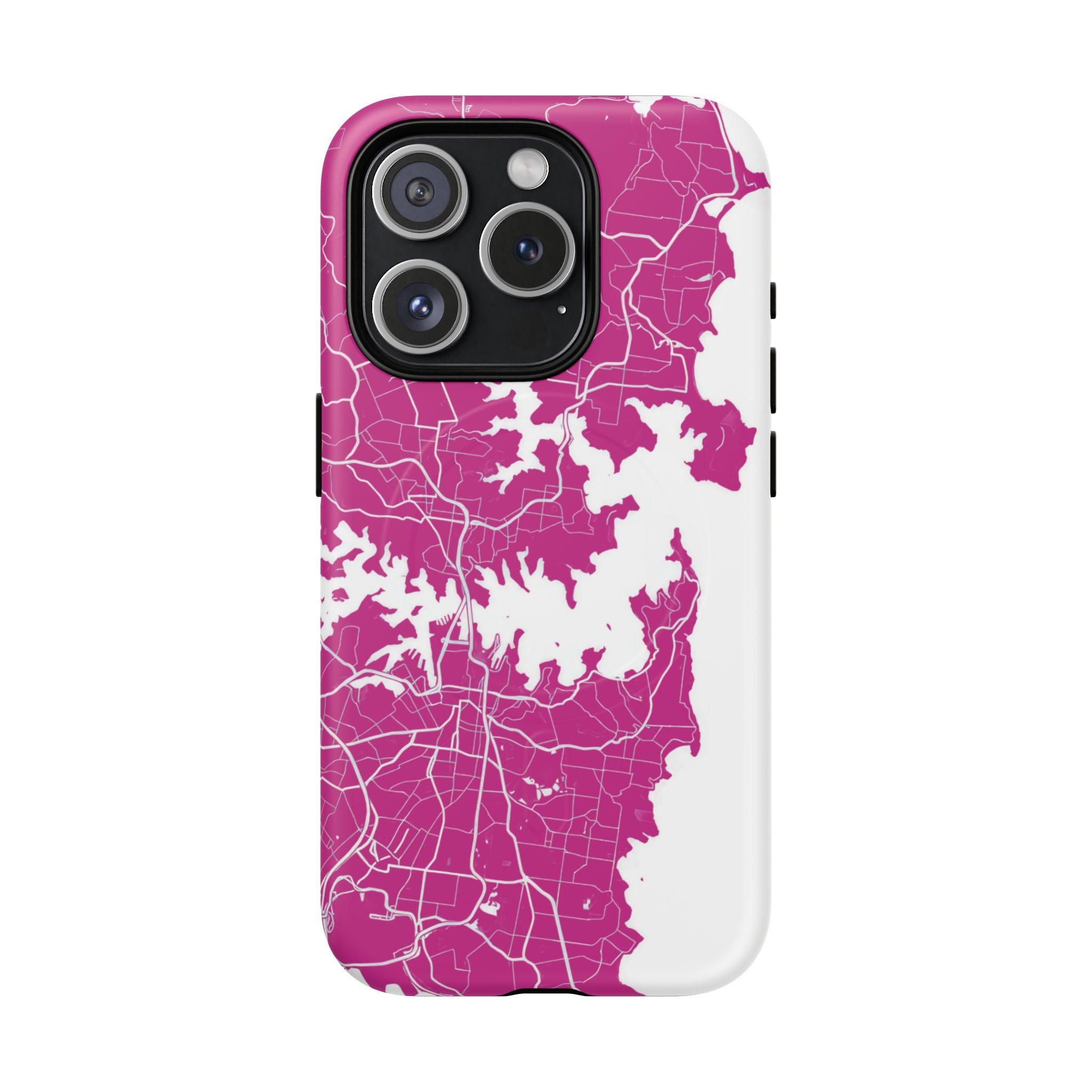 An embedded magnetic ring supports MagSafe® compatibility, allowing effortless attachment of chargers and magnetic accessories. Available in matte or glossy premium finishes, the Sydney Street Map Phone Case – Harbour Edition (Pink) blends reliable durability with a bold, coastal-inspired aesthetic designed for everyday carry.