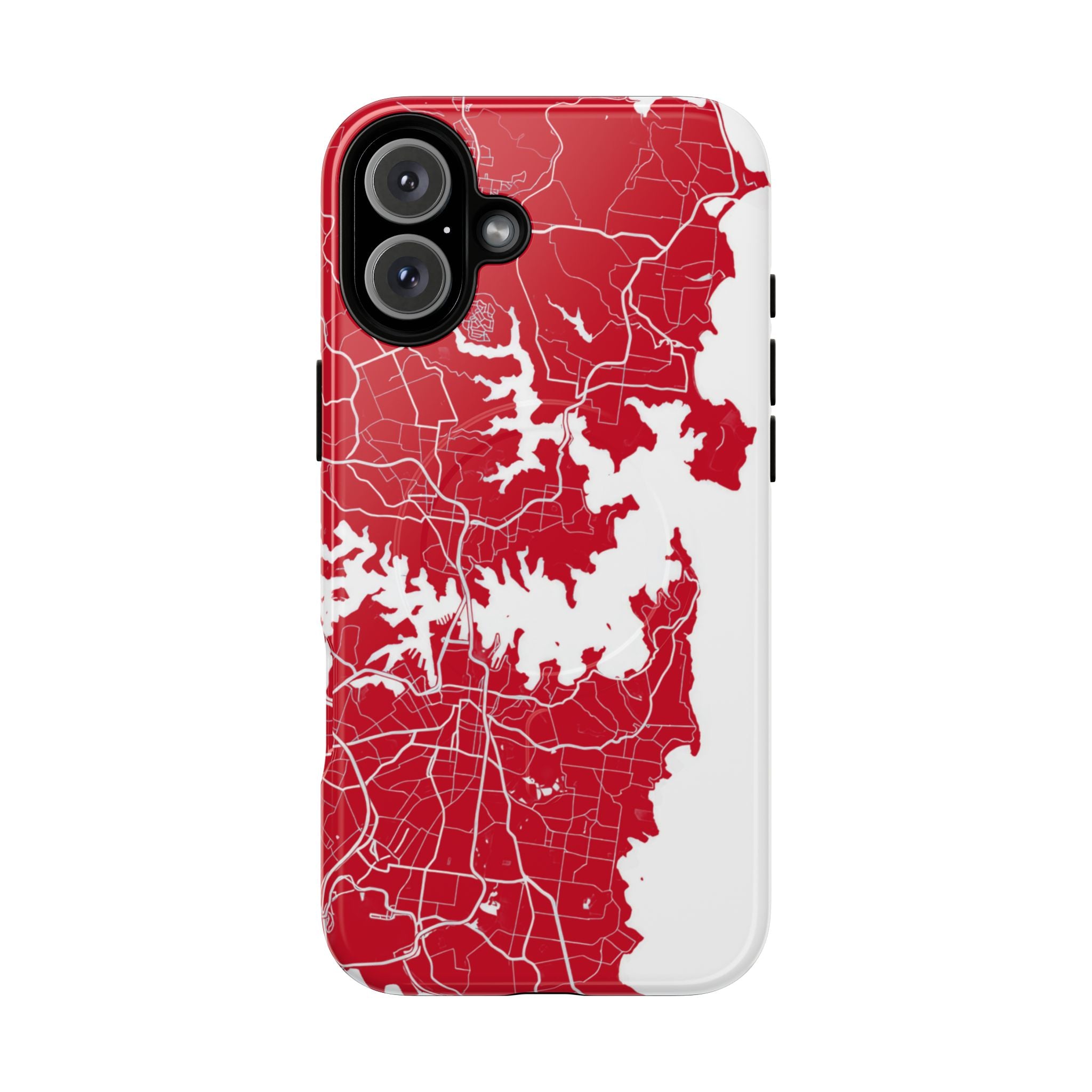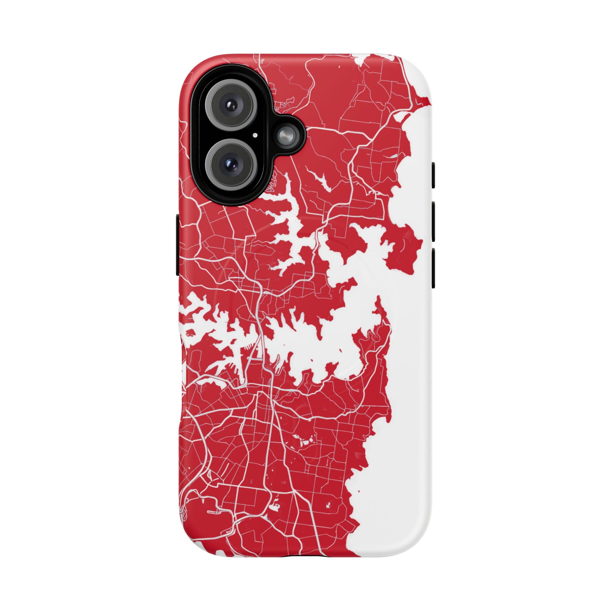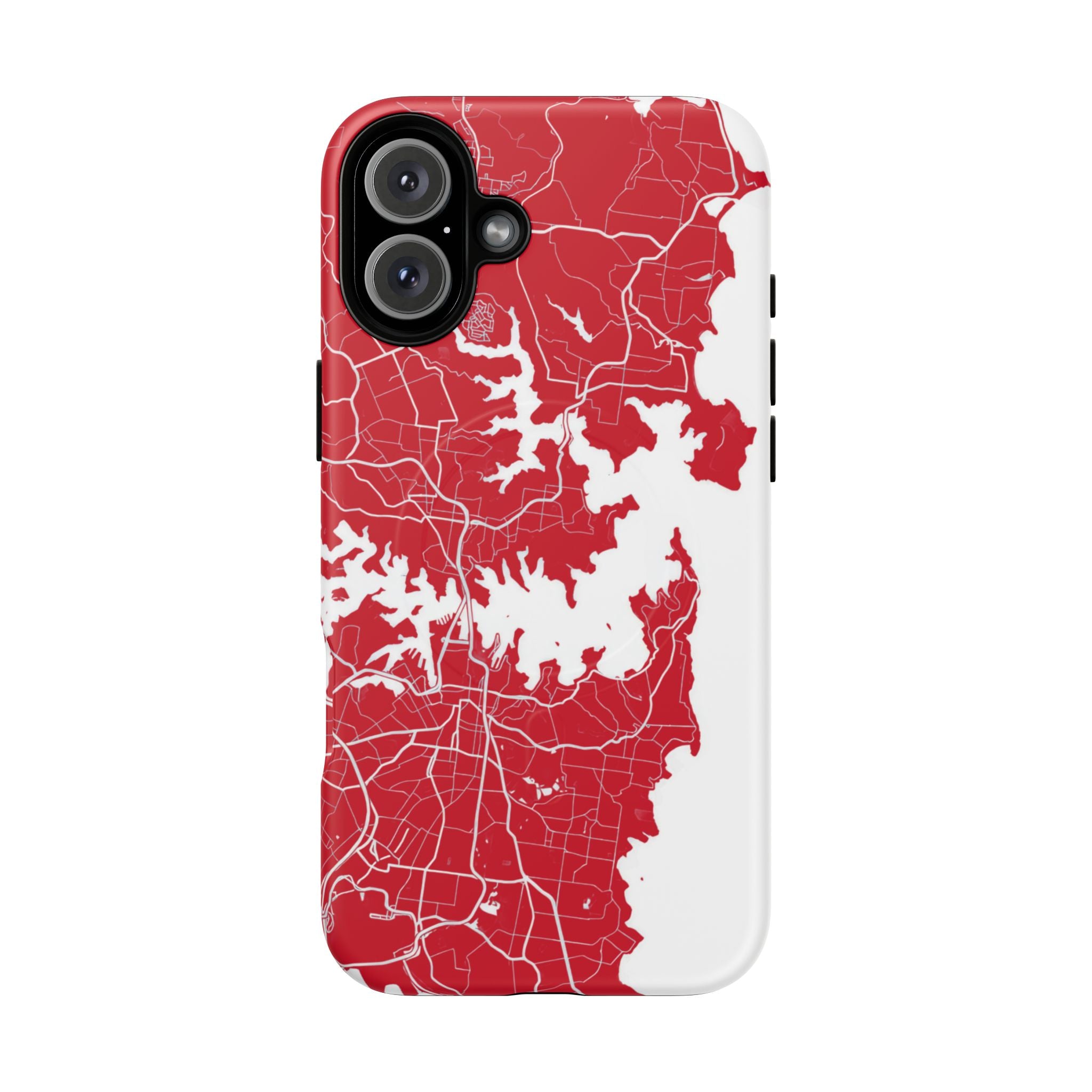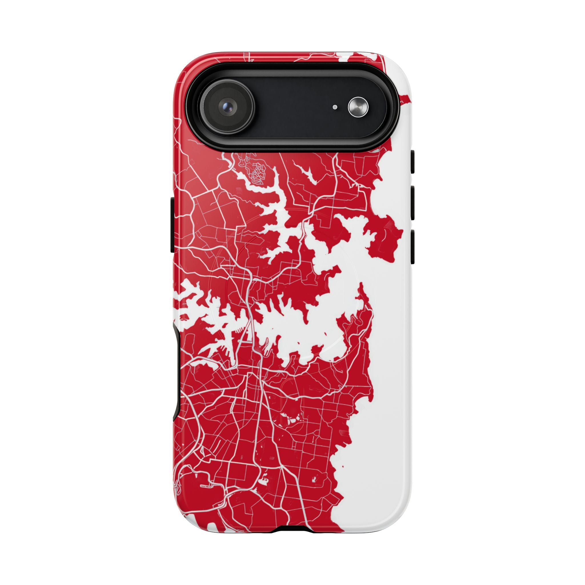 An embedded magnetic ring supports MagSafe® compatibility, allowing effortless attachment of chargers and magnetic accessories. Available in matte or glossy premium finishes, the Sydney Street Map Phone Case – Harbour Edition (Red) blends reliable durability with a bold, coastal-inspired aesthetic designed for everyday carry.