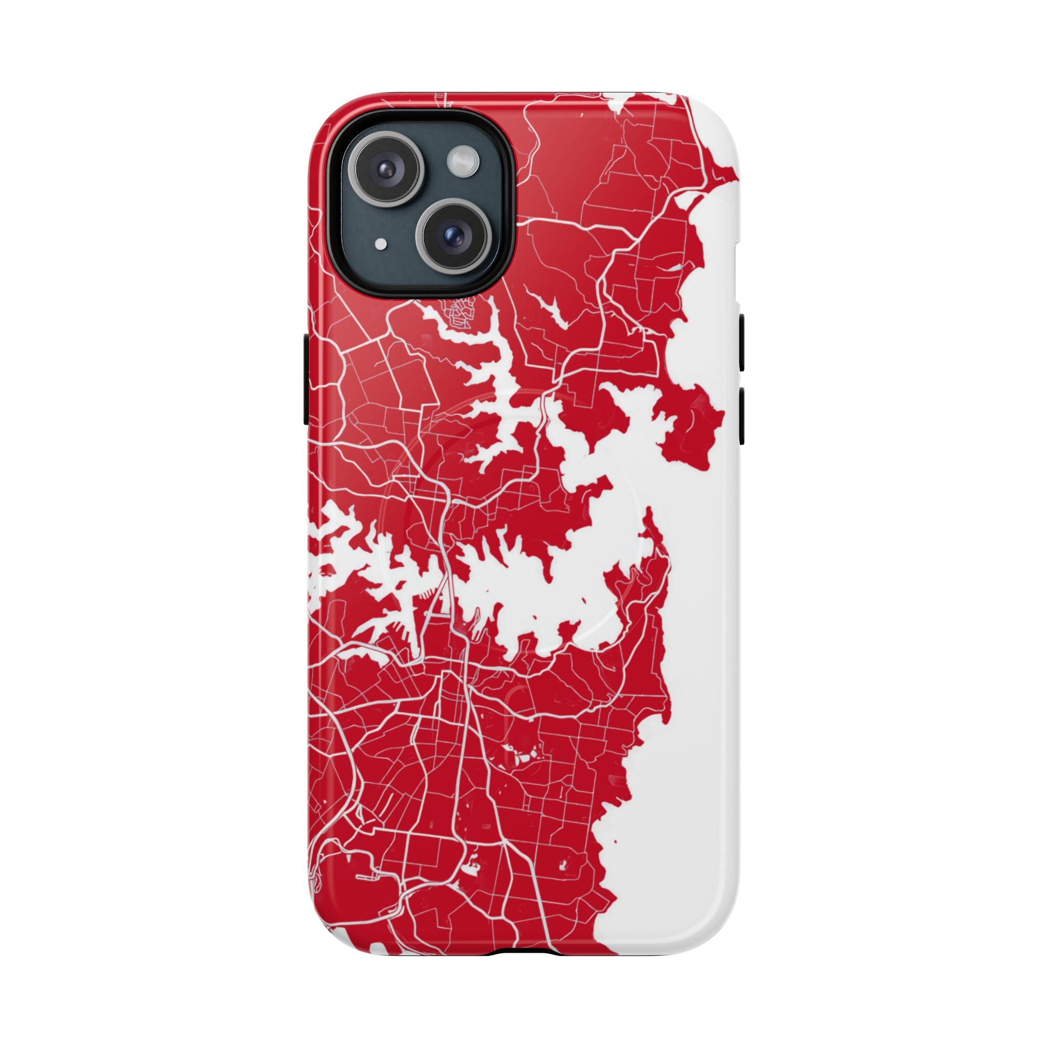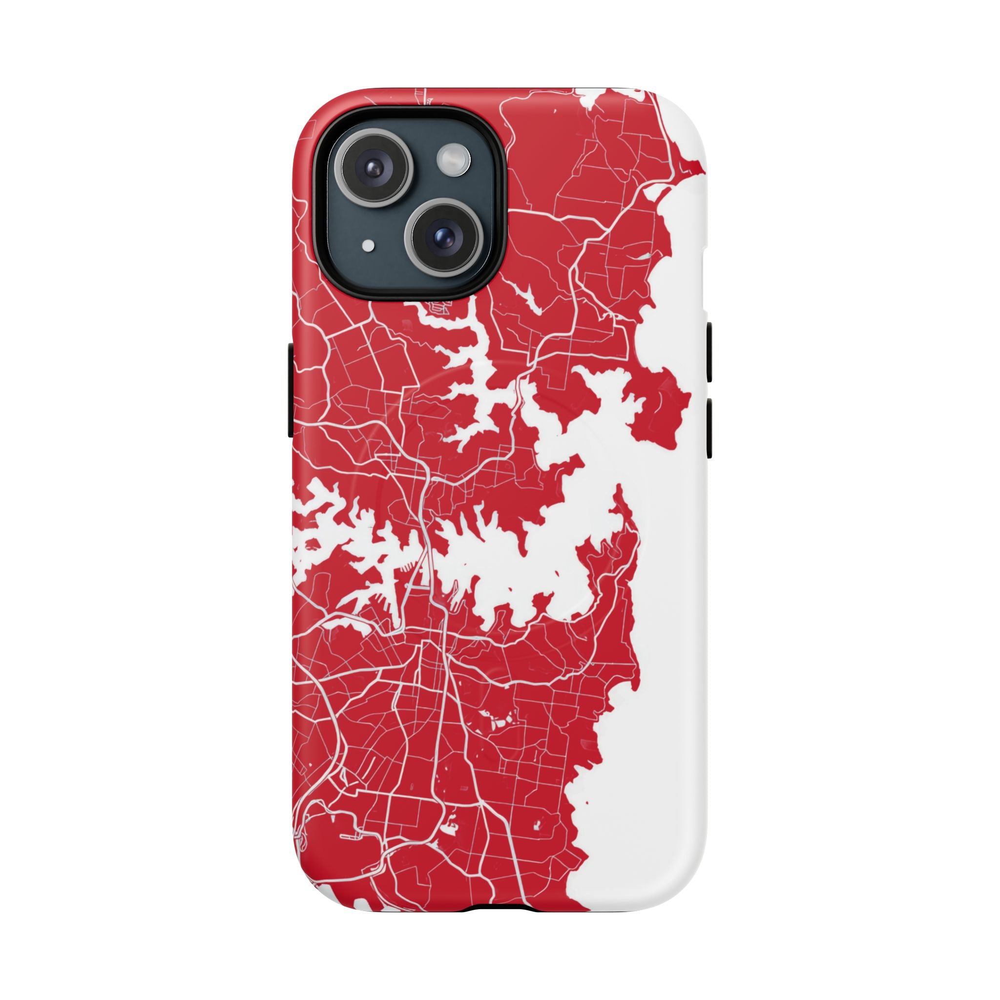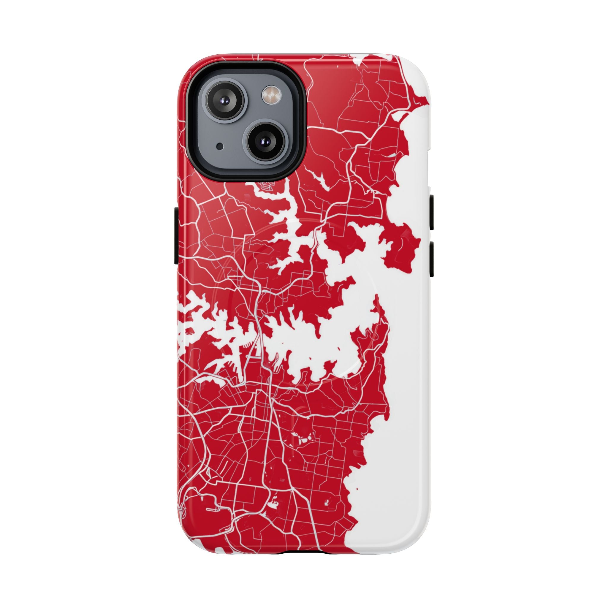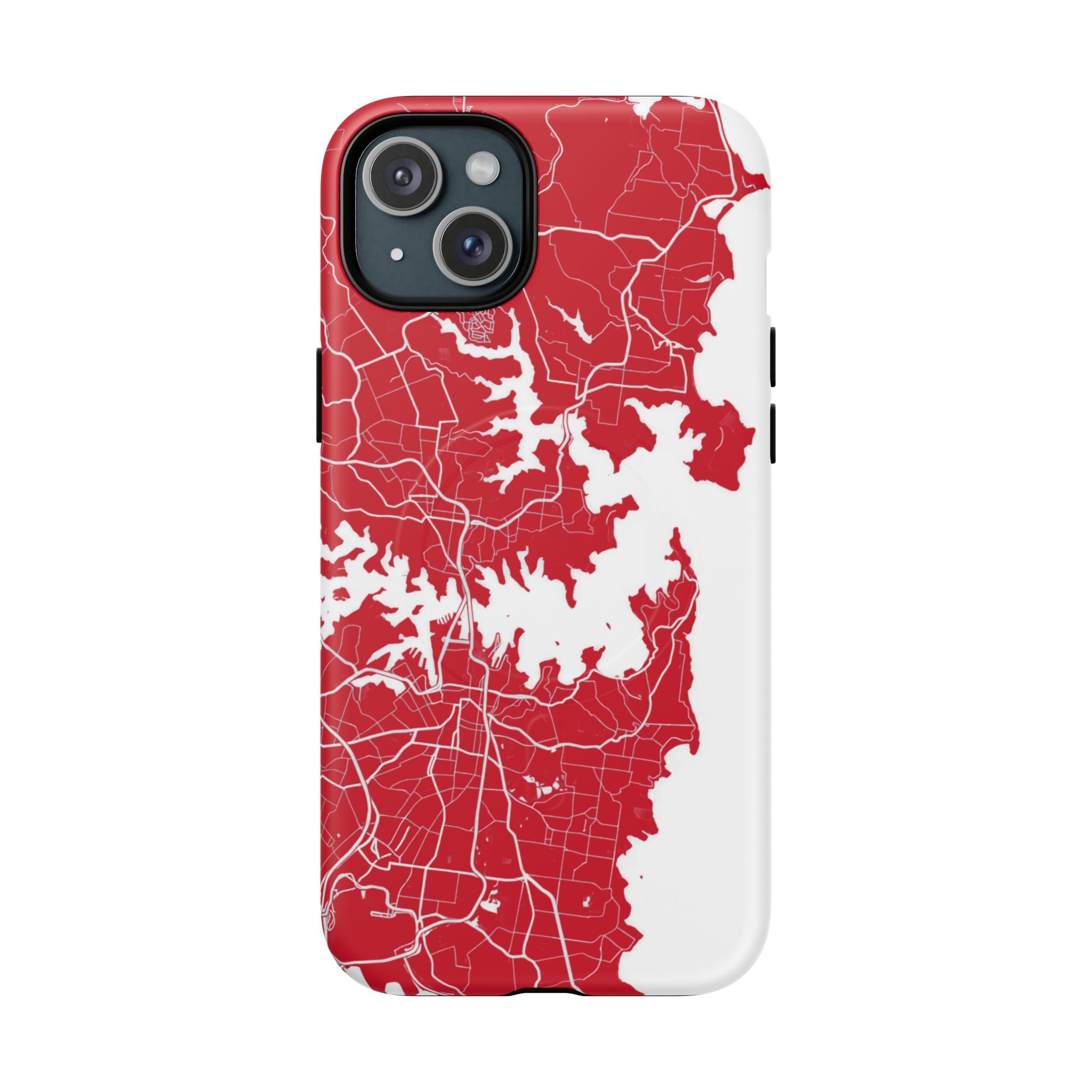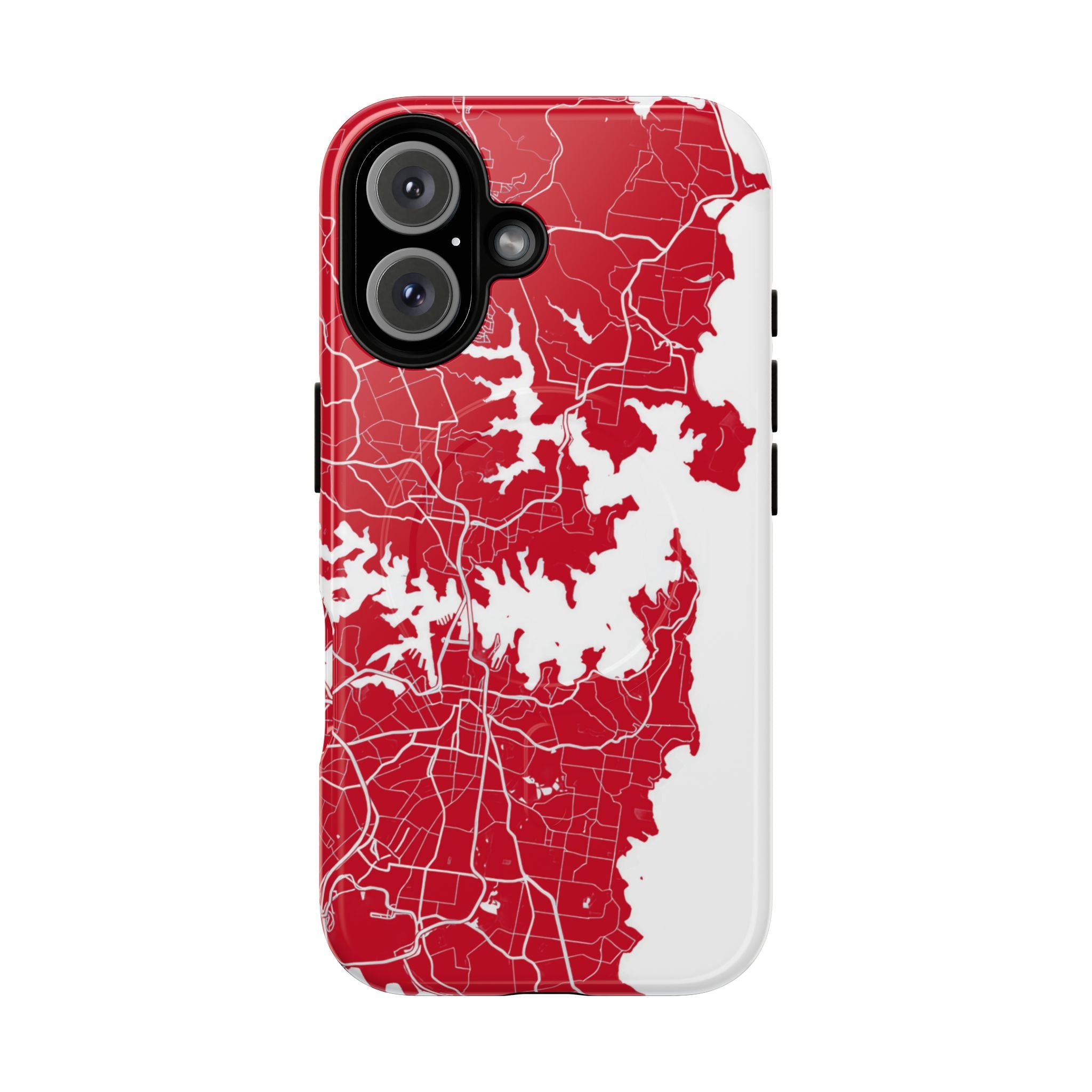 An embedded magnetic ring supports MagSafe® compatibility, allowing effortless attachment of chargers and magnetic accessories. Available in matte or glossy premium finishes, the Sydney Street Map Phone Case – Harbour Edition (Red) blends reliable durability with a bold, coastal-inspired aesthetic designed for everyday carry.