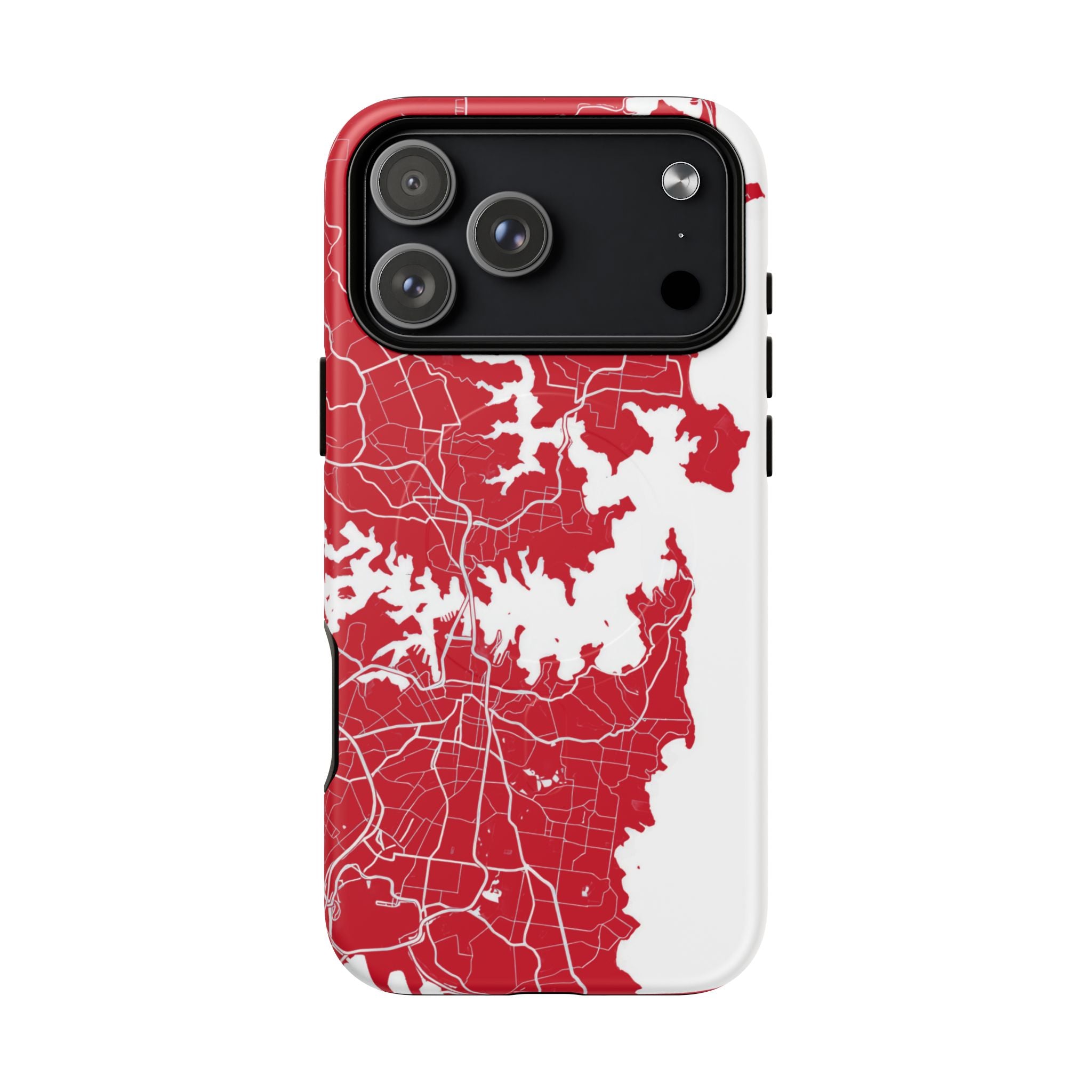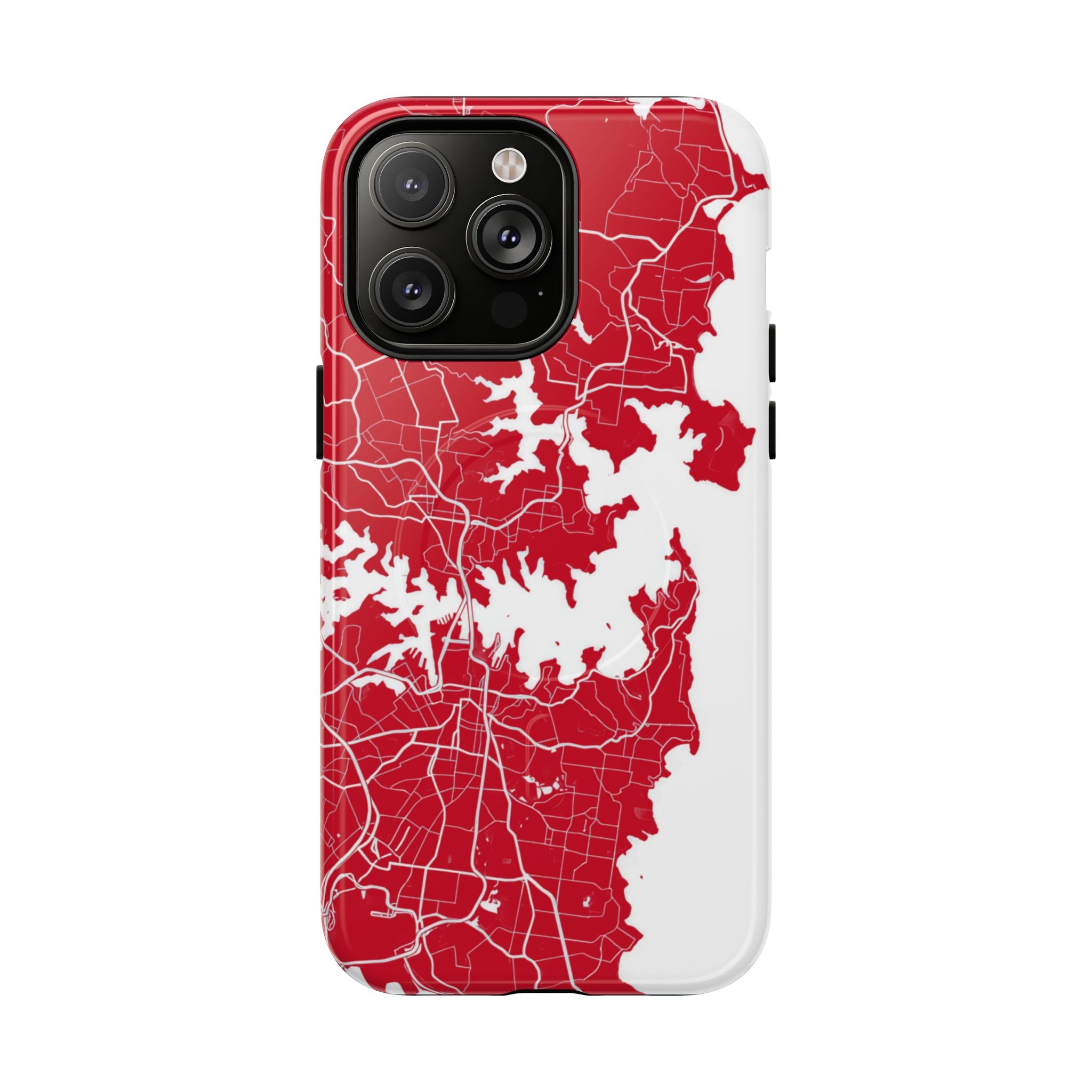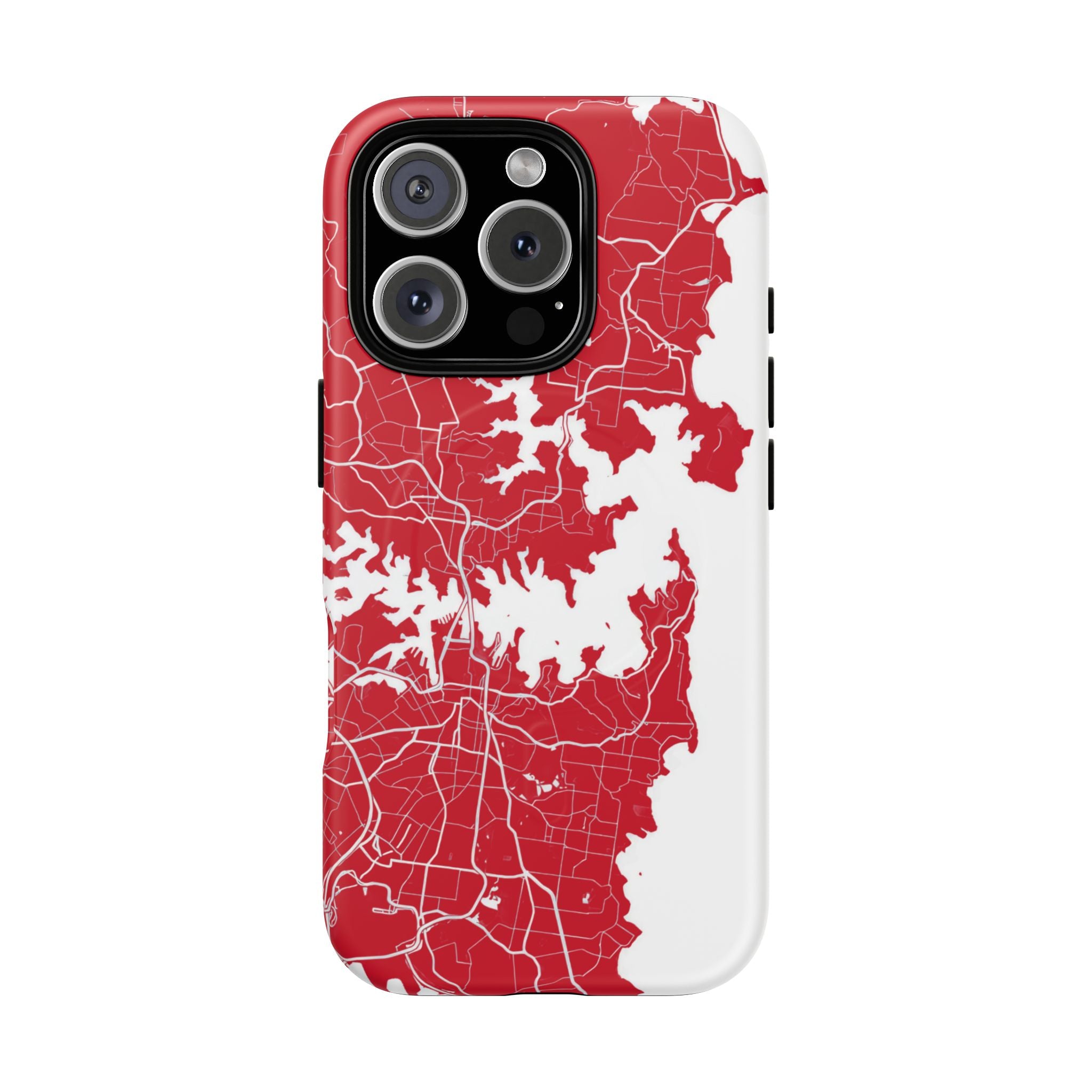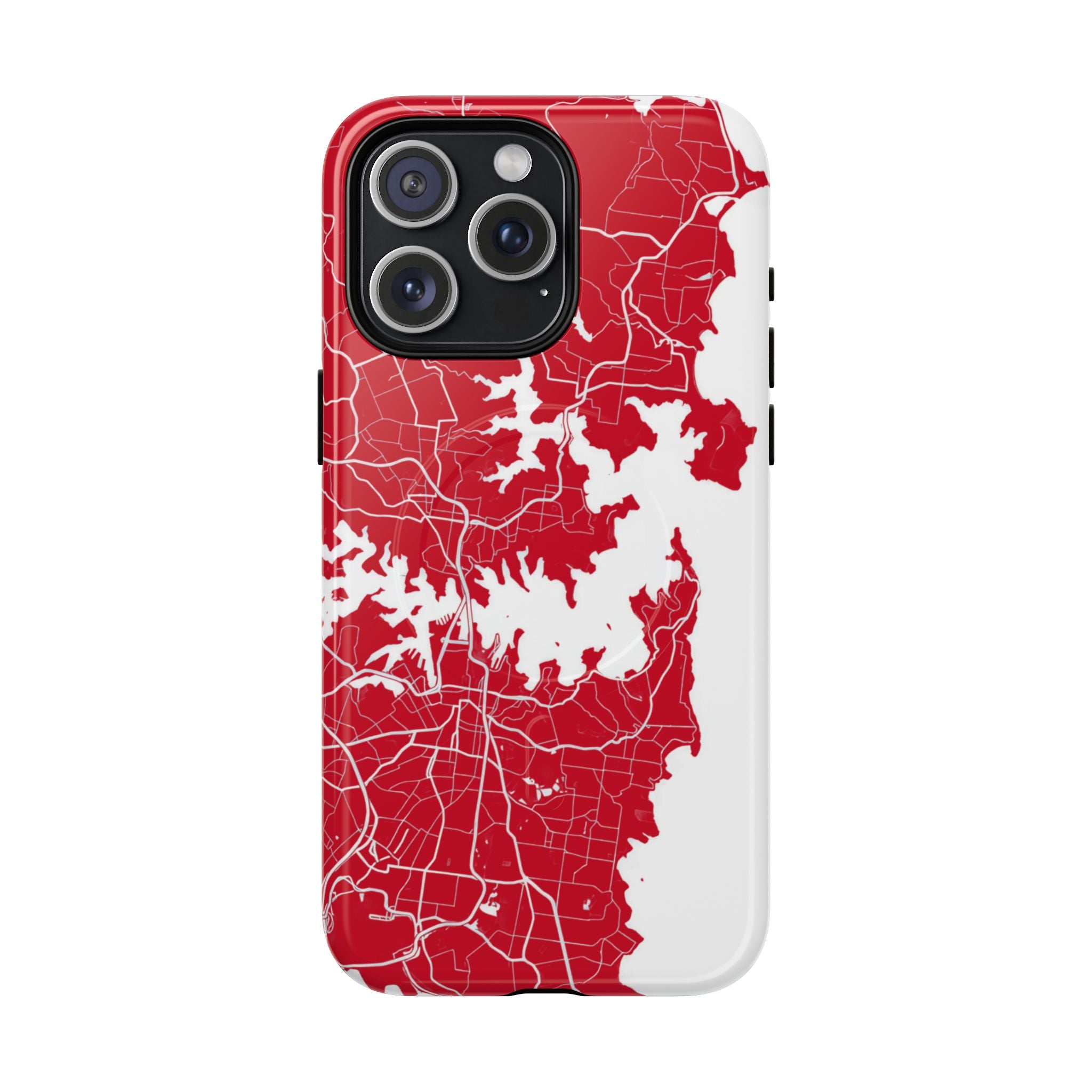 An embedded magnetic ring supports MagSafe® compatibility, allowing effortless attachment of chargers and magnetic accessories. Available in matte or glossy premium finishes, the Sydney Street Map Phone Case – Harbour Edition (Red) blends reliable durability with a bold, coastal-inspired aesthetic designed for everyday carry.