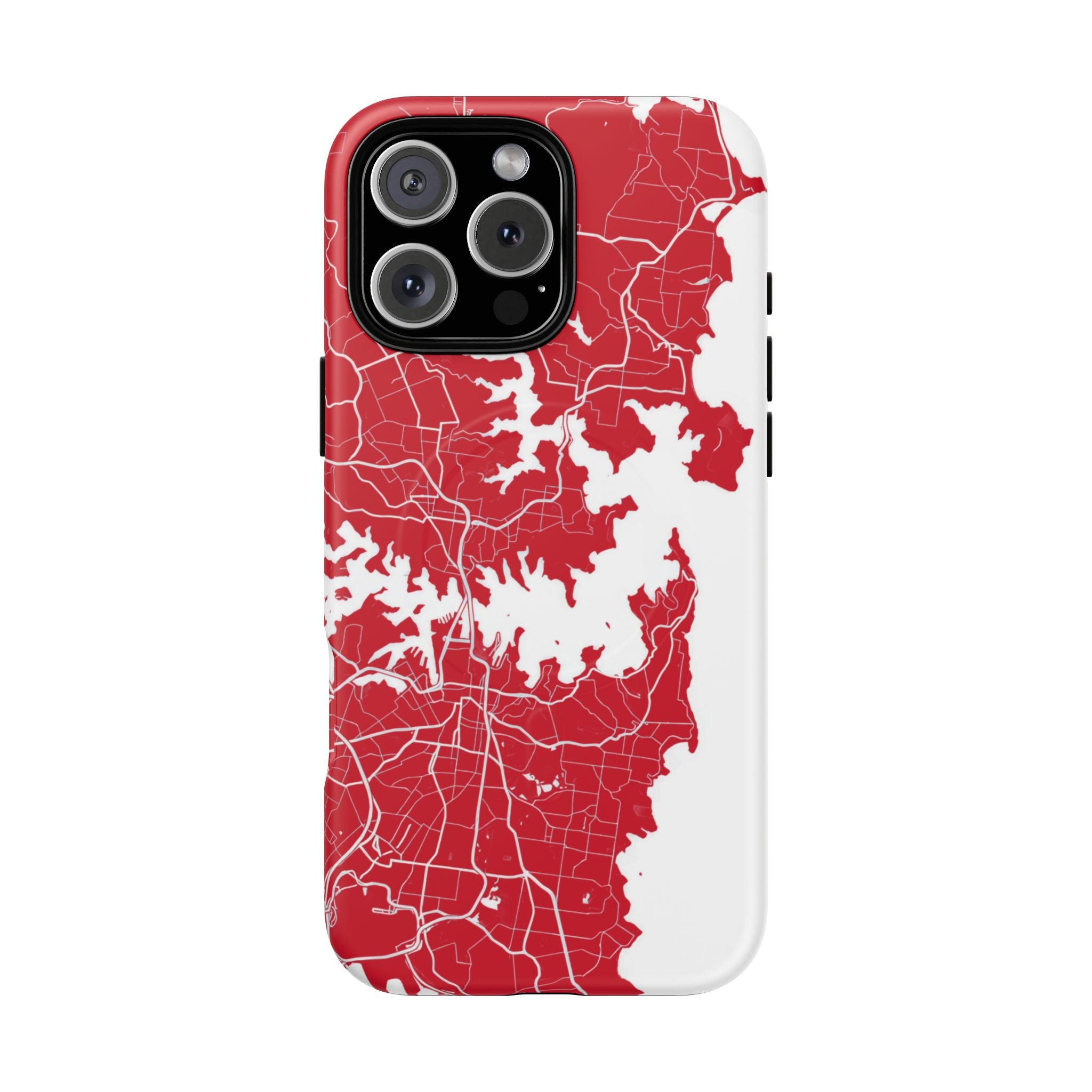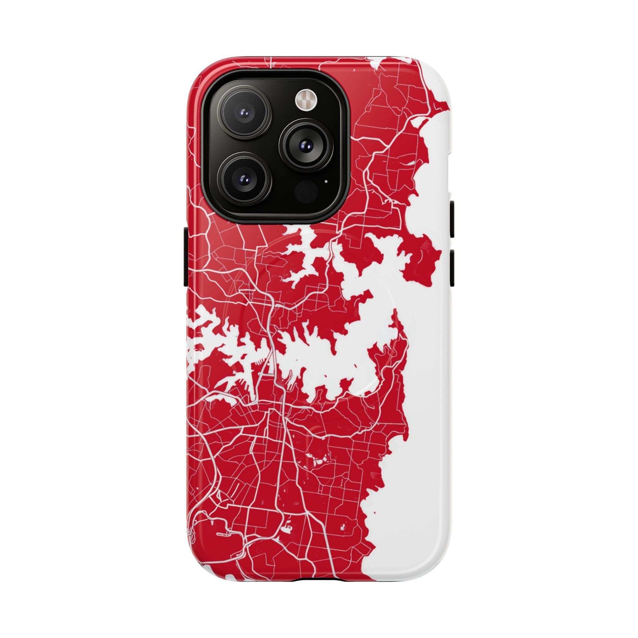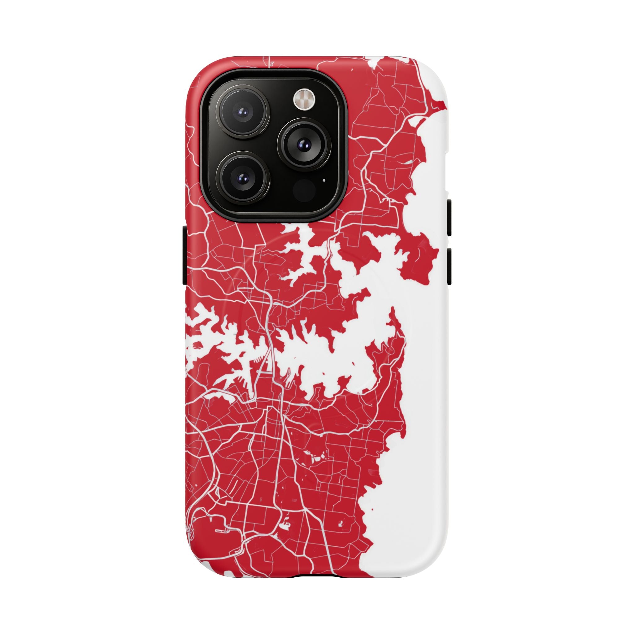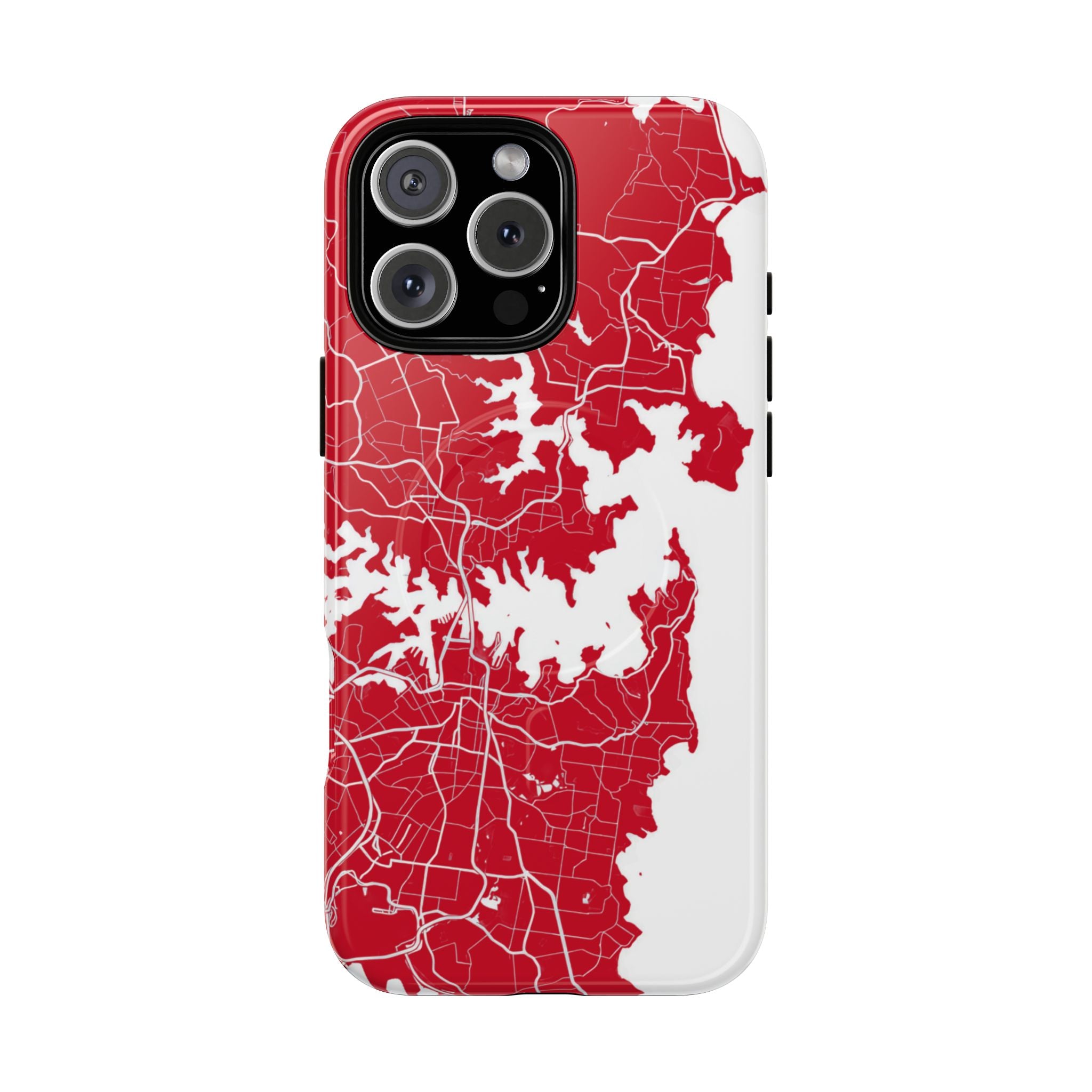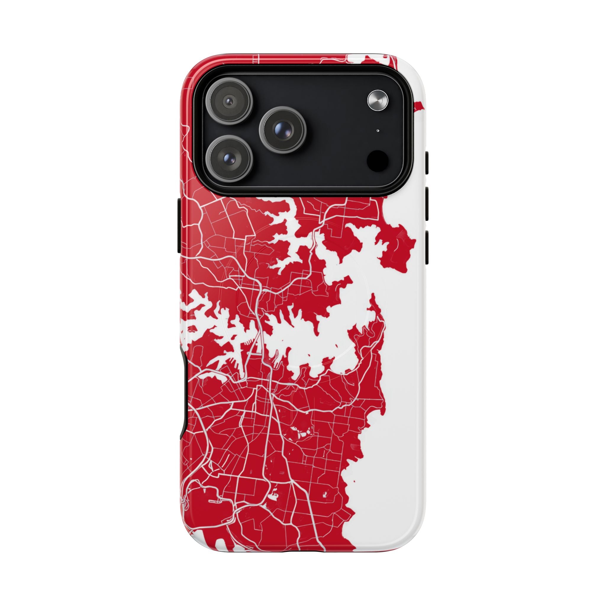 An embedded magnetic ring supports MagSafe® compatibility, allowing effortless attachment of chargers and magnetic accessories. Available in matte or glossy premium finishes, the Sydney Street Map Phone Case – Harbour Edition (Red) blends reliable durability with a bold, coastal-inspired aesthetic designed for everyday carry.