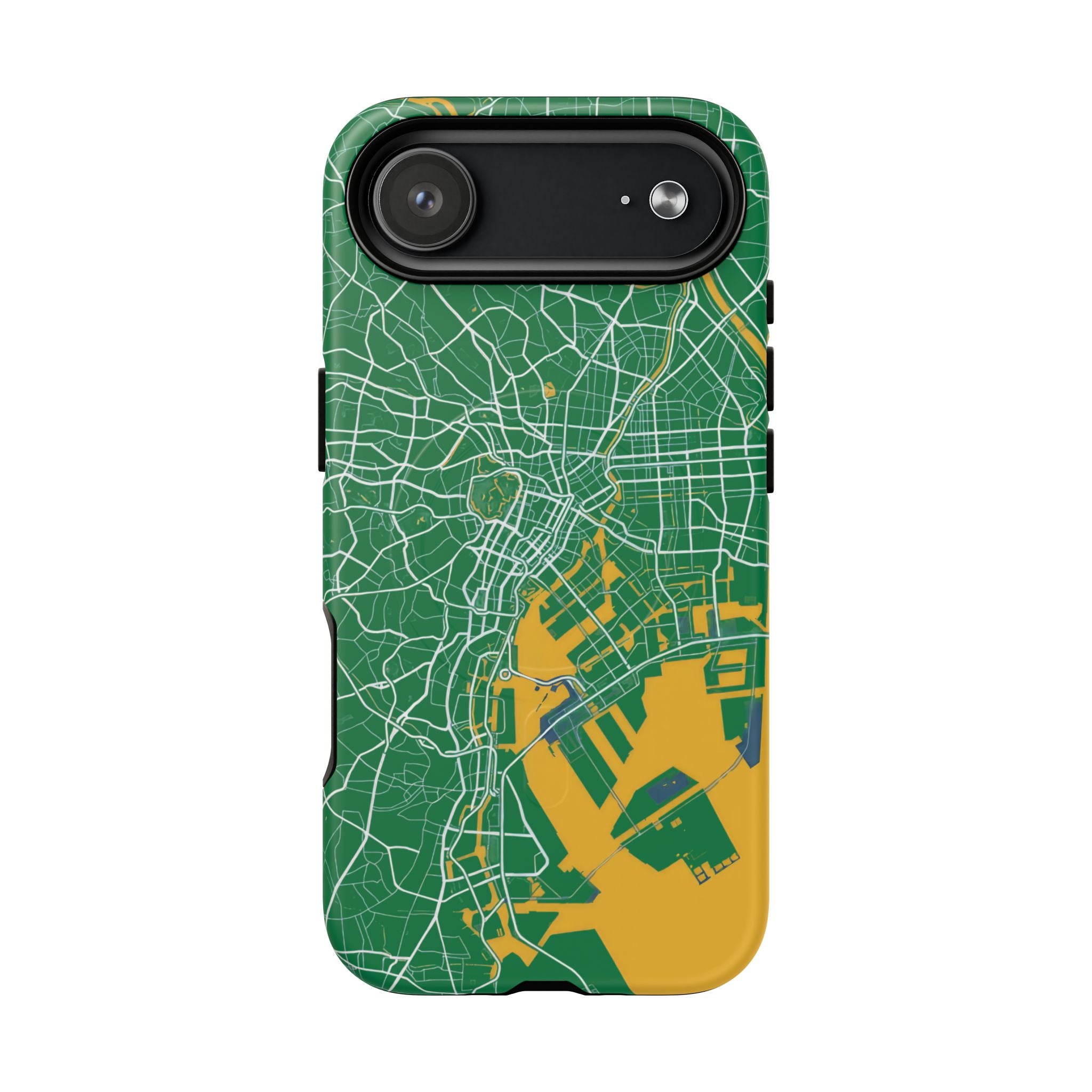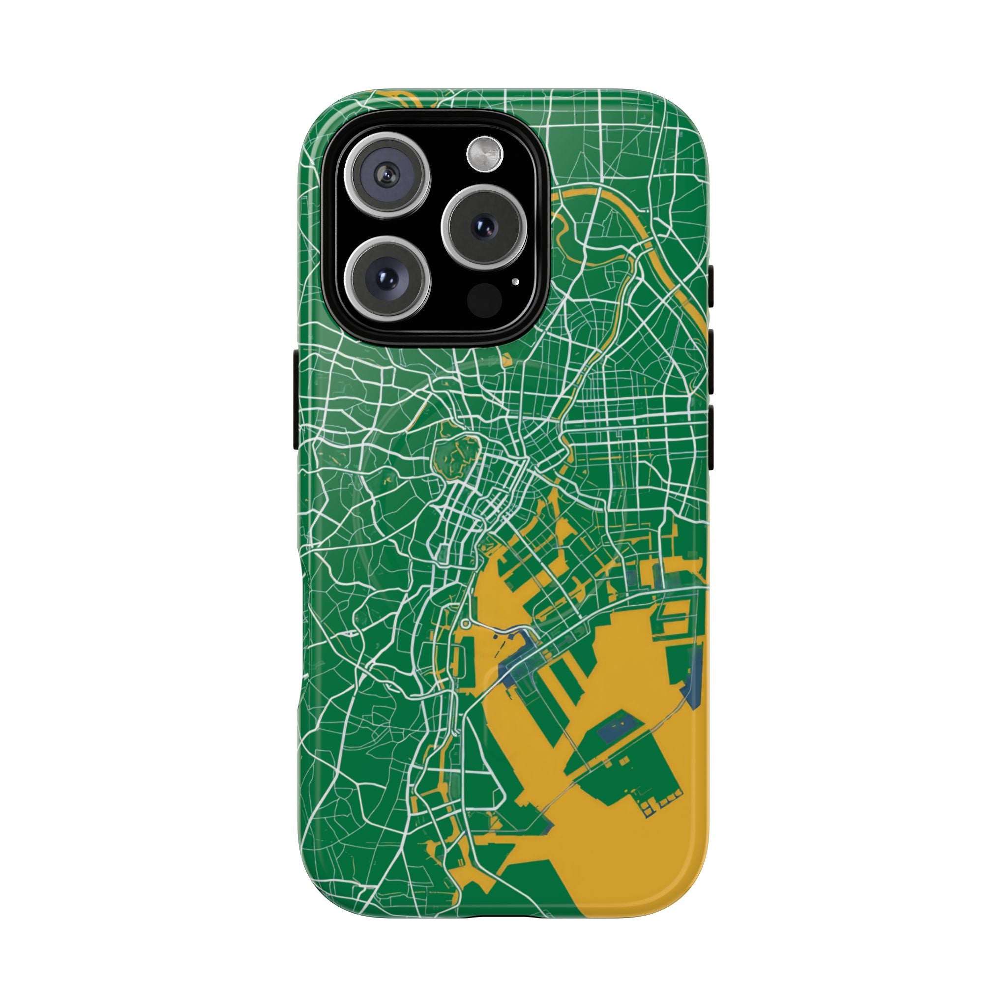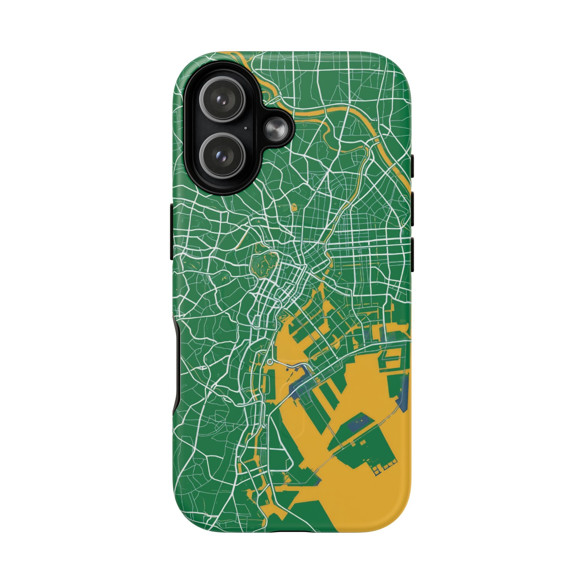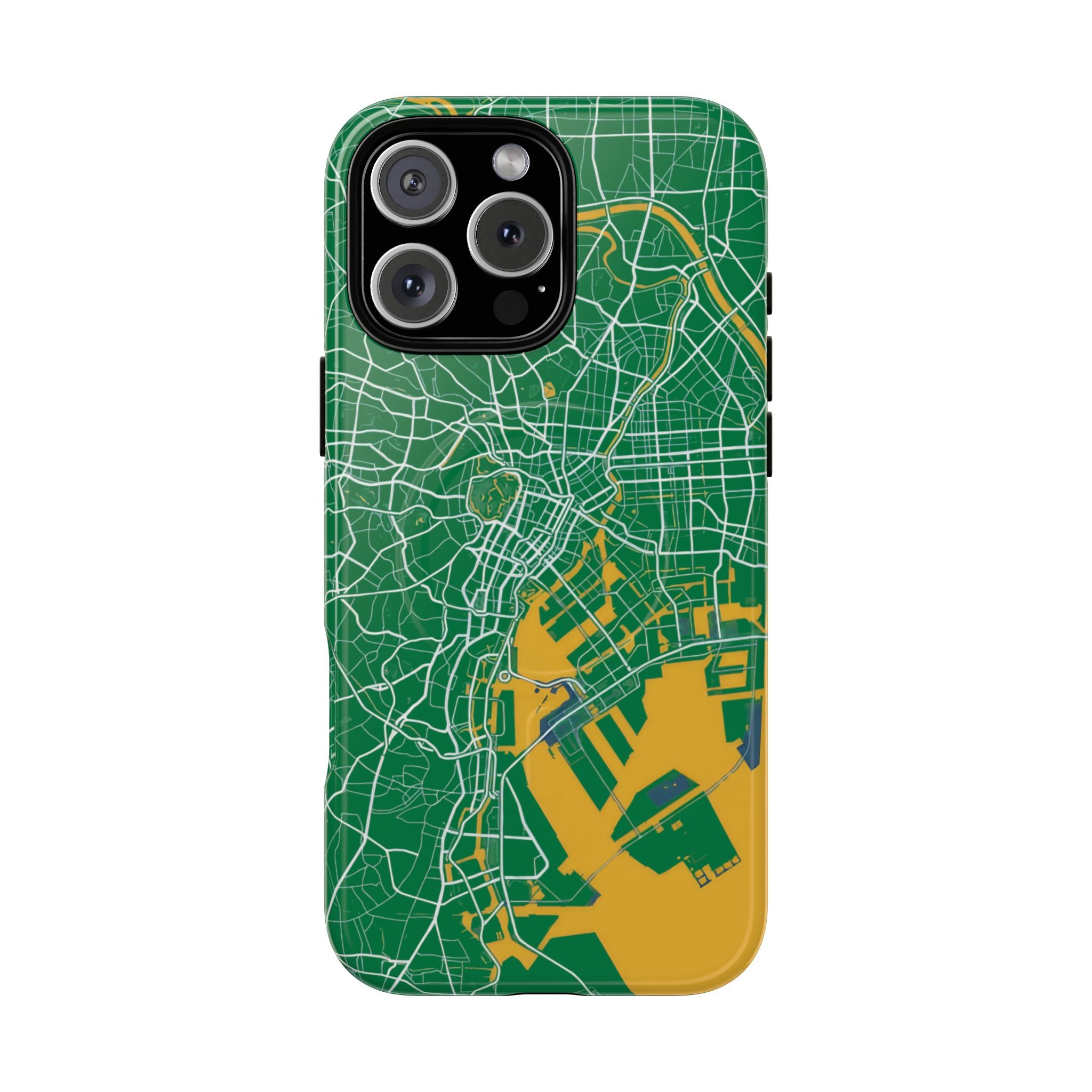 An embedded magnetic ring supports MagSafe® compatibility, allowing effortless attachment of chargers and magnetic accessories. Available in matte or glossy premium finishes, the Tokyo City Map Phone Case – Green & Yellow Edition blends reliable protection with a bold, design-led aesthetic built for everyday carry.
