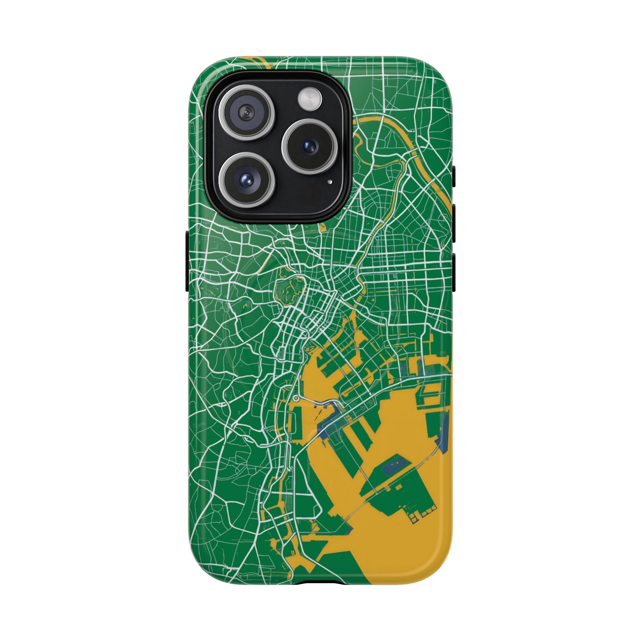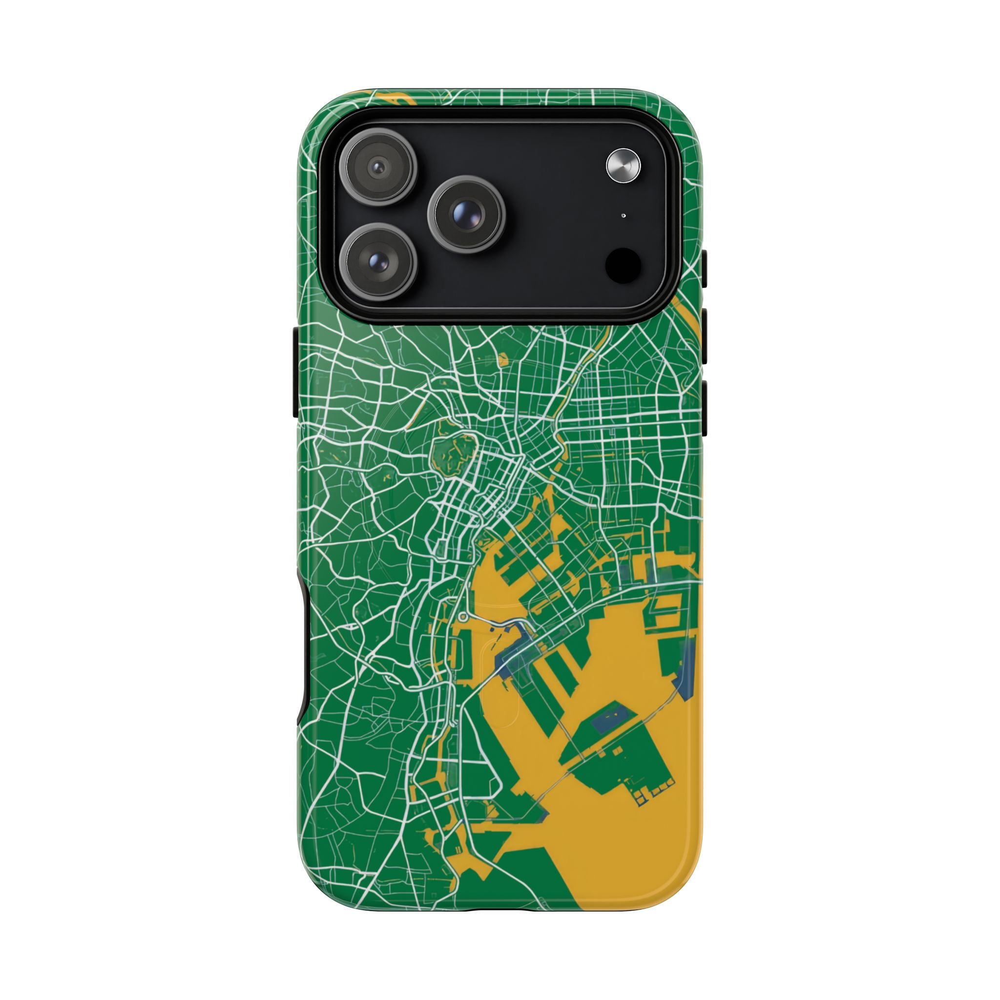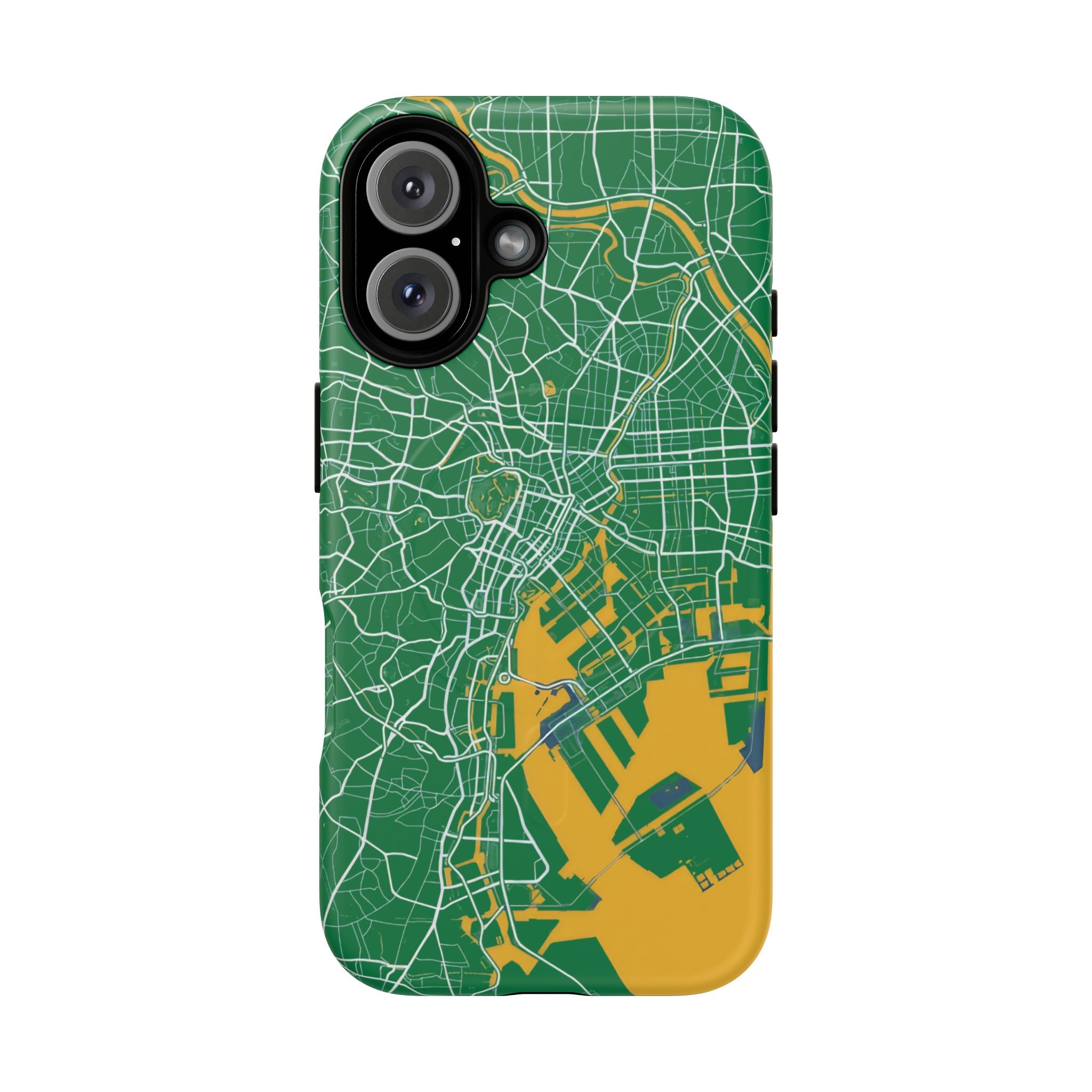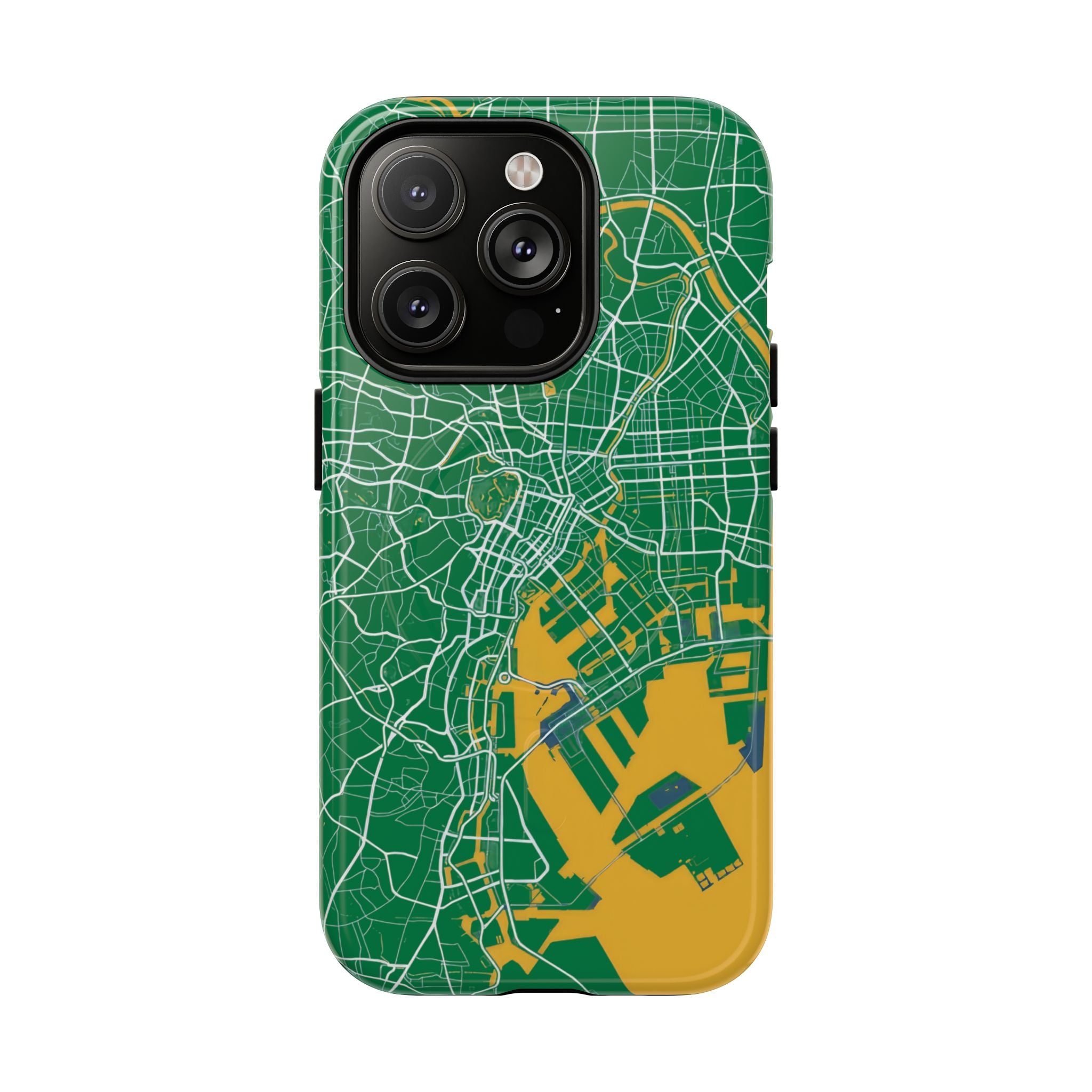 An embedded magnetic ring supports MagSafe® compatibility, allowing effortless attachment of chargers and magnetic accessories. Available in matte or glossy premium finishes, the Tokyo City Map Phone Case – Green & Yellow Edition blends reliable protection with a bold, design-led aesthetic built for everyday carry.