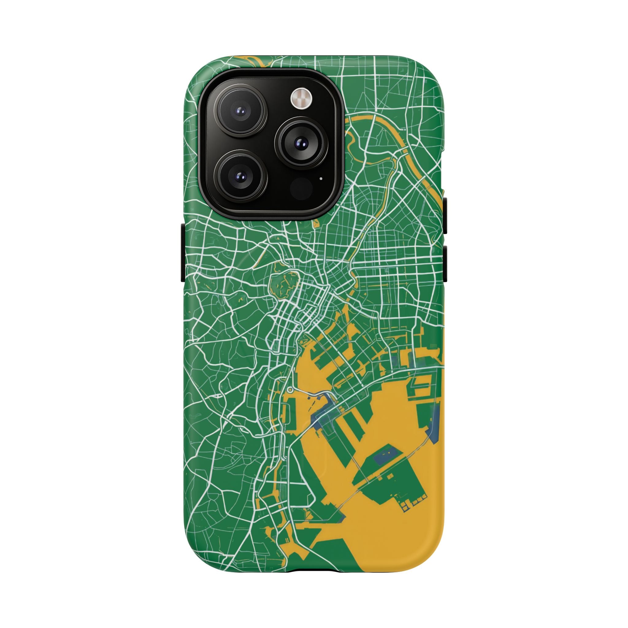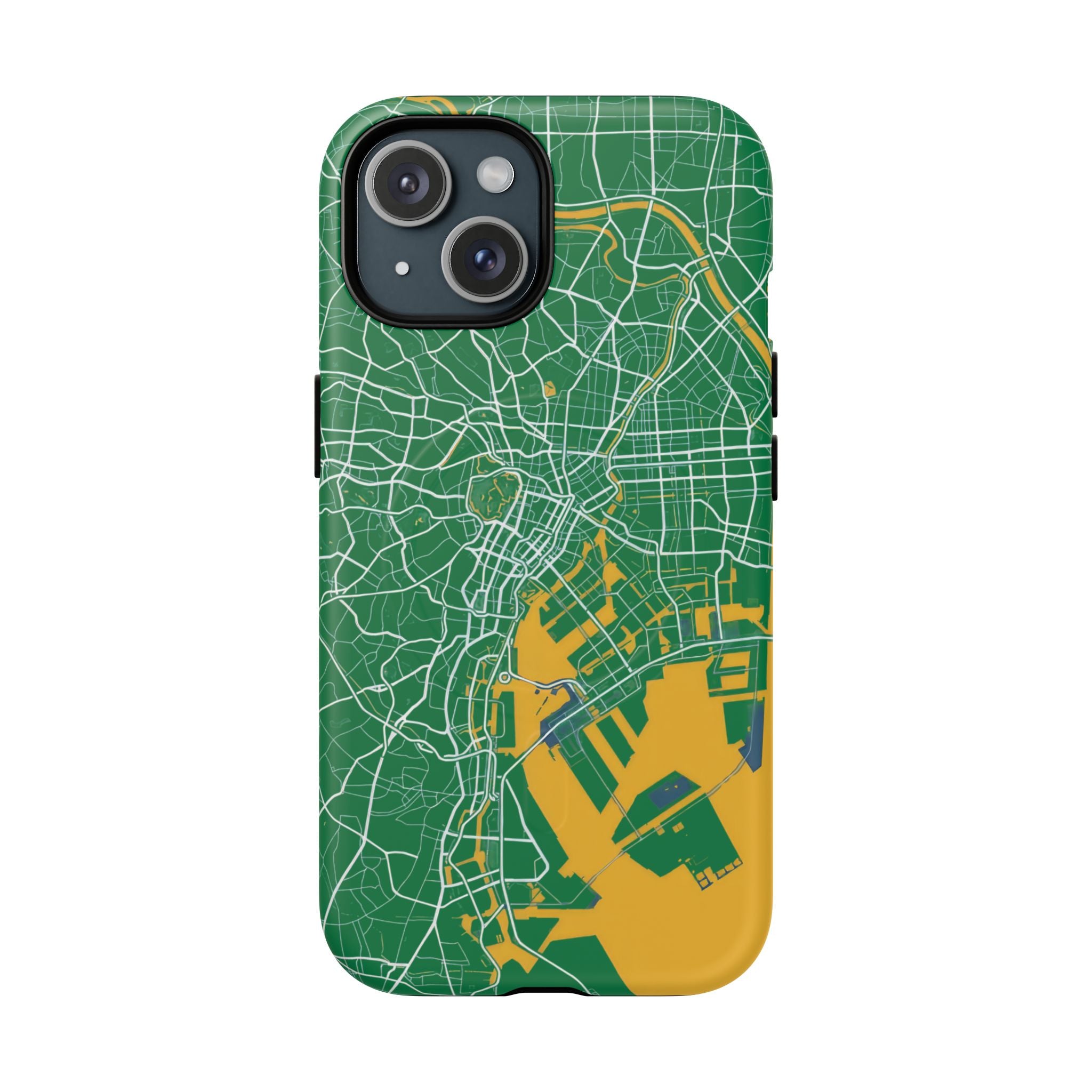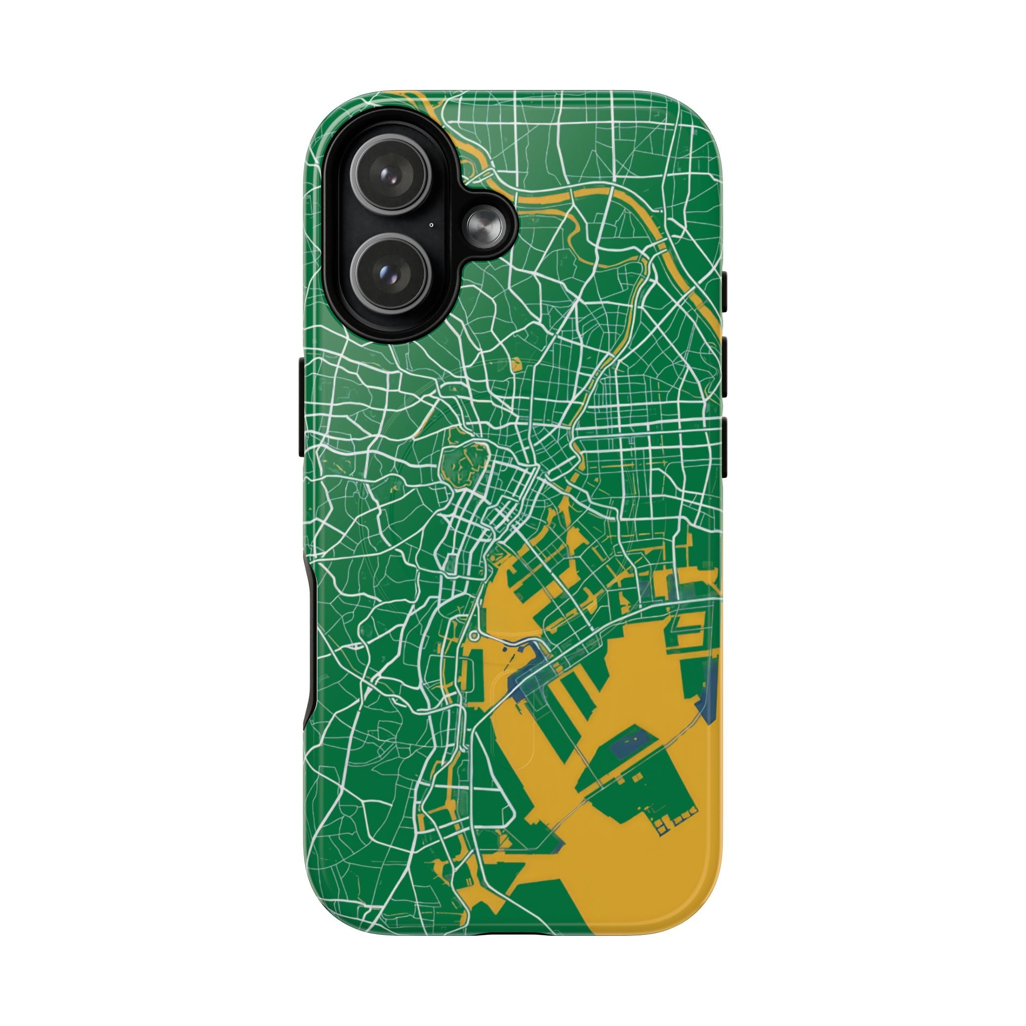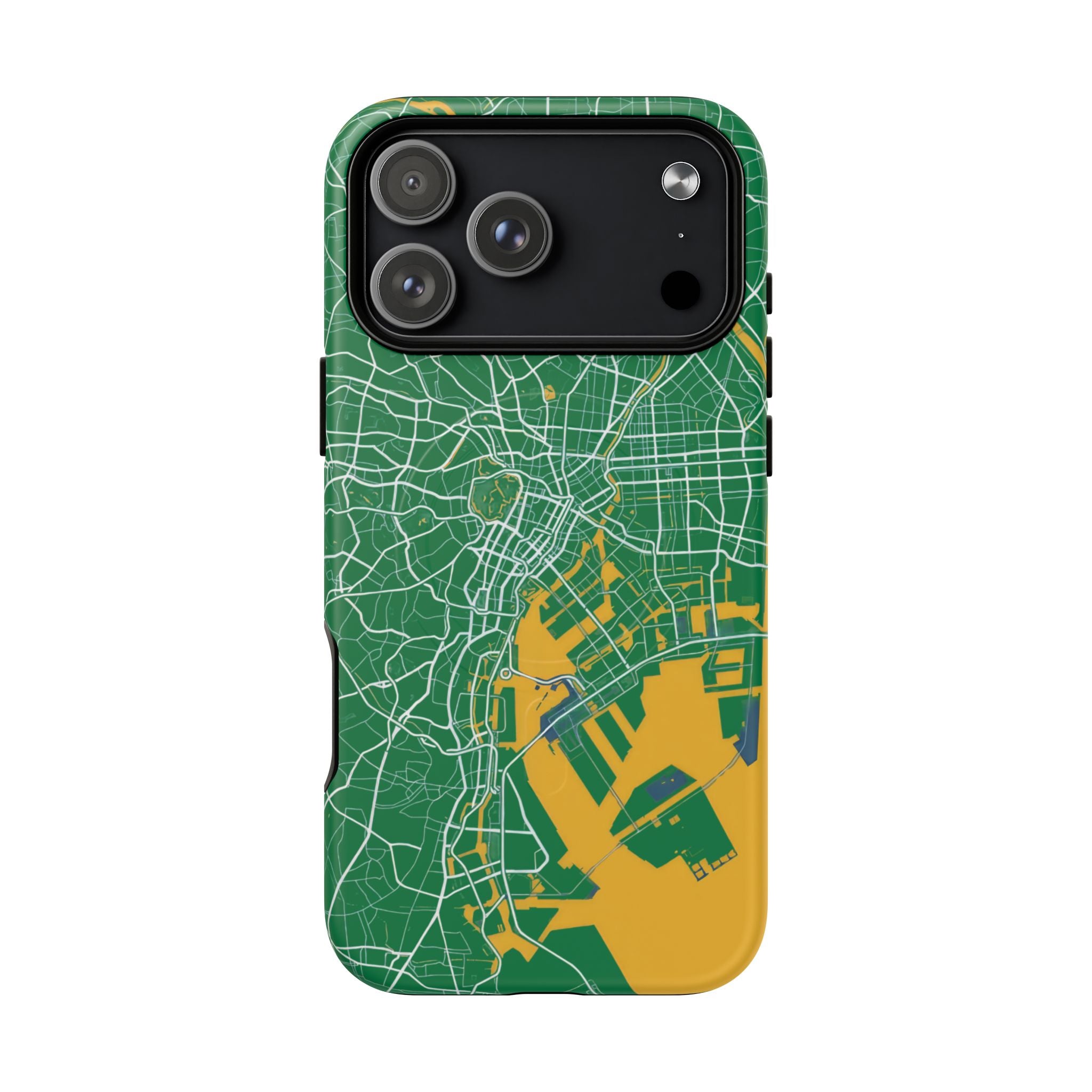 An embedded magnetic ring supports MagSafe® compatibility, allowing effortless attachment of chargers and magnetic accessories. Available in matte or glossy premium finishes, the Tokyo City Map Phone Case – Green & Yellow Edition blends reliable protection with a bold, design-led aesthetic built for everyday carry.
