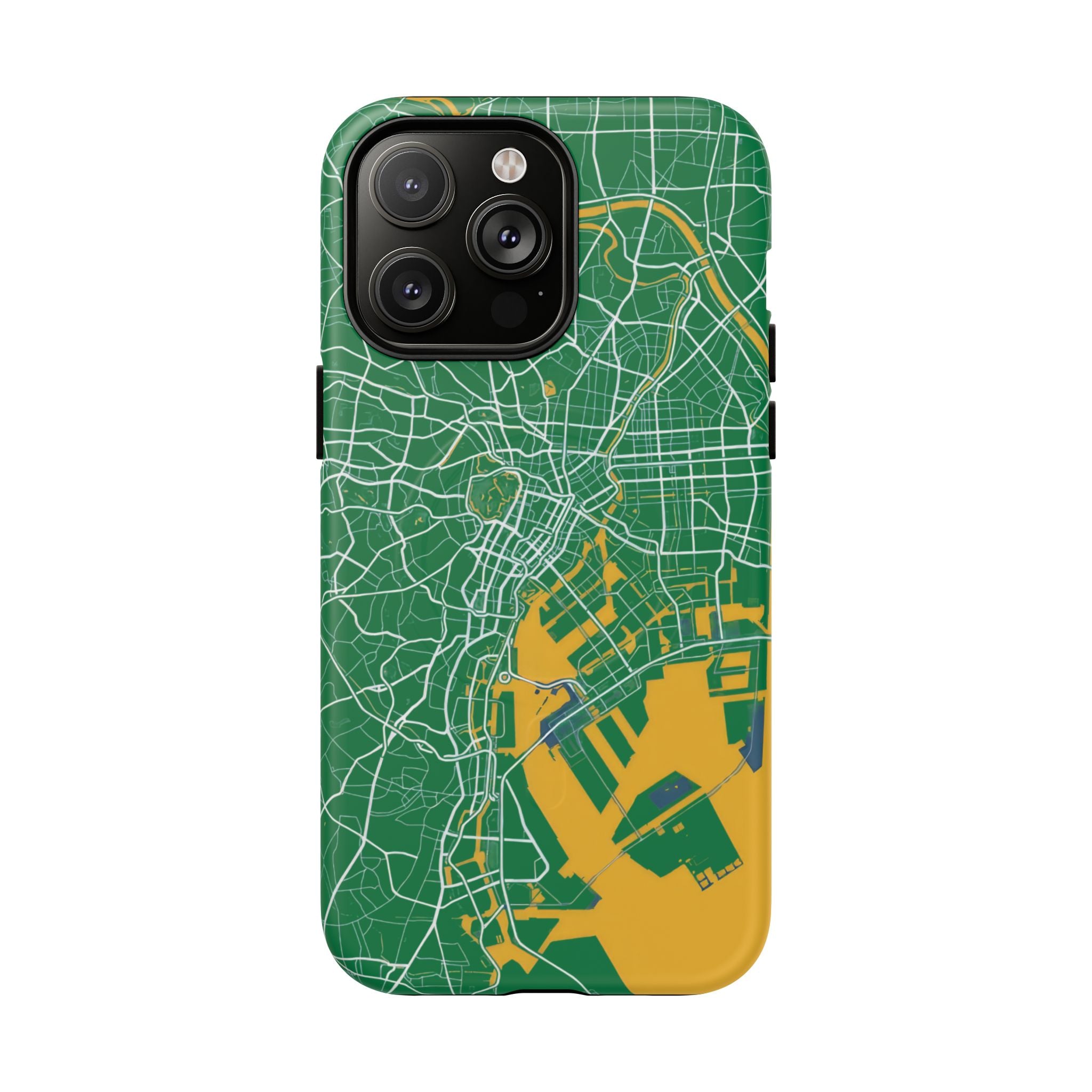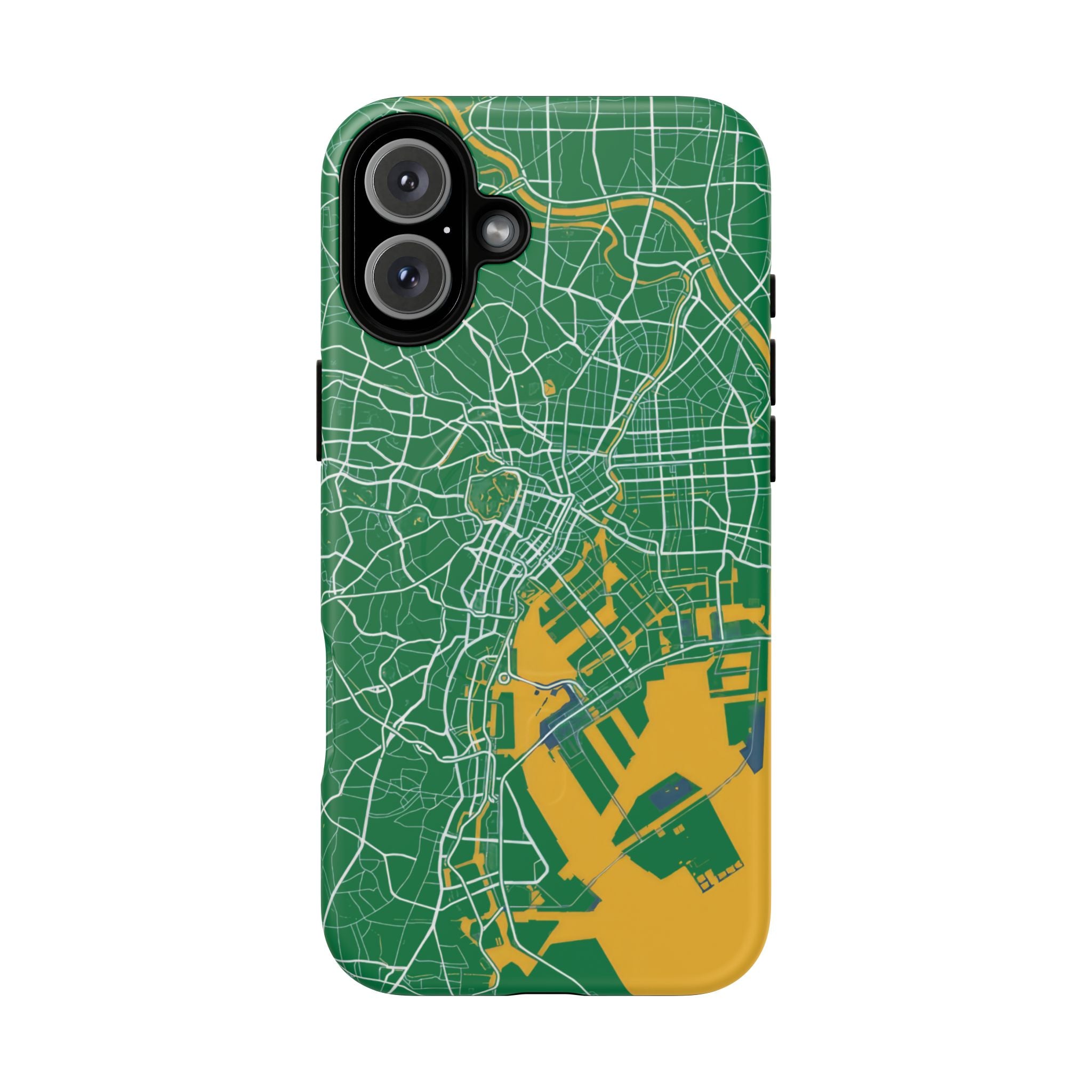 The Tokyo City Map Phone Case – Green & Yellow Edition reinterprets the city’s layered street network in a bold, graphic palette inspired by modern transit mapping. Set against a deep green backdrop, crisp white linework traces Tokyo’s intricate roads and districts, while vibrant yellow land and infrastructure blocks add contrast and structure to the composition.
